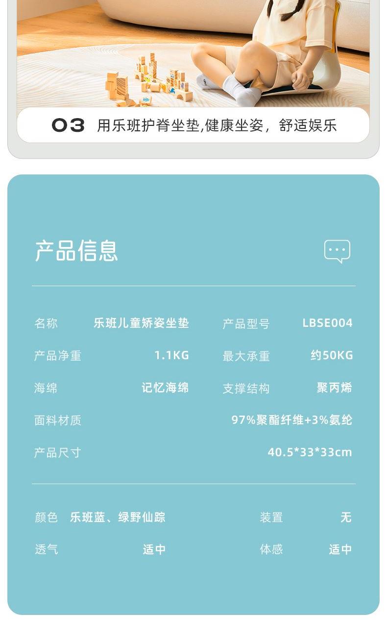 产品型号:乐班蓝LBSE004-ALBU 绿野仙踪LBSE004-ALYLGN 产品颜色:乐班蓝、绿野仙踪 产品净重:1.1KG 产品海绵:记忆海绵 面料材质:97%聚醋纤维+3%氨纶 产品尺寸:40.5*33*33cm 支撑结构:聚丙烯
