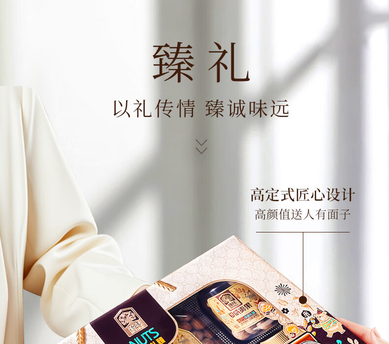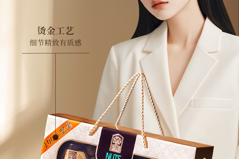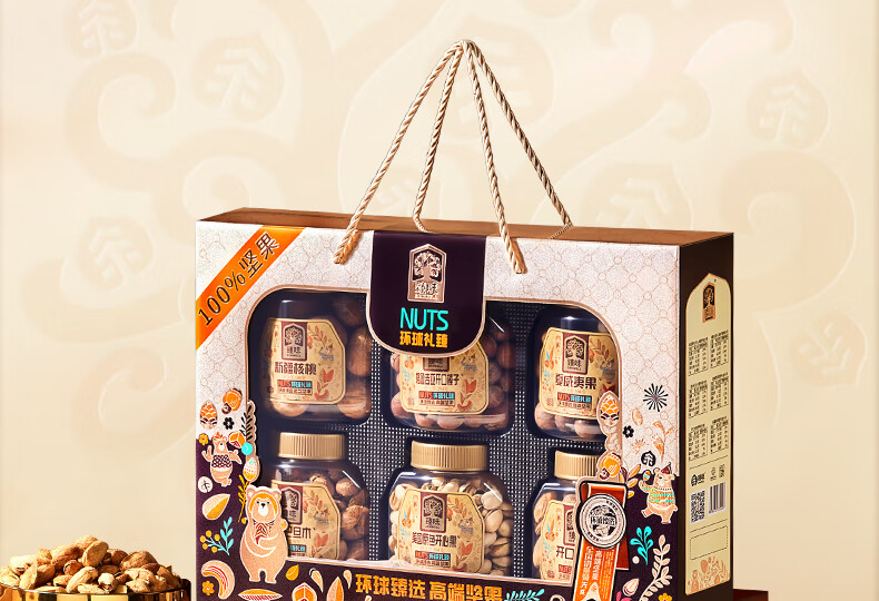 260g美国原色开心果 *1 250g格鲁吉亚开口榛子*1 230g澳洲巴旦木*1 300g夏威夷果*1 300g开口杏核*1 180g新疆核桃*1 环球礼臻,臻选全球每一颗果粒。礼盒采用传统金咖配色,烫金工艺配以反差的色彩元素 ,彰显时尚、典雅的风格、净含量:1520g,内配6种坚果,纯坚果礼盒;内配丰富齐全