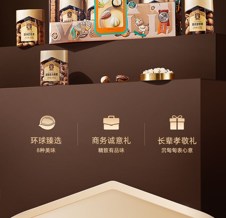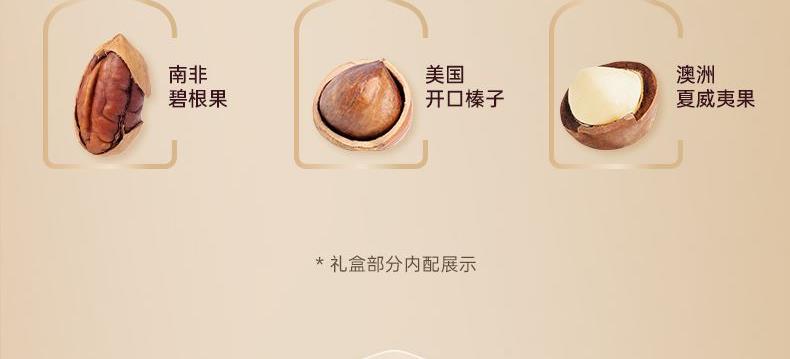 215g美国原色开心果*1 200g越南紫衣腰果*1 170g南非碧根果*1 165g澳洲巴旦木*1 205g美国开口榛子*1 255g澳洲夏威夷果*1 360g阿联酋椰枣*1 380g智利汤姆森提子干*1 提取宫廷建筑元素,象征东方美学的雅致,搭配开窗设 计,让品质坚果尽收眼底; 净含量:1950g,内含6种坚果、 2种果干,天赐“茗 ”果,馈 赠自用两相宜。