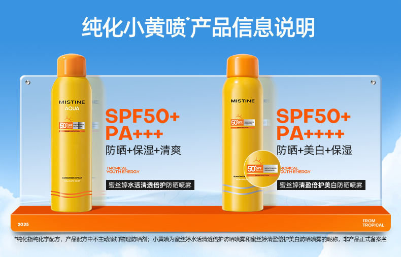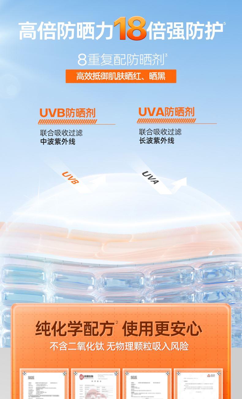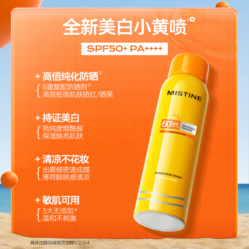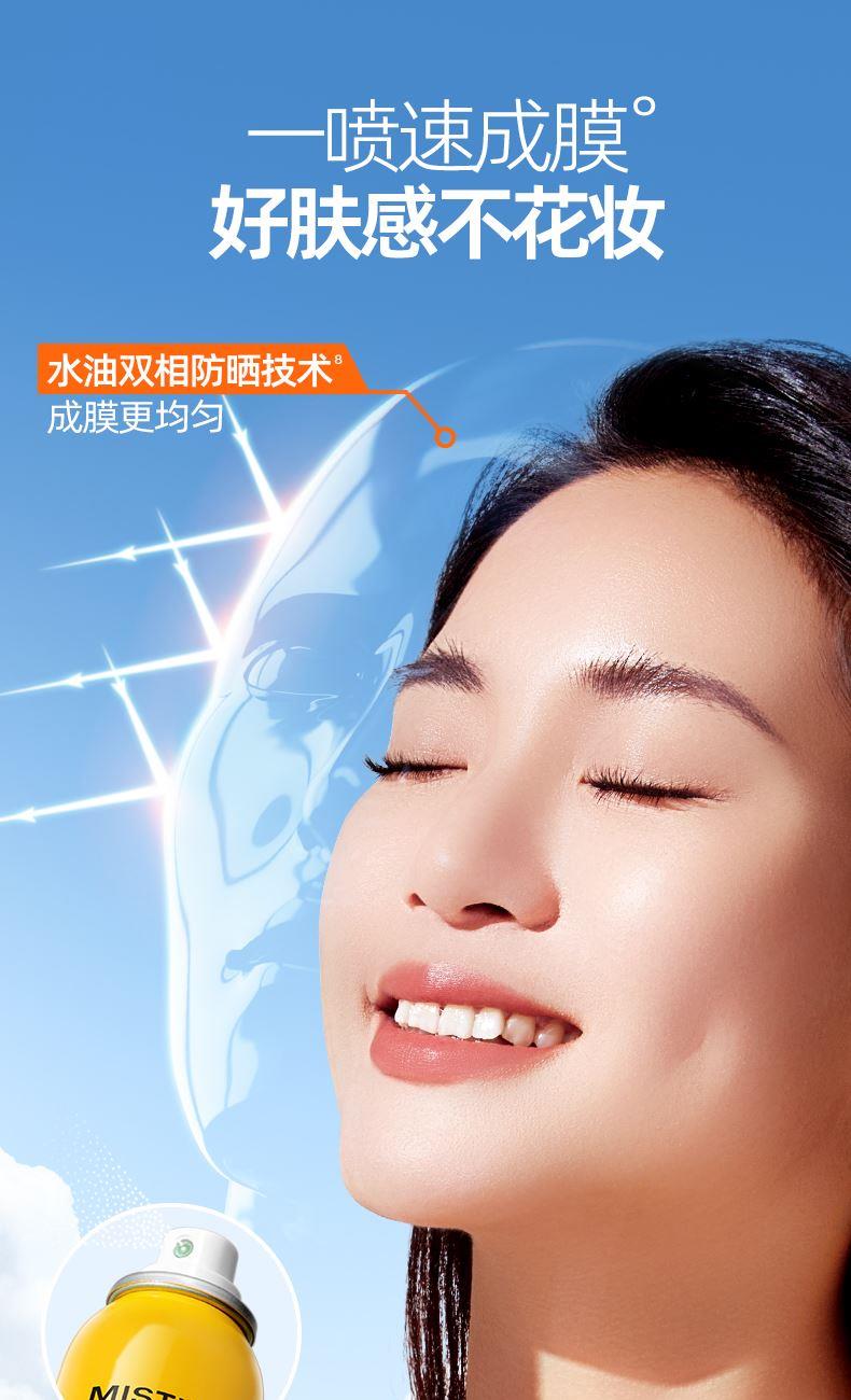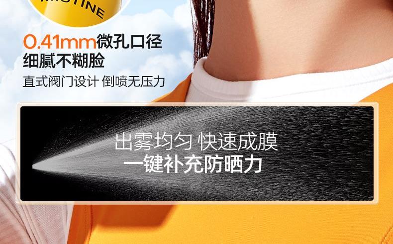 1.通勤户外强防护 看得到的防晒力 强防晒力, 多重硬核防护,SPF50+ PA++++,无惧晒黑晒伤晒老; 2.肤感清爽吸收快 一喷清凉 温和降温 清爽不粘腻,成膜吸收快 添加薄荷醇乳酸酯,温和降温畅享阳光 3.防晒同时兼顾美白,外防护、内焕亮 添加美白成分-烟酰胺 4.安全温和 敏肌可用 海洋友好 美修全绿,八大0添加,纯化学防晒,无忧吸入风险的安心配方; 5.保湿舒缓修护 拒绝高温泛红晒伤晒黑 添加保湿舒缓修护成分,晒不干、晒不伤;拒绝泛红敏感导致的皮肤损伤;