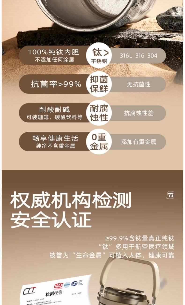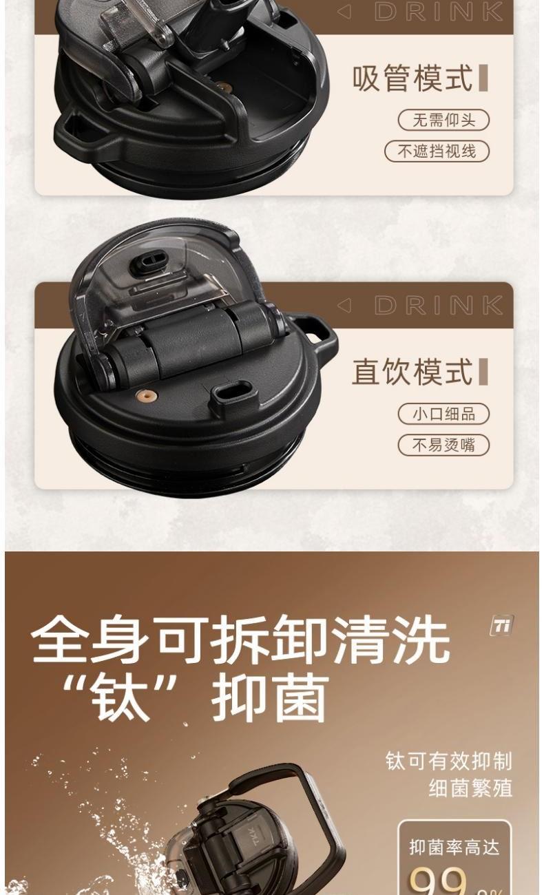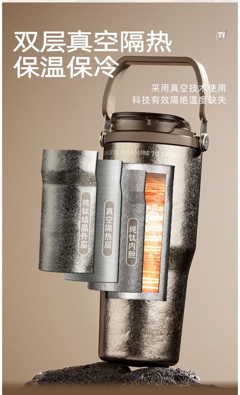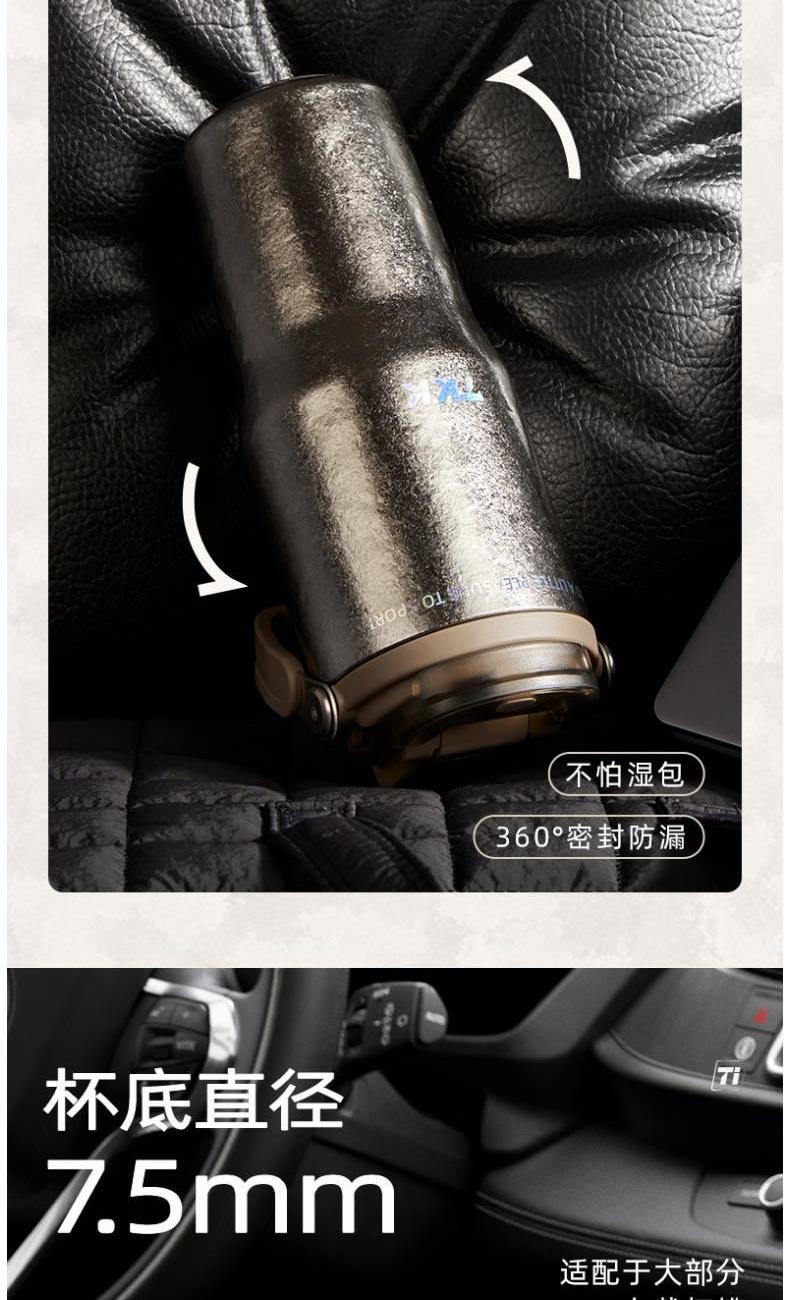 商品容量:700mL 杯身材质:钛 商品净重:387G 商品尺寸:9*22.2cm*7.5cm 1、 甄选轻量化黑科技钛,抗酸碱耐腐蚀,6小时长效保温保冷。 2、 一盖双饮,一杯双用,三种饮用模式:直饮,吸管,敞口随意切换 3、 食品级pp材质茶漏,食品级硅胶吸管,健康喝水 4、 便携车载,单手开盖,耐磨耐摔,倒置不漏。 5、 杯身便携可提手设计,轻松出门 6、 时尚配色设计,耐看,耐脏易清洗。 7、 硅胶杯底防滑垫,放置稳固。