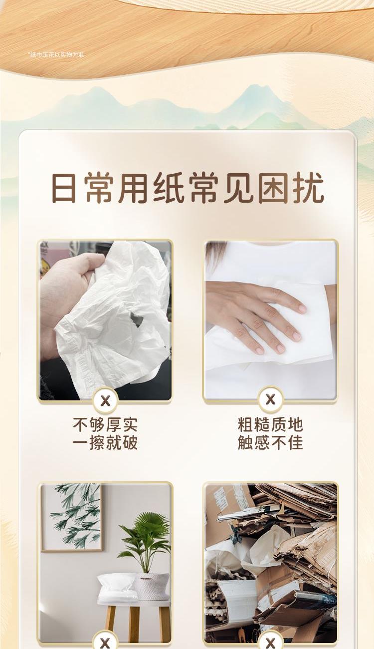 香型:无香 主要原料:原生木浆 保质期:3年 细腻好纸,7年相思木,1张细腻纸。 1.原生木浆 使用原生种植林原木生产的木浆,从源头保证绿色健康品项。全程严控更放心,不添加可迁移性荧光增白剂。 2.四层厚实,蓬松舒软 原生木浆好木出好纸,纸感细腻,棉柔亲肤。 3.湿水依旧强韧 湿水不易破,吸水力UP,多场景安心使用。 4.纤维交织紧密 长短纤维交织工艺,黄金配比,成就柔韧细腻,不掉屑、不分层,自然亲肤,品质呵护。 清风 隶属于金光集团APP,实力拥有“林浆纸一体”产业链,“种6棵,用1棵”,在国内自有林场地面积超过27万公顷,碳储量4239万吨。