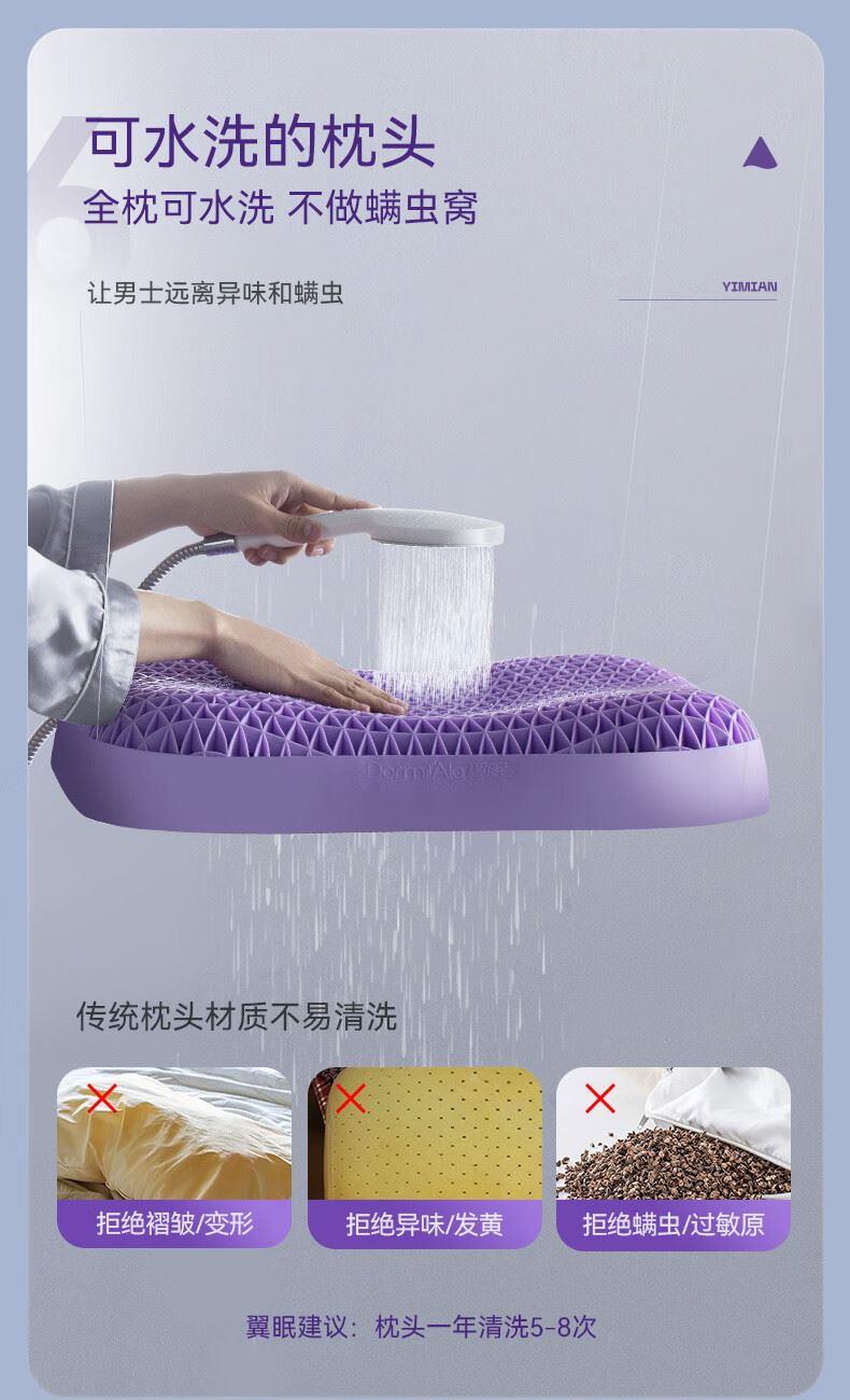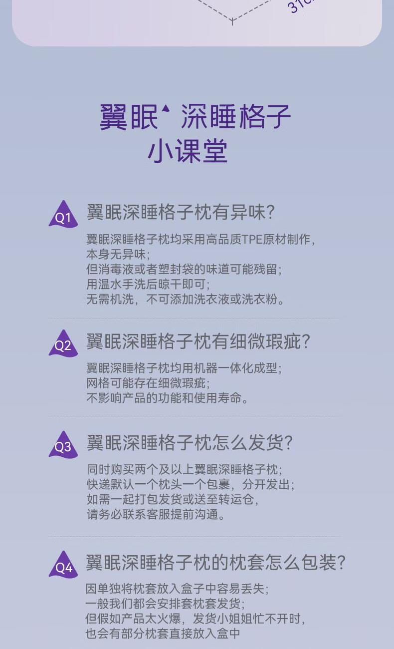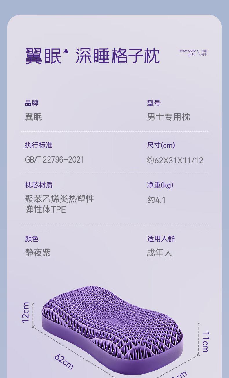 产品尺寸:62*31*12cm 重量约:4.1kg 颜色:富贵紫,雅致灰 适用人群:宽肩背后的成年人 产品包含:枕套*1 科学分区,怎么睡都舒服, 高弹复合材料TPE,亲肤, 造型符合人体工学,可水洗, 持久使用,透气,不变形, 安全环保无毒