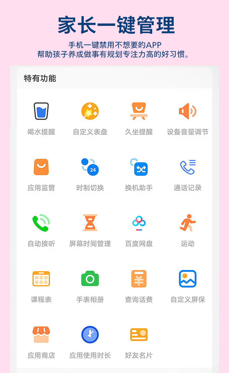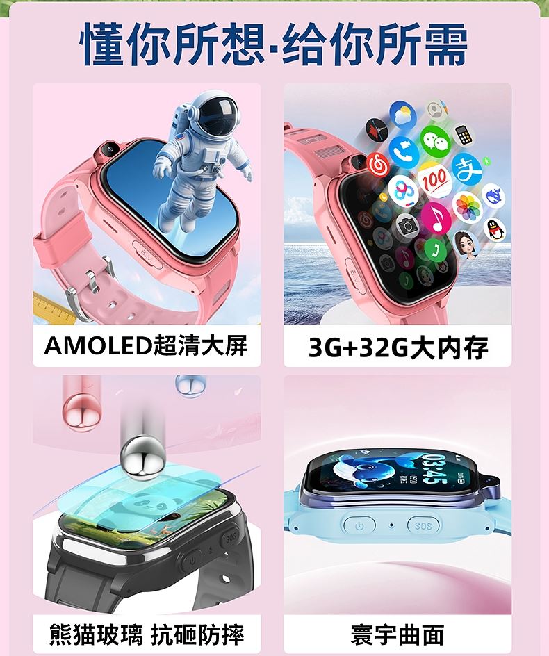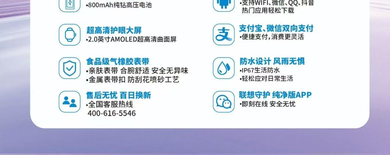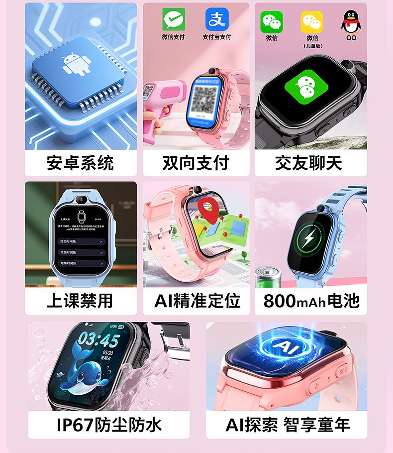 屏幕尺寸:2.0英寸AMLOED熊猫玻璃 240*284 使用时间:1-3天 充电方式:磁吸充电 电池容量:800mAh APP:联享守护 防水等级:IP67 像素:前置摄像头8万像素 内存:3+32G 产品清单:手表+充电线+说明书+包装盒 AMLOED超清大屏熊猫玻璃、抗砸防摔、寰宇曲面,3G+32G大内存,旗舰安卓系统,软件随心下,海量学习内容,流畅使用,自由装卸,微信/支付宝双向支付,微信/QQ/儿童版微信交友聊天,上课禁用,AI探索(deepseek/豆包/小度),智享童年,AI智能定位(支持GPS+北斗+WIFI+LBS等定位);喝水提醒,就做提醒,时制切换,百度网盘,课程表,手表相册,自定义屏保,应用商店,好友名片,拒接陌生来电,代收手表短信,终端WIFI,S0S/亲情号码、4G视频通话;