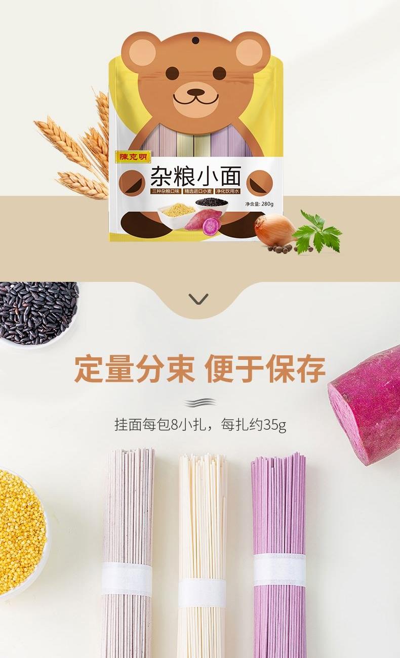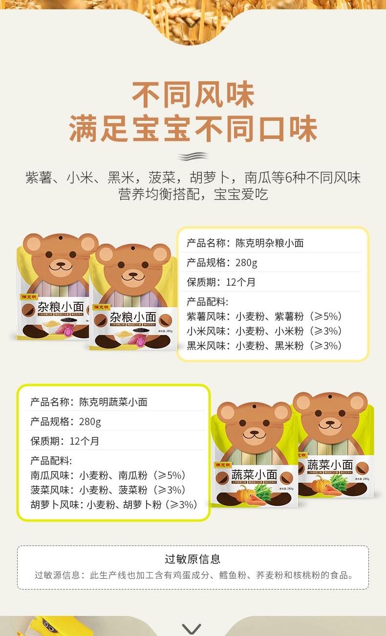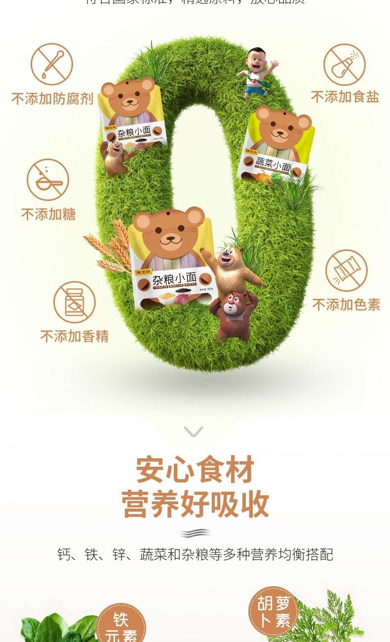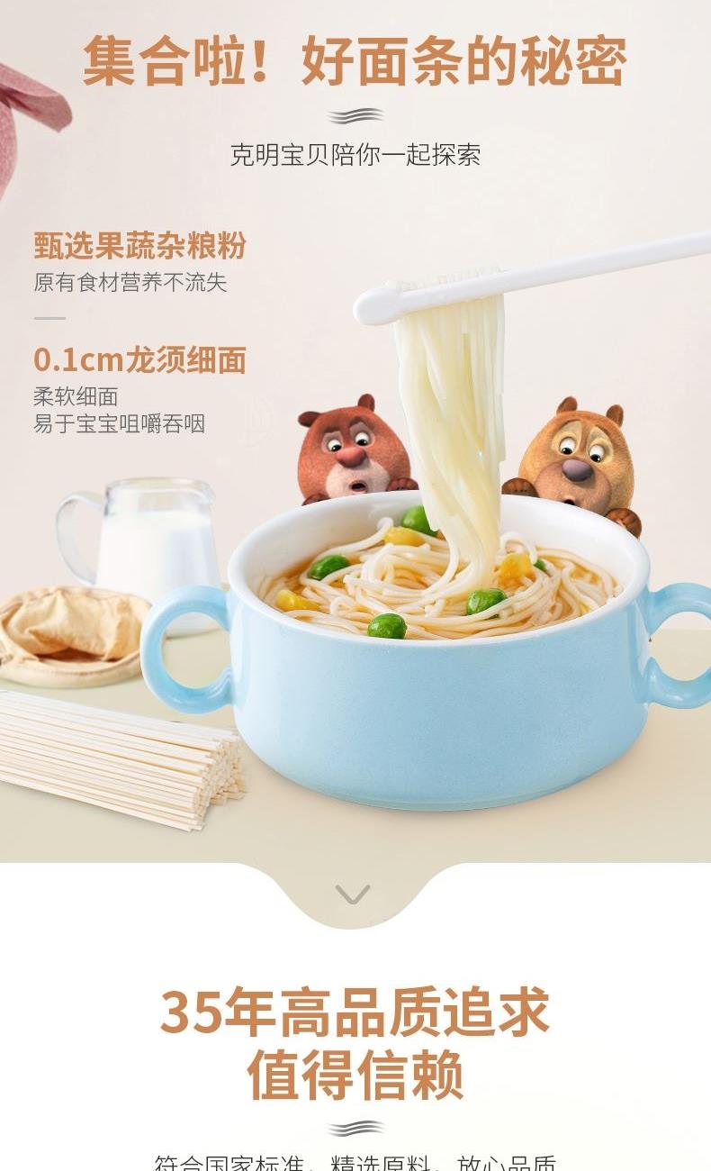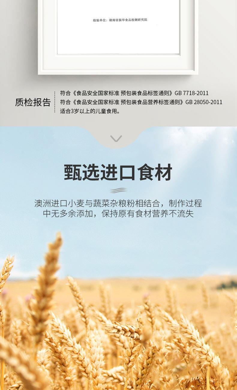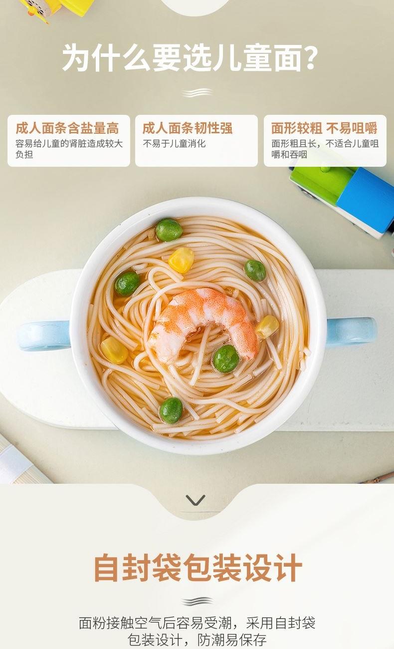 产品规格: 280g*2包 1、精选澳大利亚高蛋白小麦,面条细腻柔软, 无污染无农药残留; 2、添加高品质蔬菜粉和杂粮粉,呈现天然食材色泽,适 合挑食厌食、日常较少食用杂粮的宝宝 3、面体为1mm龙须细面,煮熟后滑嫩好嚼易消化; 4、不添加任何色素、食用盐、防腐剂,更安全,妈妈 更放心。