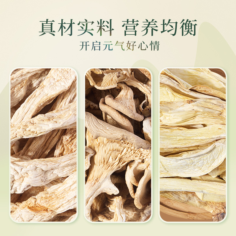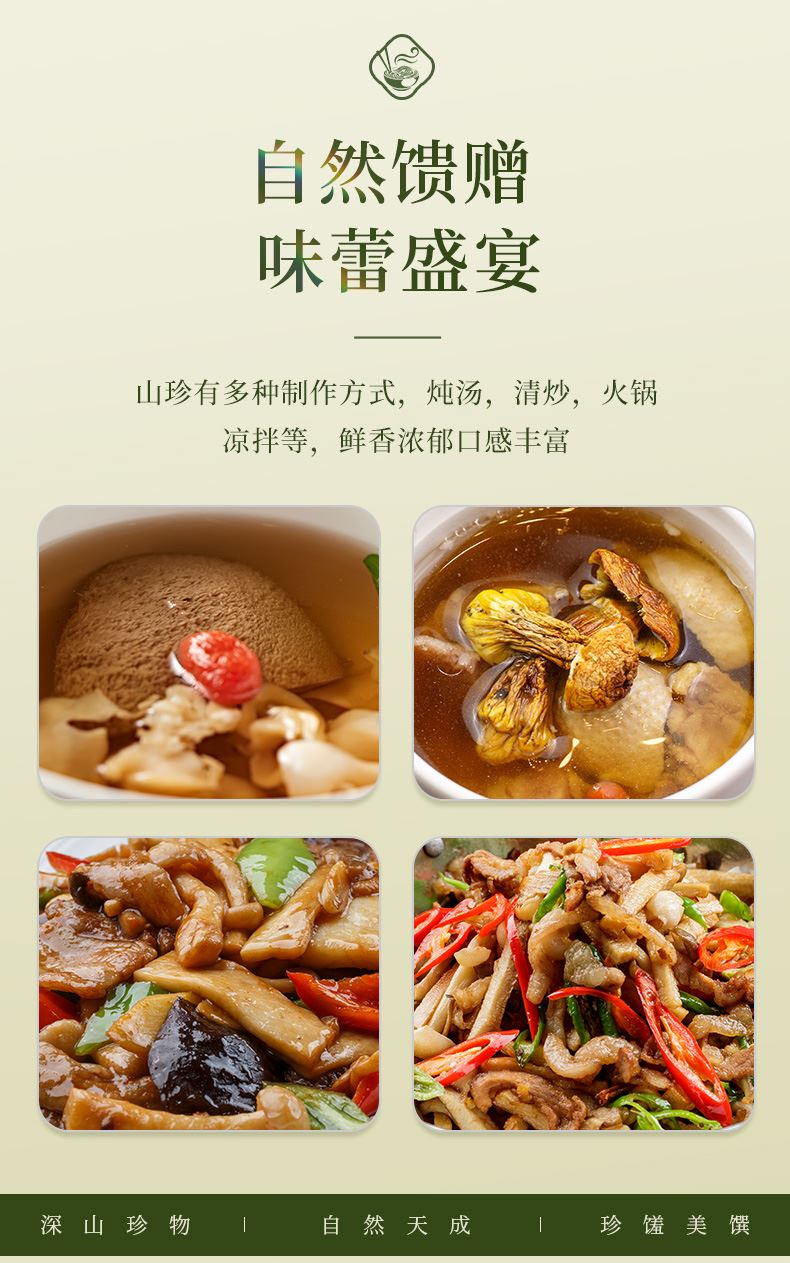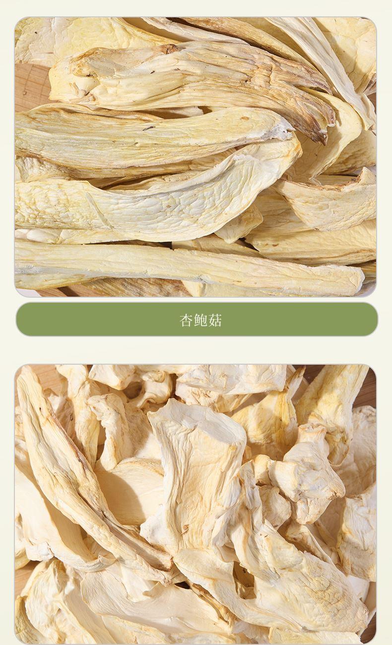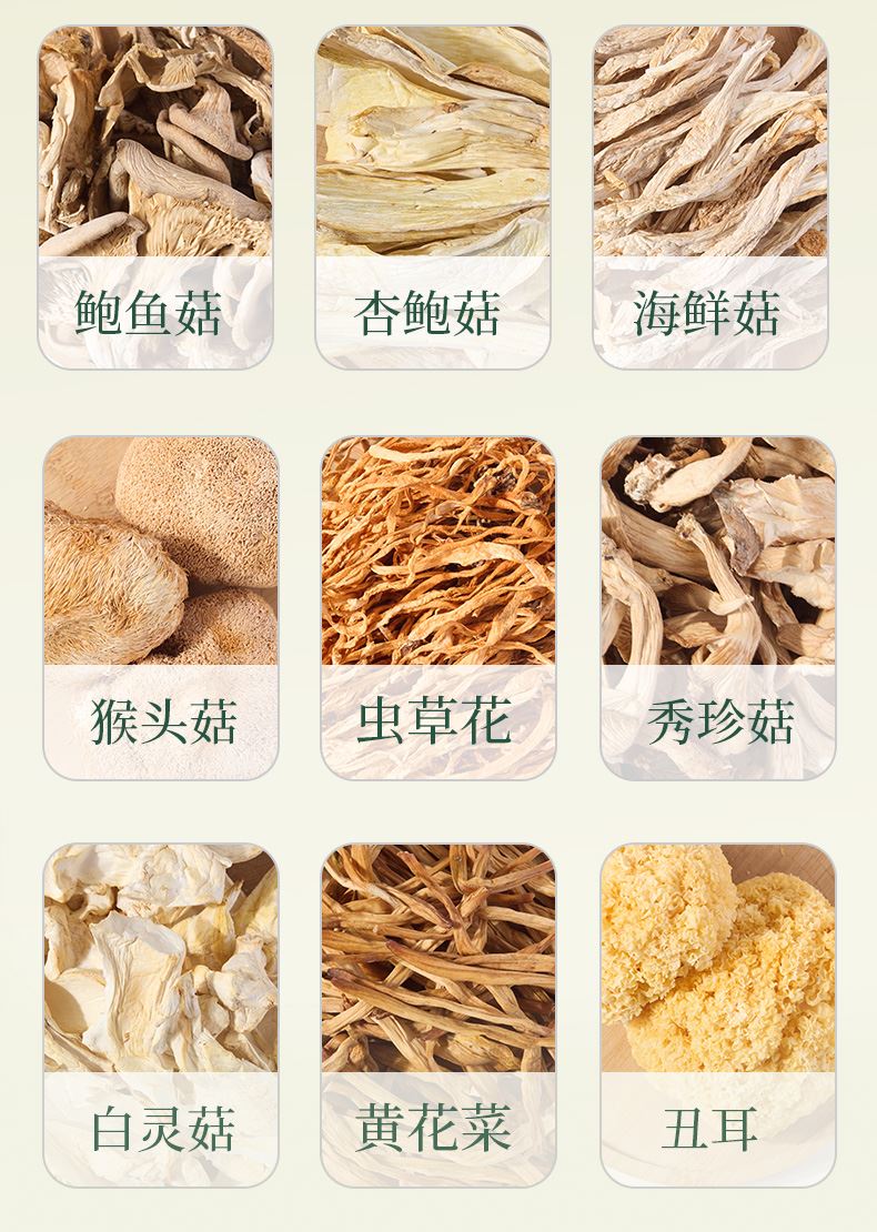 杏鲍菇100g 海鲜菇100g 虫草花90g 丑耳60g 鲍鱼菇100g 猴头菇100g 红枣350g 黄花菜100g 秀珍菇100g 白灵菇100g