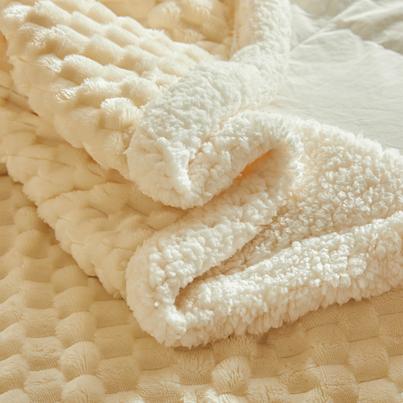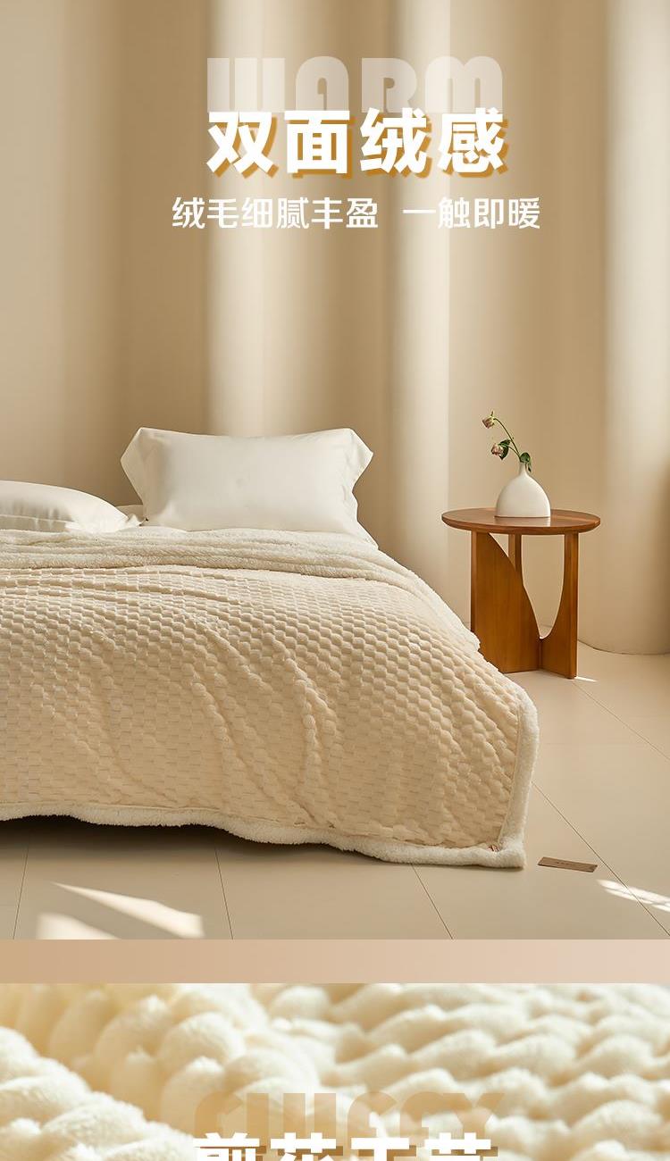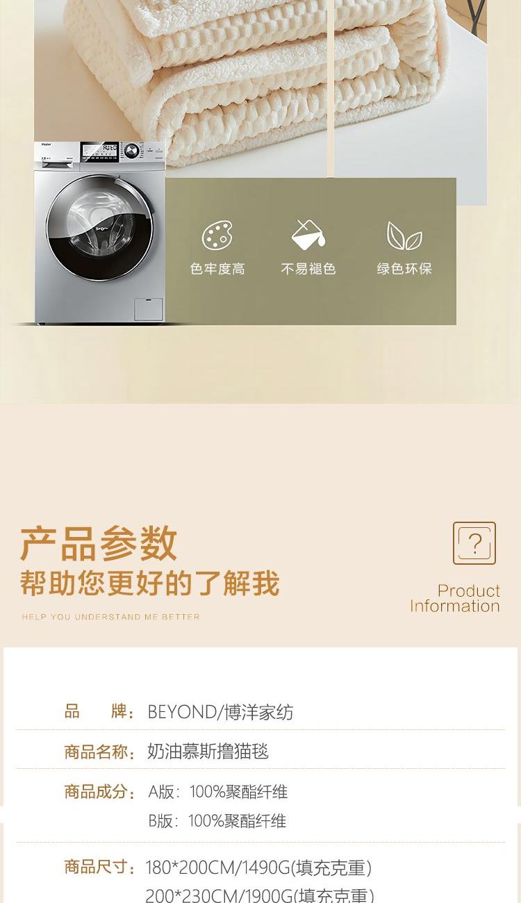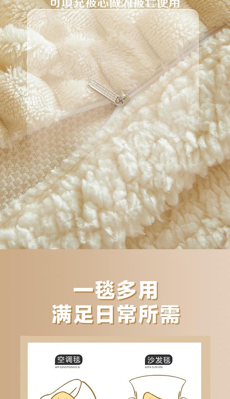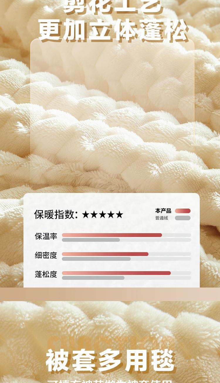 产品规格:180*200cm/1490g 200*230cm/1900g 产品材质:聚酯纤维 1、软乎乎菠萝绒材质,剪花工艺使毯面更立体蓬松。 2、产品可机洗水洗,色牢度高,久洗如新不掉毛。 3、本品为被套多用毯,产品底部装有拉链,可填充被芯做为被套使用。更可做空调毯,休闲毯,旅行毯,床单,午休毯等。