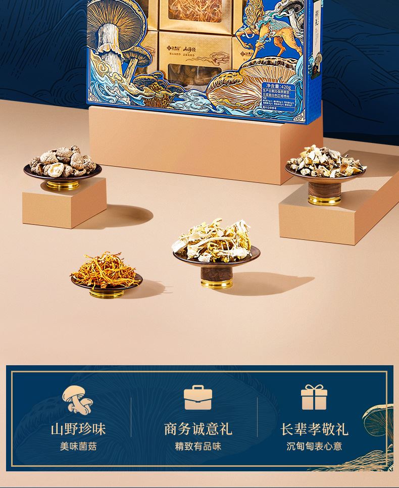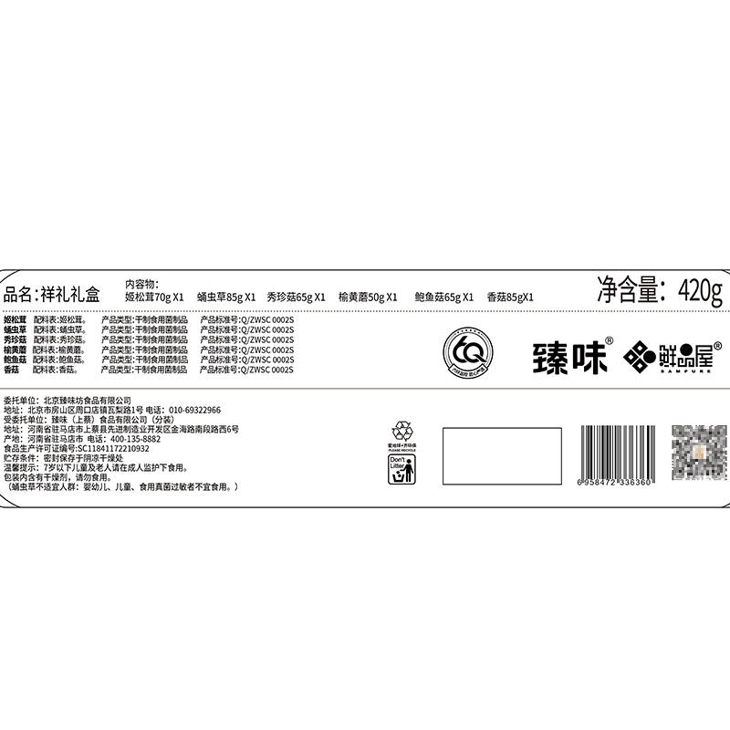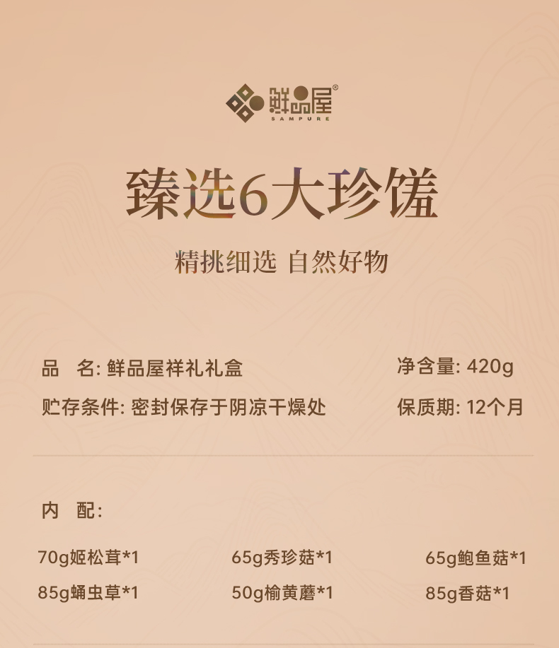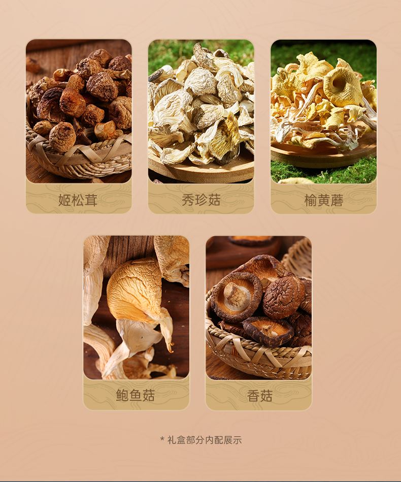 70g姬松茸*1 85g蛹虫草*1 65g秀珍菇*1 50g榆黄蘑*1 65g鲍鱼菇*1 85g香菇*1