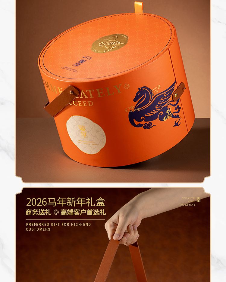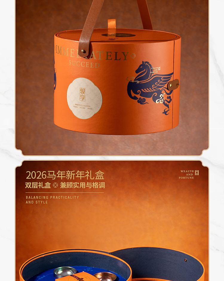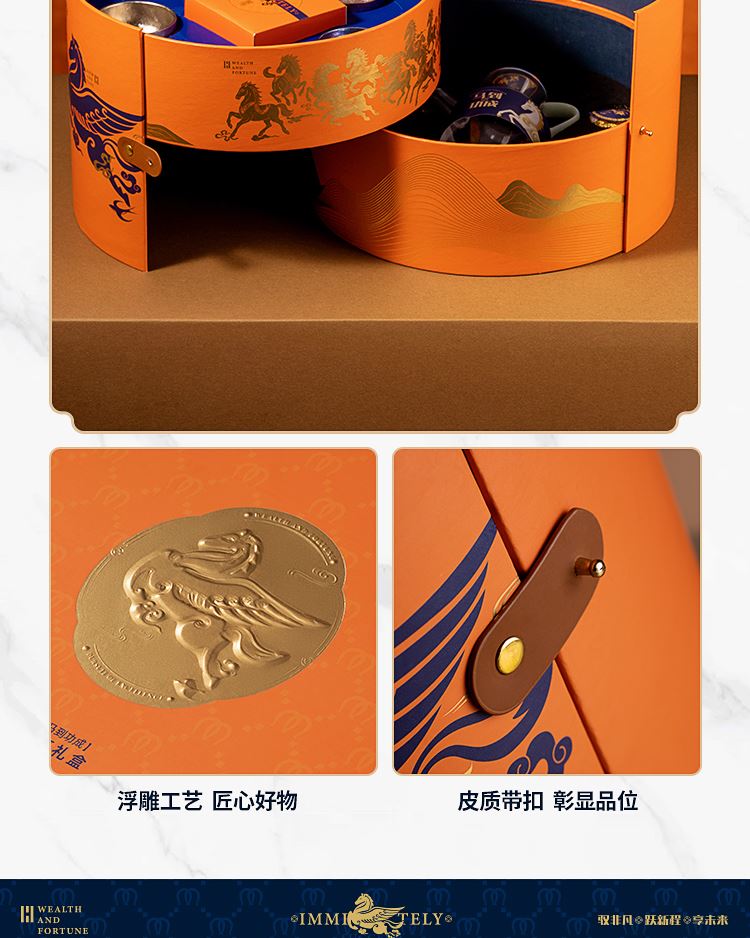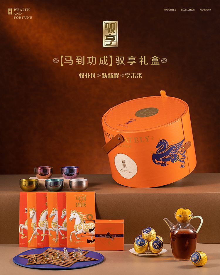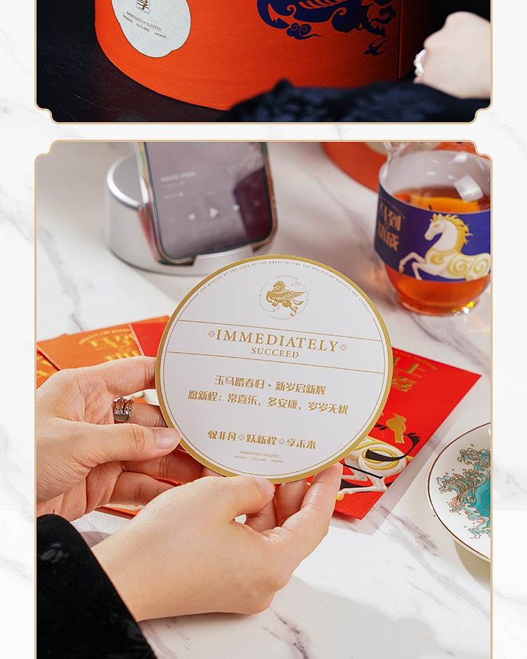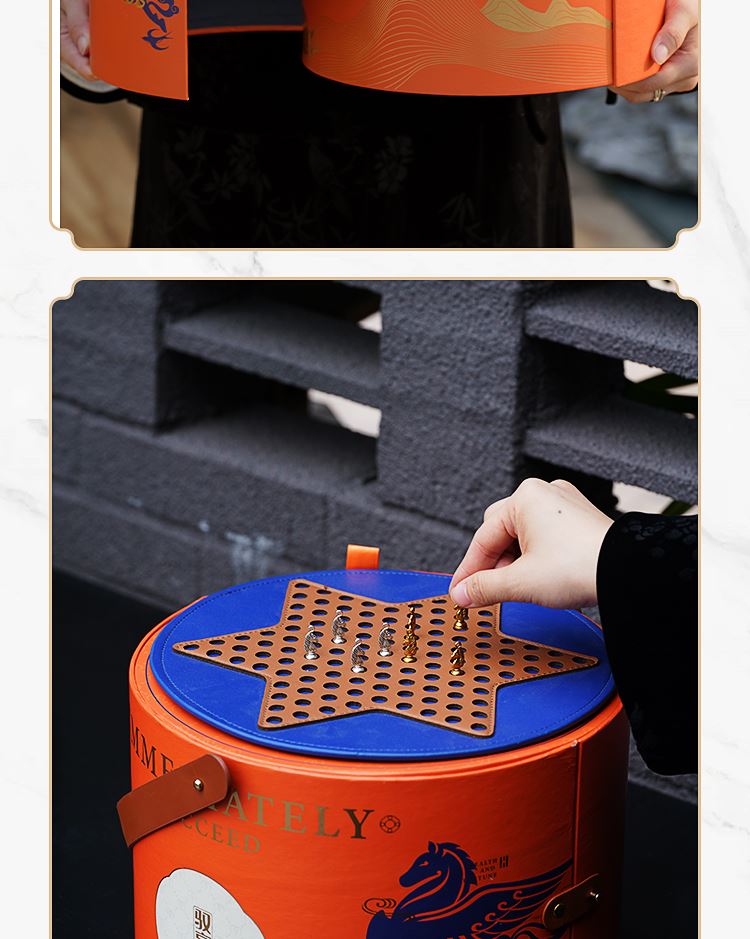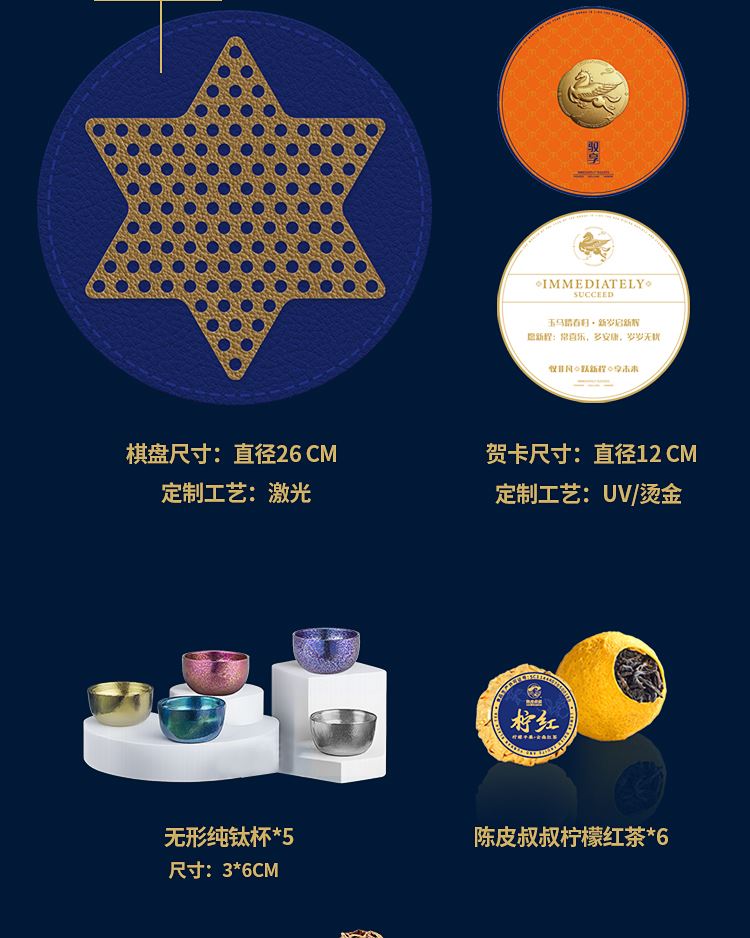 礼品配置清单: 双层主题礼盒、团圆皮革棋盘、马头棋子、五行钛杯*5、柠檬红茶*6、复古玻璃泡茶壶、新年红包*6、