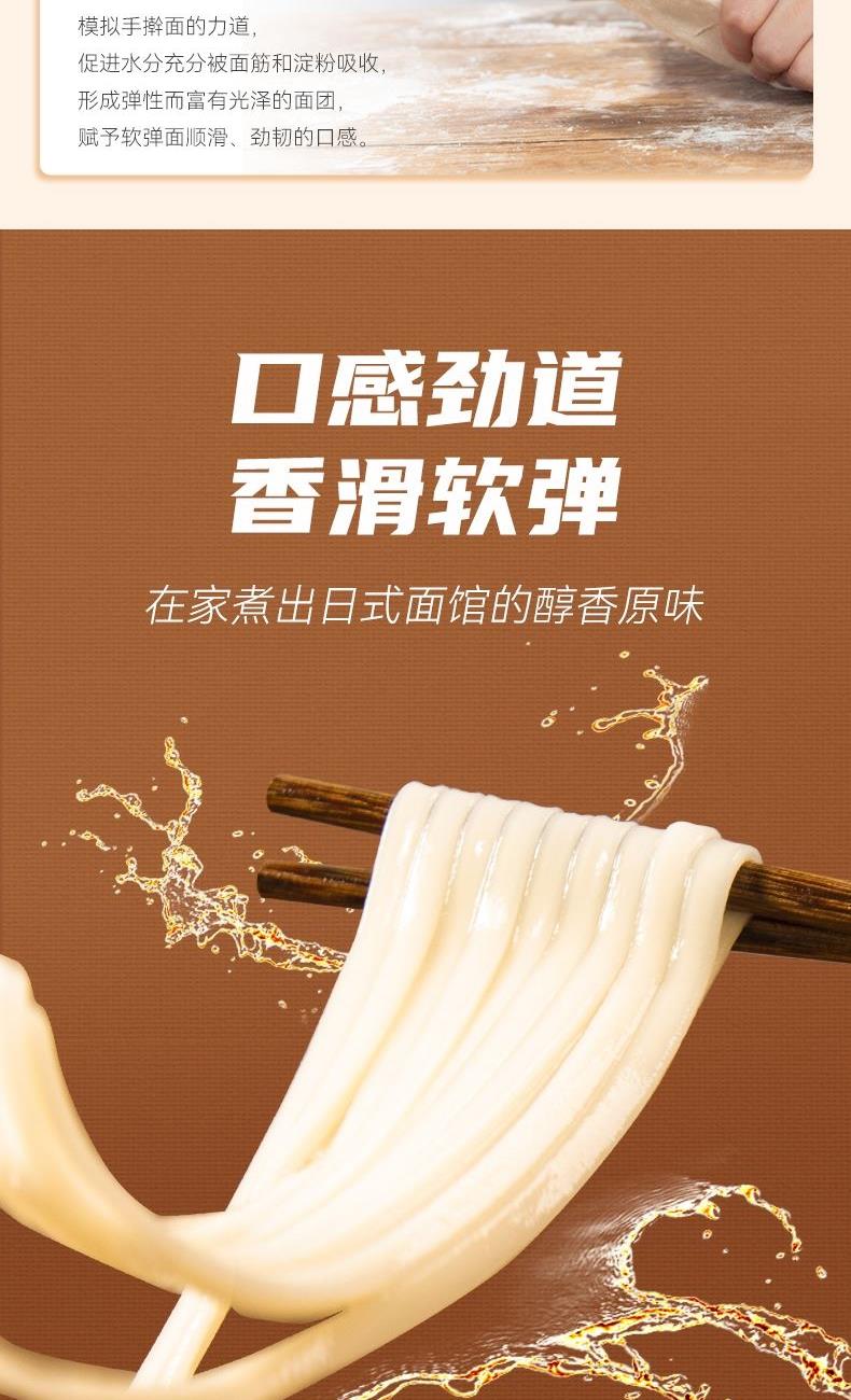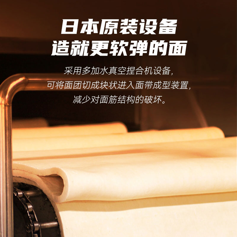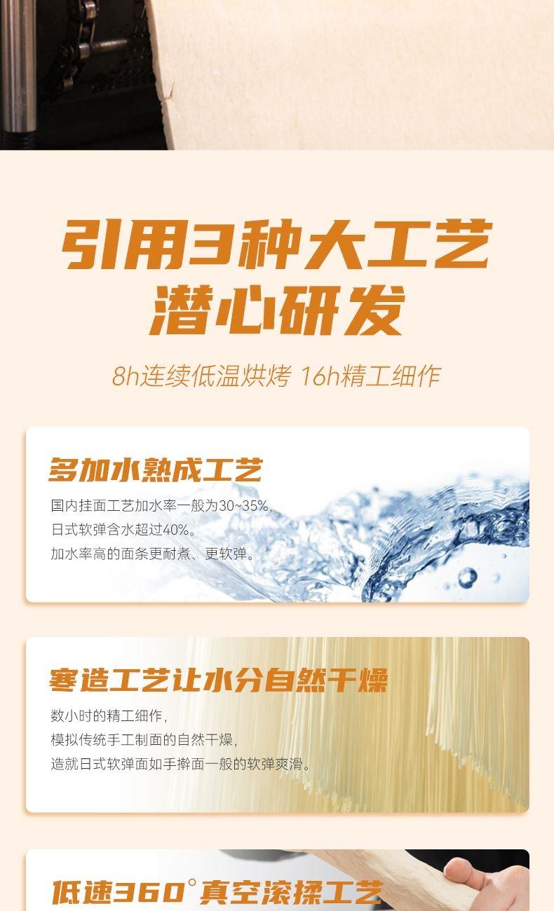 产品规格: 细面 400g*4包 1、42%高加水:口感更爽滑软弹 2、360°真空揉:更筋道耐煮 3、35℃仿日晒:面条品质更稳定 4、细条形,面身圆润顺滑, 咀嚼口感软糯Q弹
