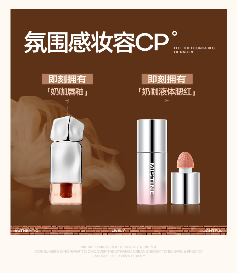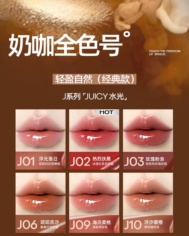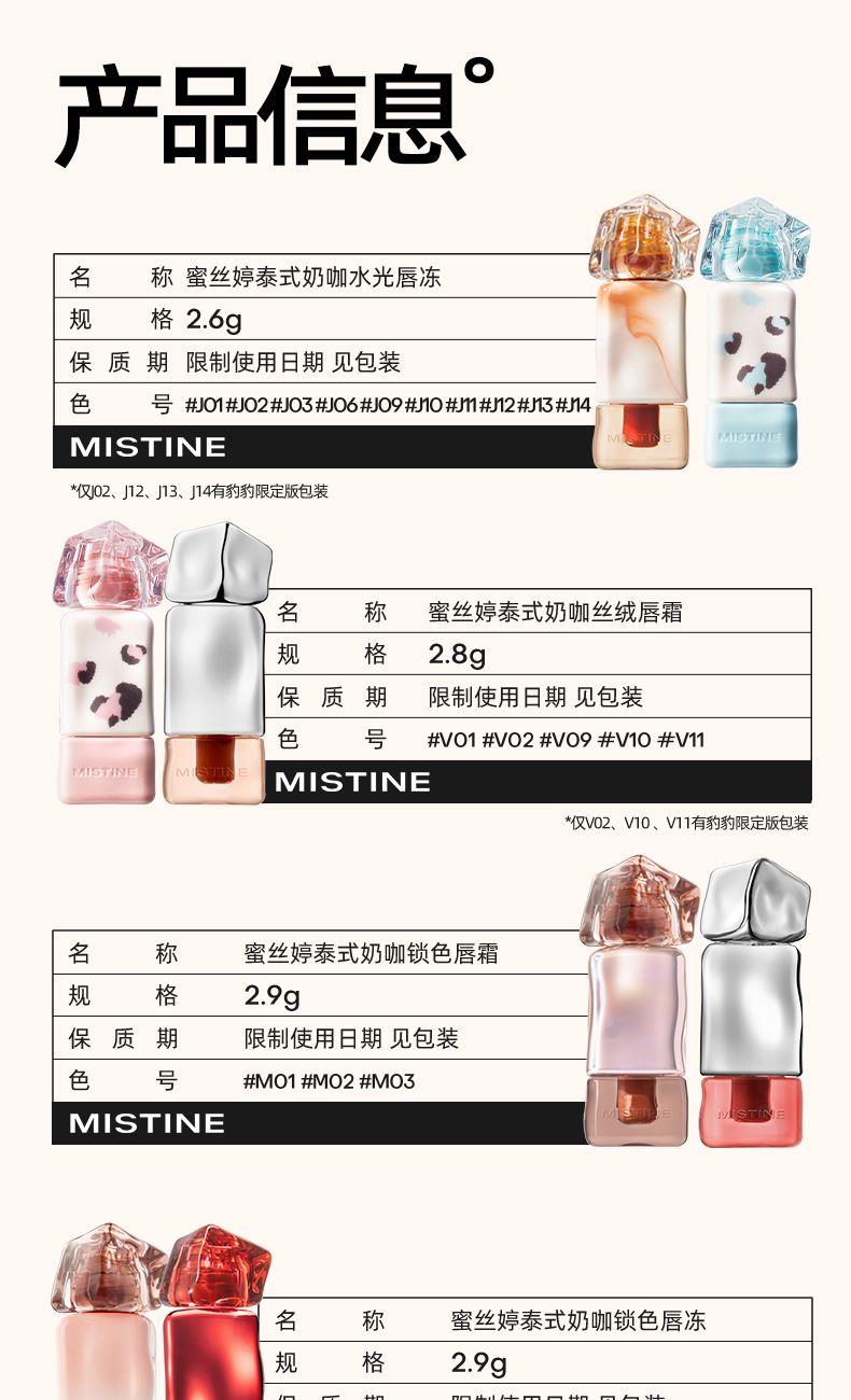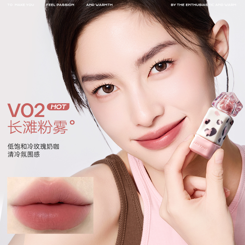2大妆效: 霜转轻雾、水光嘟嘟 1)霜转雾面款带来丝滑绒绒触感,同时轻薄柔焦,持色不拔干: 01 一抿霜转雾,越抿越滑 • 触唇由霜转雾,一抿激活柔焦粒子,雾感弥漫 • 「熔岩奶咖」般绵密丝滑 02 越抿越润,不拔干不卡纹 • 外哑内润,抚平唇纹 • 玻尿酸入妆,干唇友好 04 融入泰妆精髓 专研低饱和奶咖色系 • 比口棕更显白嫩,比红调更提气色 2)水光款平衡水光唇釉的黏腻感和嘟嘟唇妆效: 01 1%丰唇肽入妆,一抿冻感亮嘟嘟 • 精华凝冻成膜,不粘不腻不拉丝 • 足量添加1%丰唇肽,立显饱满嘟嘟 02 三重奢养精华油,8H持续水嘟嘟 • 持续养护双唇,卸妆后依然软软嫩嫩 03 清透高遮盖,深唇也能嫩嘟嘟 • 专研高显色配方,薄涂即可高覆盖 • 一抹即卸不染唇 04 融入泰妆精髓 专研奶咖色系 • 比口棕更显白嫩,比红调更提气色