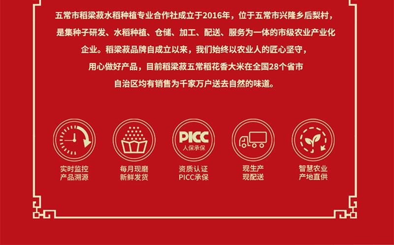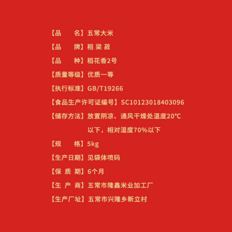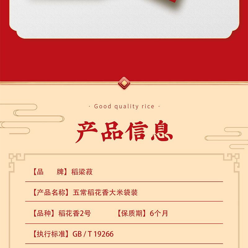 包装:真空袋装 执行标准:GB/T 19266 保质期:6个月 质量等级:优质一级 产地:黑龙江五常市 产品尺寸:300mm*240mm*80mm 推荐理由: 1、五常稻花香2号米。 2、PICC人保承保产品。 3、稻田24小时实时监控。 4、智慧农业系统。 5、当月现磨新米发货。 6、独立溯源码。 7、双层真空保鲜。