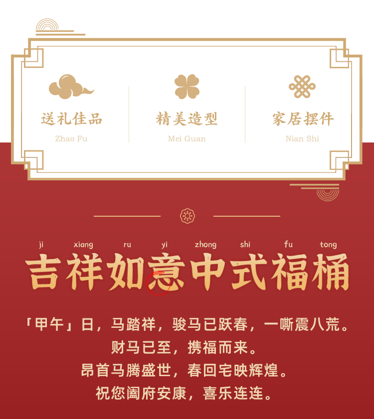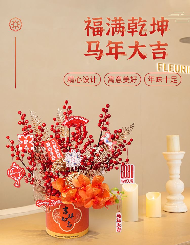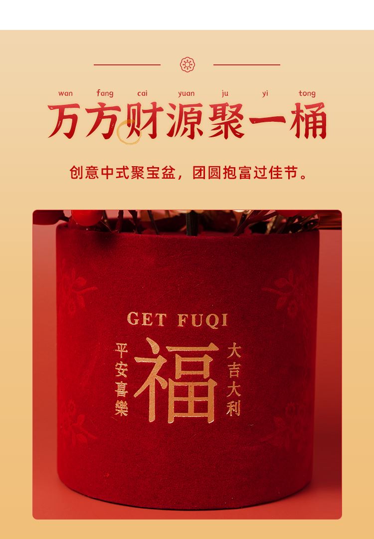 产品:植绒抱富桶-石榴款 编码;W4766 规格 桶:12*12cm 年宵花高度35cm 材料:单只冬青红色、尤加利叶金色、绣球、石榴、马年吊卡1套、礼品袋 注:报价只对应主图款,详情页其他款报价具体联系