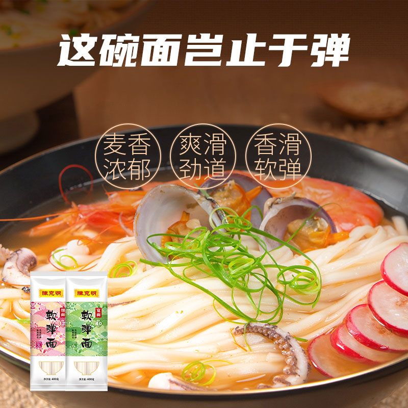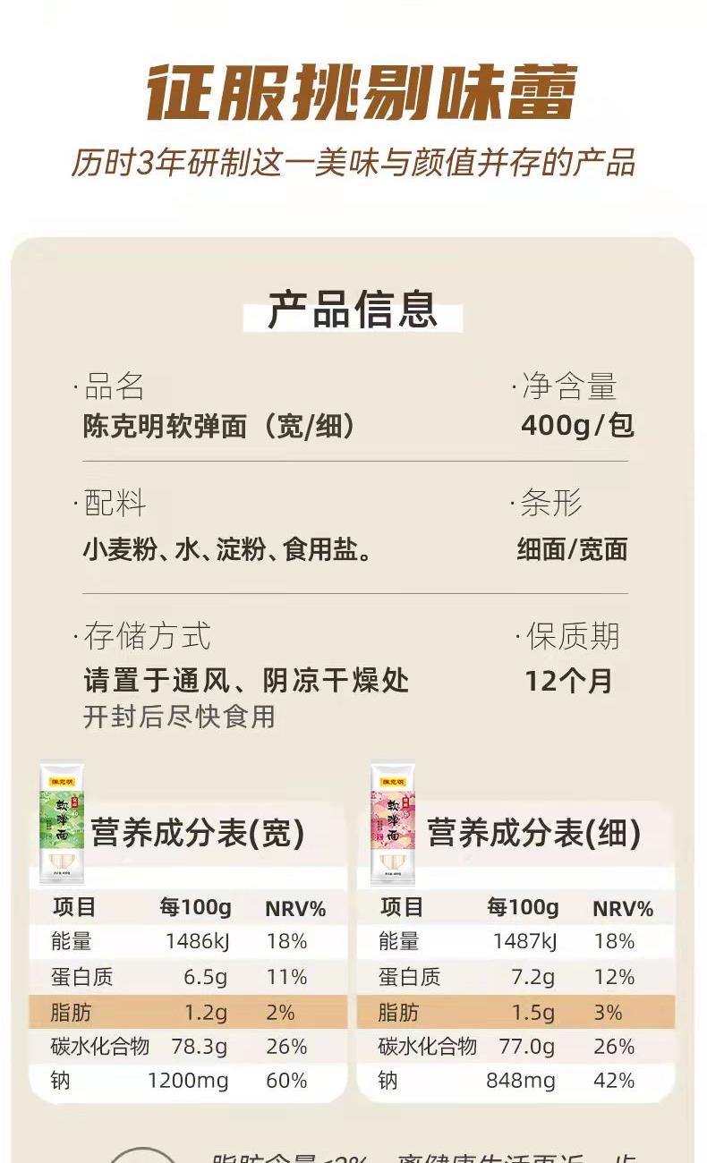 产品规格: 宽面 400g*4包 1、42%高加水:口感更爽滑软弹 2、360°真空揉:更筋道耐煮 3、35℃仿日晒:面条品质更稳定 4、细条形,面身圆润顺滑, 咀嚼口感软糯Q弹