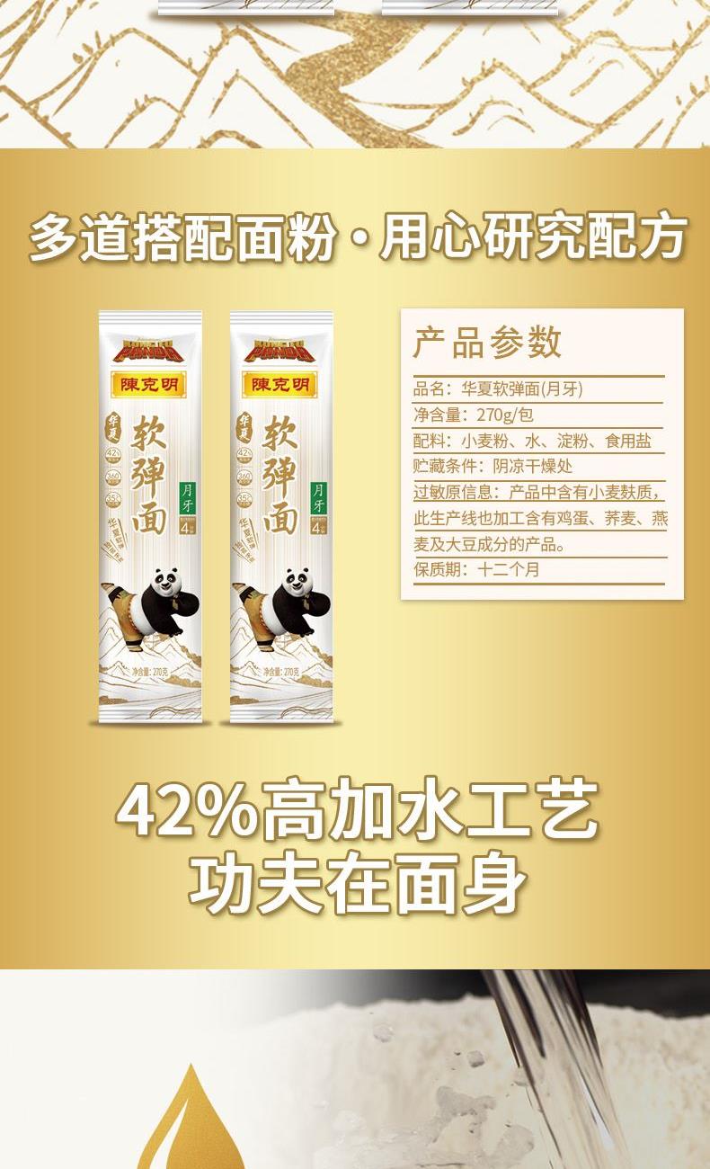 产品规格: 月牙面 270g*6包 1、42%高加水:口感更爽滑软弹 2、360°真空揉:更筋道耐煮 3、35℃仿日晒:面条品质更稳定 4、月牙形面条,面身圆润顺滑, 咀嚼口感软糯Q弹