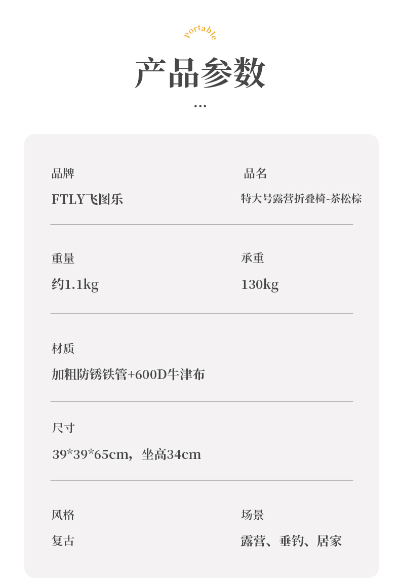 材质:600D双层牛津布 +镀锌钢管 商品颜色:茶松棕 商品规格:加大号 展开尺寸:65*39*39cm 收纳尺寸:68*15*15cm 商品净重:1.1kg 商品承重:130kg