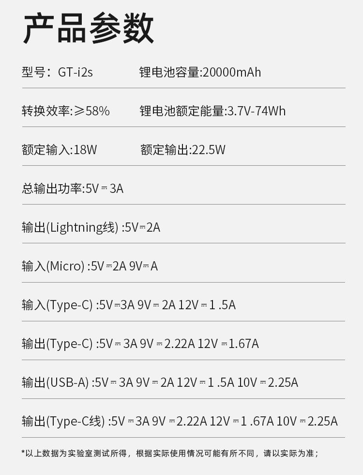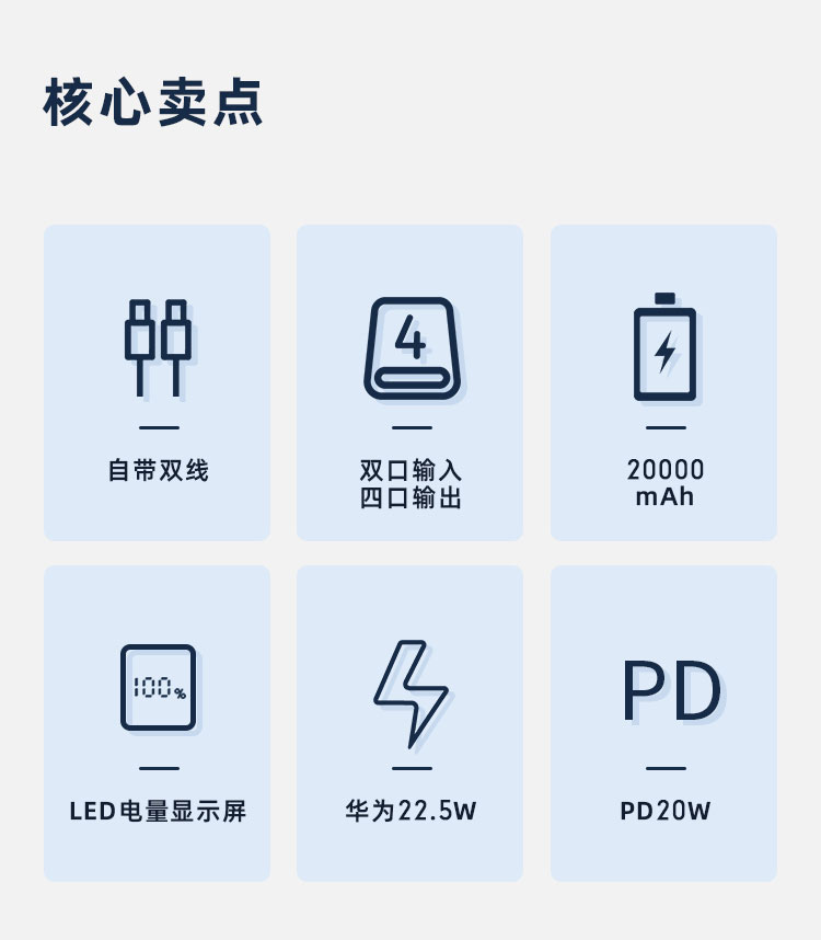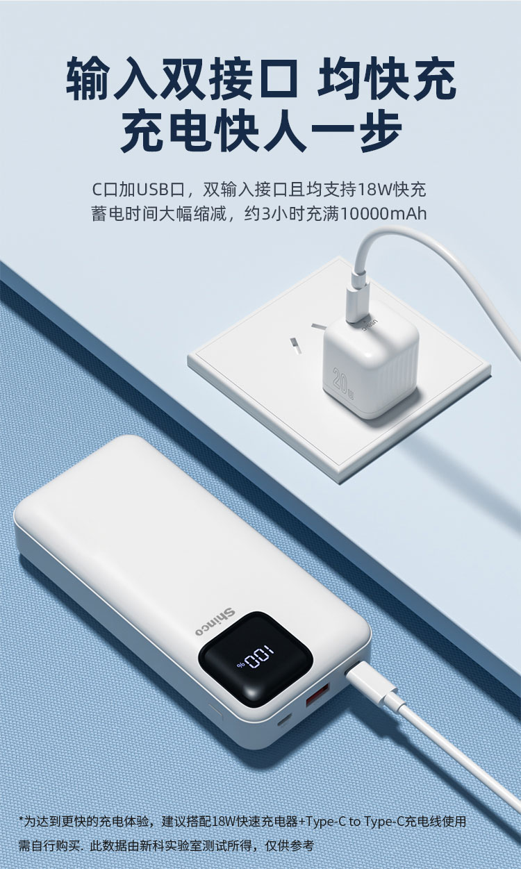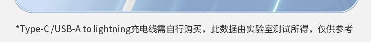 电芯容量:20000mAh(74Wh) 额定容量:11000mAh 输入(Type-C):5V-3A 9V-2A 12V-1.5A 输入(Micro-USB):5V-2A 9V-2A 12V -1.5A 输出(USB-A):10V- 2.25A 9V - 2A 12V- 1.5A 5V-3A 电芯类型:锂-聚合物电芯 1:随身自带线 、充电很方便 自带苹果、Type-C双快充线 2:Type-C线+lightning线+USB-A+Type-C输出口 可同时为4台设备输出充电,充电不等待 3:大容量 20000mAh 、持久续航 4:Type-C口支持PD 20W输出,搭配PD快充线,USB-A口支持22.5W输出 5:支持18W双向快充,蓄电时间大幅缩减