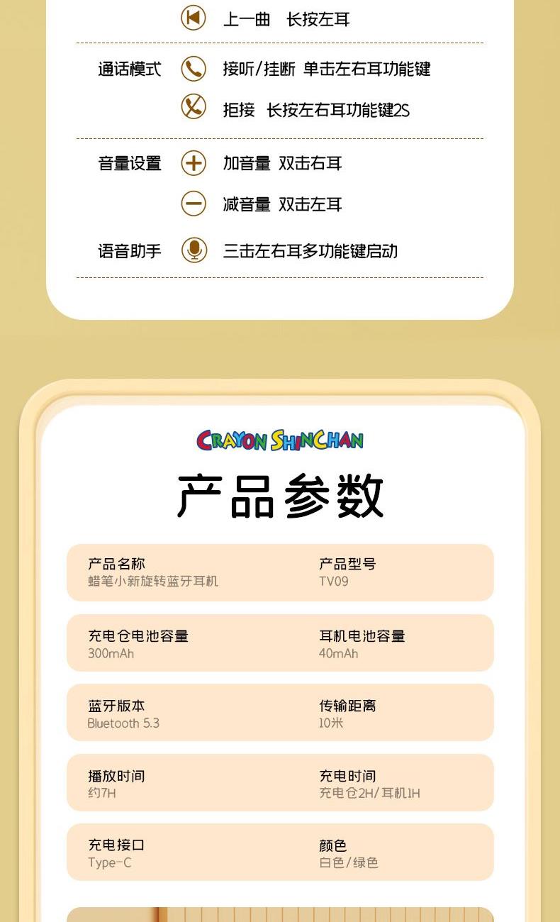 产品型号:TV09 产品尺寸:68*68*29mm 产品颜色:白色、绿色 产品材质:ABS 蓝牙版本:Bluetooth 5.3 传输距离:≥10m(无障碍) 耳机电池容量:40mAh 充电仓电池容量:300mAh 音乐播放时间:≈7h 充电时间:充电仓2H/耳机1H 充电接口:Type-C