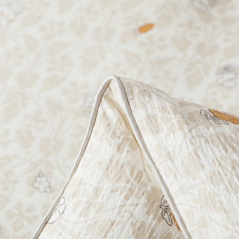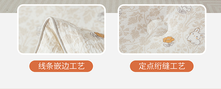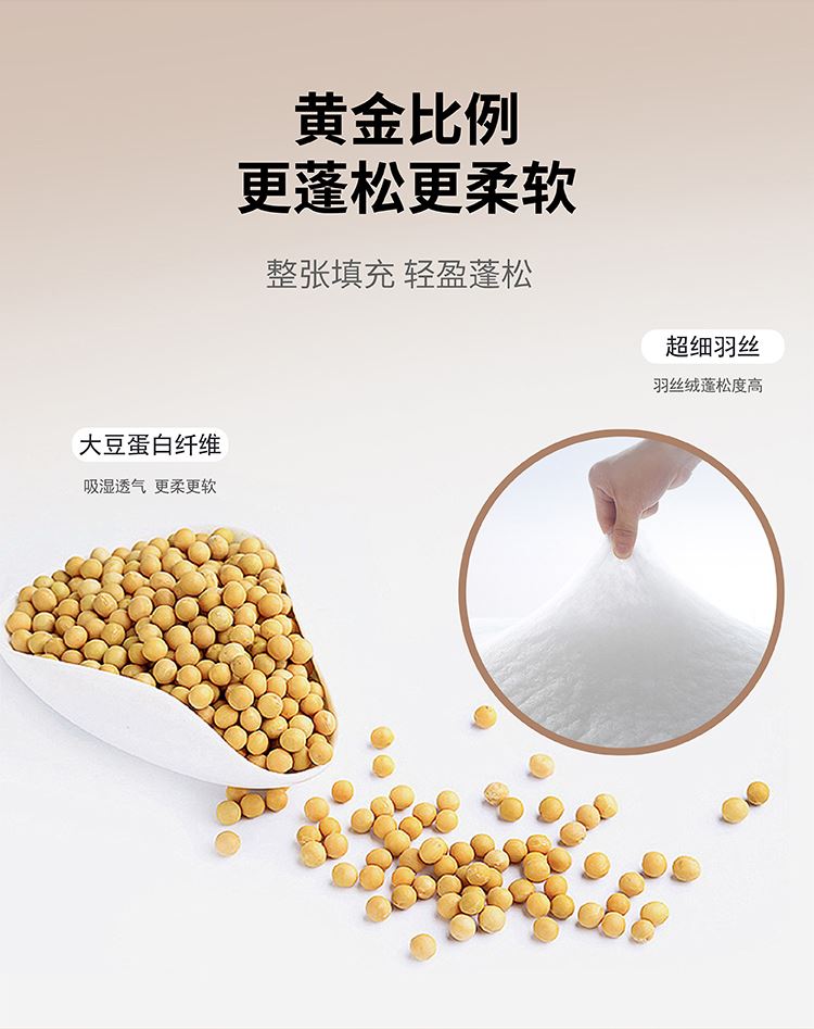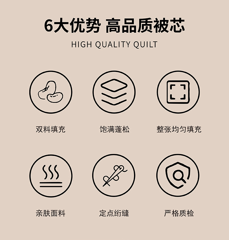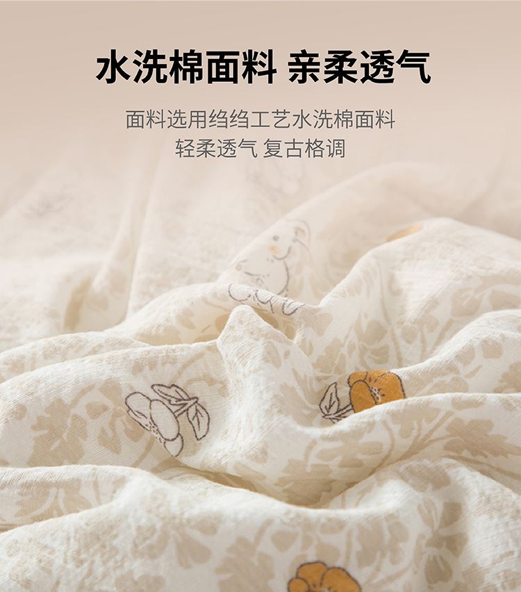尺寸:200x230cm 填充物:2000g 被重:2800g 【面 料】水洗棉(聚酯纤维) 【填充物】大豆蛋白纤维、超细羽丝纤维(聚酯纤维) 产品特点: 1.面料选用绉绉工艺水洗棉面料,轻柔透气,复古格调; 2.内芯萃取大豆蛋白纤维,整张填充,质地柔软,轻盈透气,双重滋养; 3.线条嵌边工艺,精美细腻,牢固结实,经久耐用。