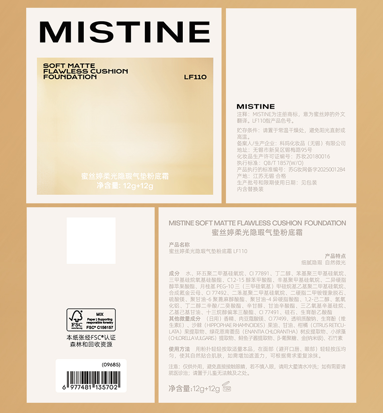 蜜丝婷柔光隐瑕海绵金气垫气垫粉底霜LF100透亮瓷白色 蜜丝婷柔光隐瑕海绵金气垫气垫粉底霜LF100透亮瓷白色