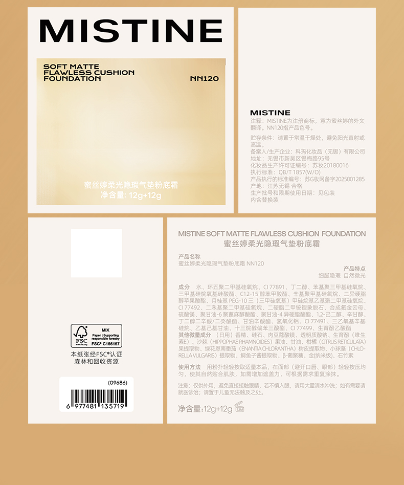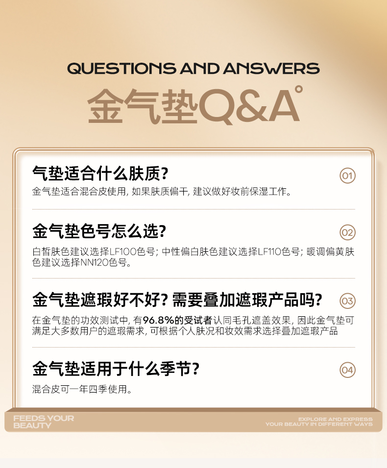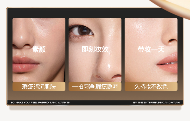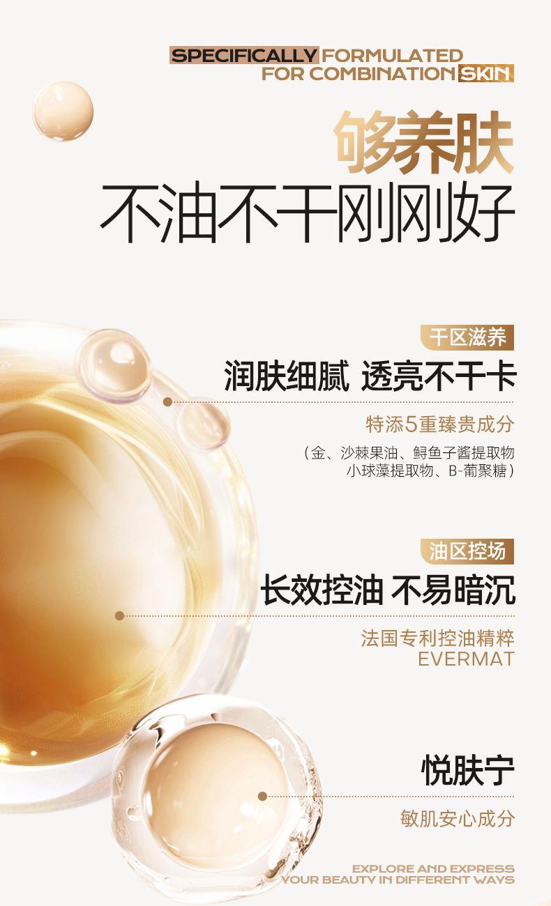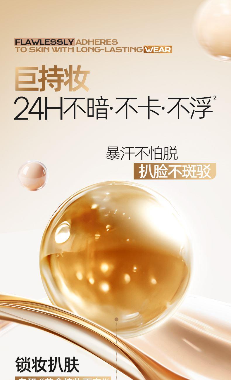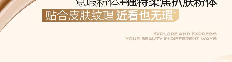 1.一拍遮瑕,高度服帖不假面,三段式遮瑕服帖 光感隐瑕:漫反射粉体,复配ANTIDARK-MICA 服帖遮瑕:亲肤氨基酸处理粉体,细腻贴肤 智能平瑕:大小粒径粉体组合,3D立体遮瑕,填平瑕疵不厚重,告别妆面斑驳 2.控油锁色,补妆不变色 三段式控油锁妆:控油+持色+平色差 3.妆养合一,带妆无负担 三维养肤,精华含量高达75%: 三重保湿(泛醇、水解胶原、4D玻尿酸)+舒缓(悦肤宁)+五重抗氧(依克多因、虾青素、生育酚乙酸酯、桃佗酚、肌肽)