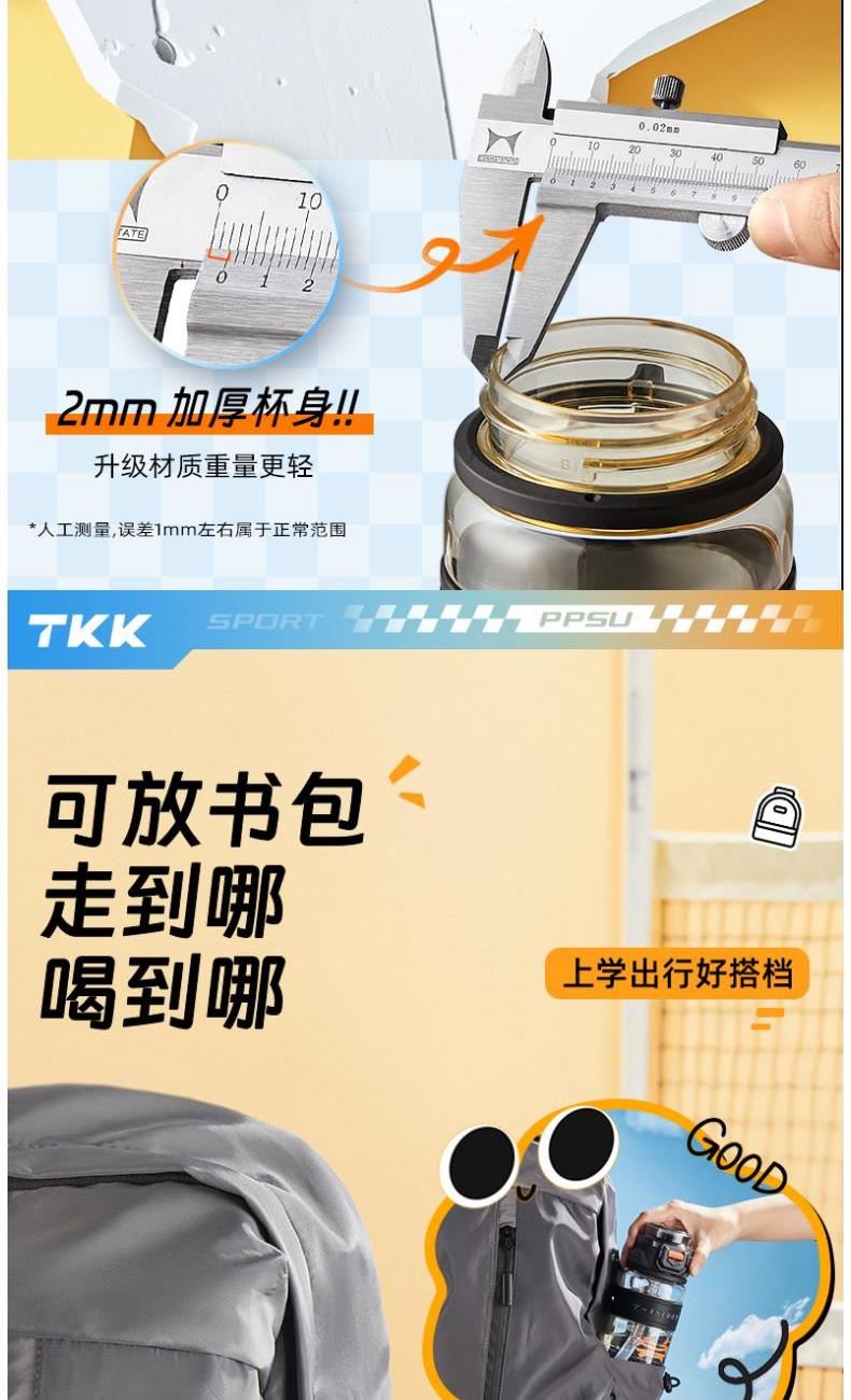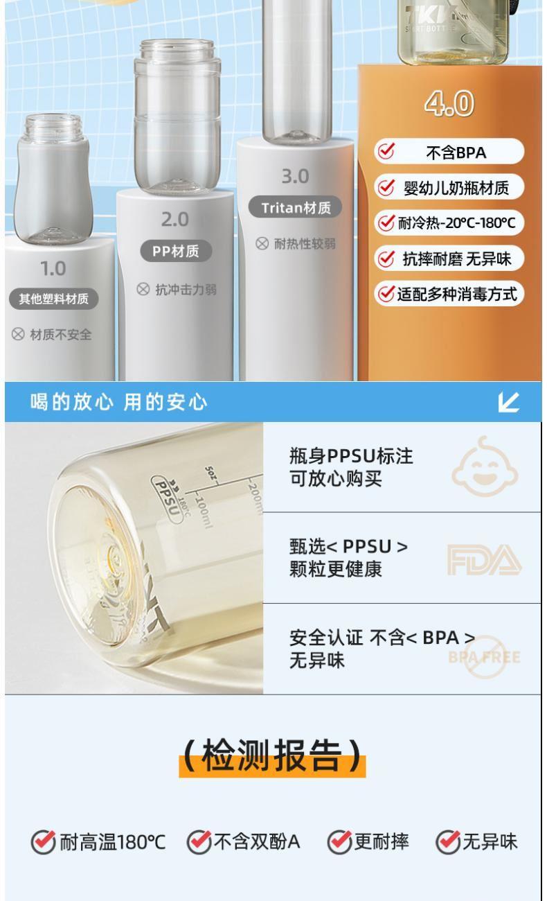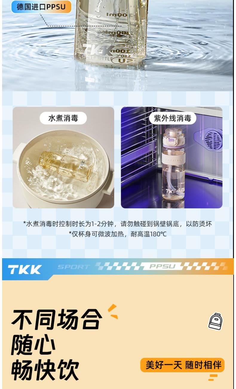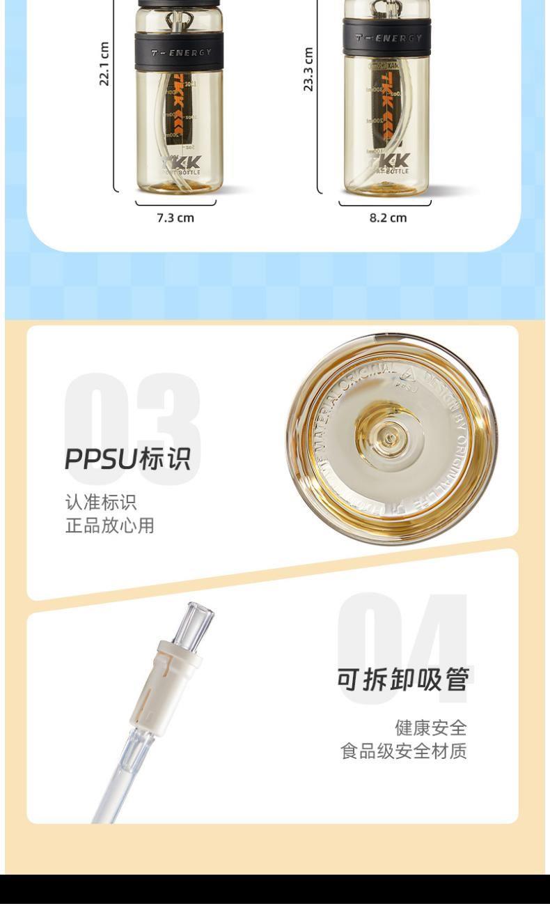 商品容量:620mL 杯身材质:PPSU 商品净重:198g 商品尺寸:9X7.3X22.1CM 1、德国巴斯夫(ppsu)公司直供母婴级材质,加厚杯身,180°耐高温,硅胶杯套不烫手,放心饮用 。 2、 可水煮消毒,可紫外线消毒,杯身可微波炉加热水。 3、 多种防漏设计,精密密封圈,倒置不漏。 4、 一杯双饮,单手开盖无压力,不易呛口,够喝一整天。 5、 安全锁扣,按压上翻开盖,可固定翻盖。 6、便携式加宽提绳设计,方便出行。 7、不藏污纳垢,容易清洗。 8、 时尚运动配色设计,耐看。 9、 静音放置,耐磨杯底座,防滑工艺耐磨抗摔。