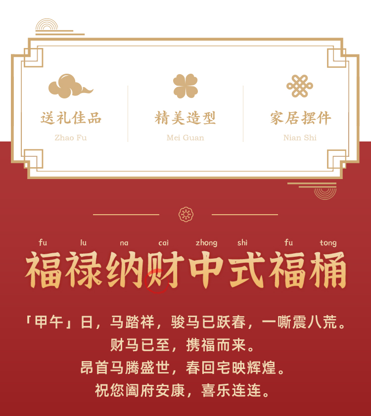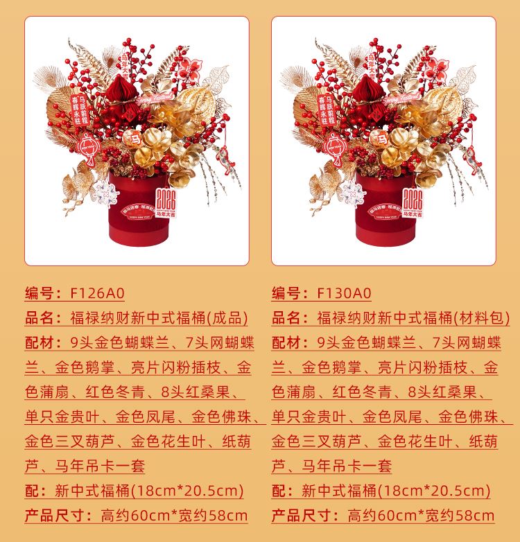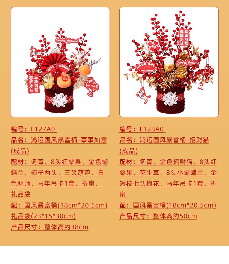 产品:福禄纳财新中式福桶-成品 编码:F126A0 规格: 桶18*20.5cm 整体高60cm 宽58cm 材料:金色蝴蝶兰-9头、7头网胡蝶兰、金色鹅掌、亮片闪粉插枝、金色蒲扇、金色马蹄莲、红色冬青、8头红桑果、单只金贵叶、金色凤尾、金色佛珠、金色三叉葫芦、金色花生叶、纸葫芦、马年吊卡一套 特别注意:报价只对应主图款,详情页其他报价请具体联系