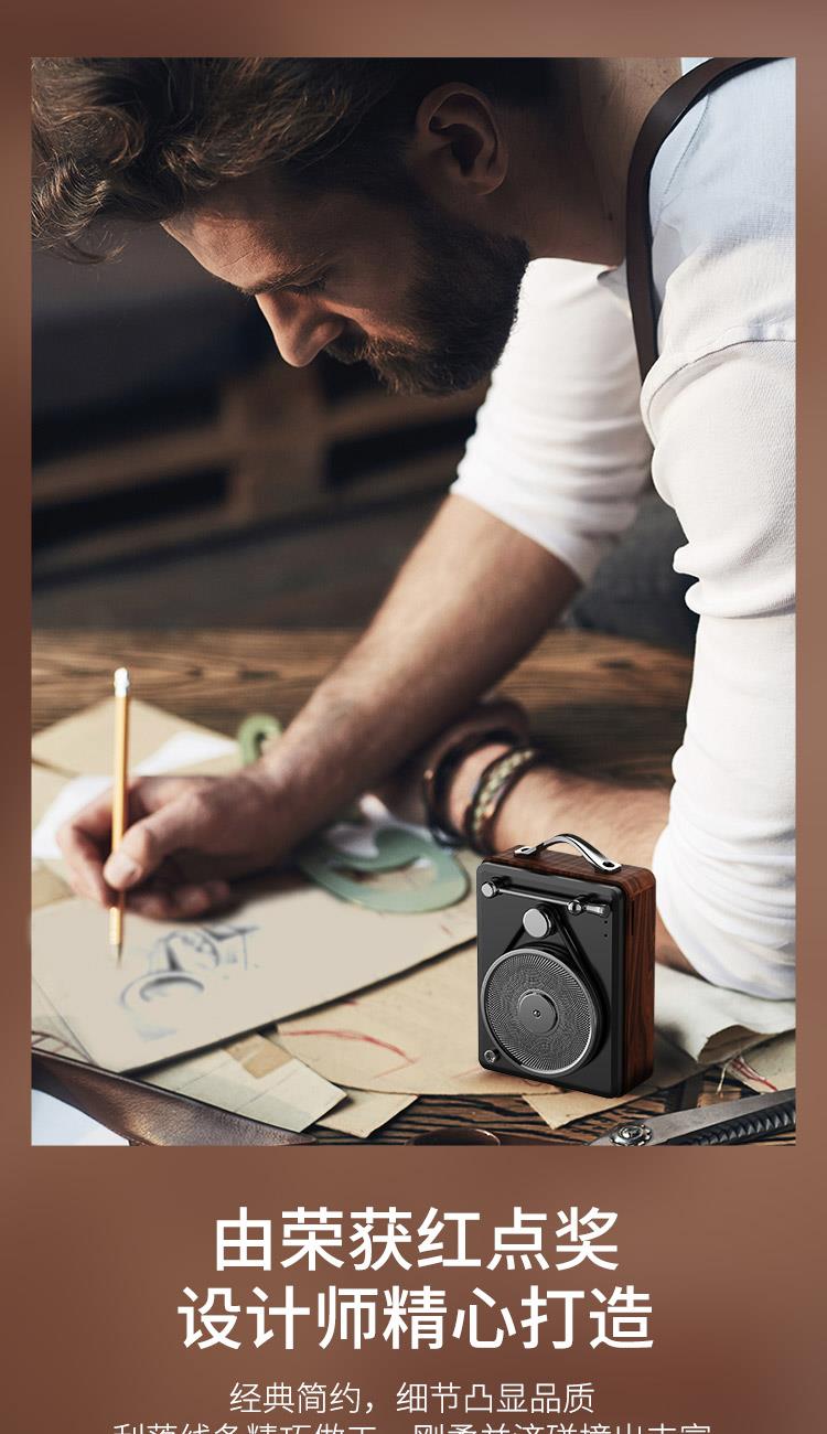 经典复古唱片机蓝牙音响 颜色:木纹色 材质:ABS 尺寸:115*73*64mm 包装:彩盒包装 【功能特点】: 经典复古,岁月留声 经典旋钮控制音量大小 蓝牙连接/插卡播放/USB播放/音频线 5.4蓝牙芯片连接稳定