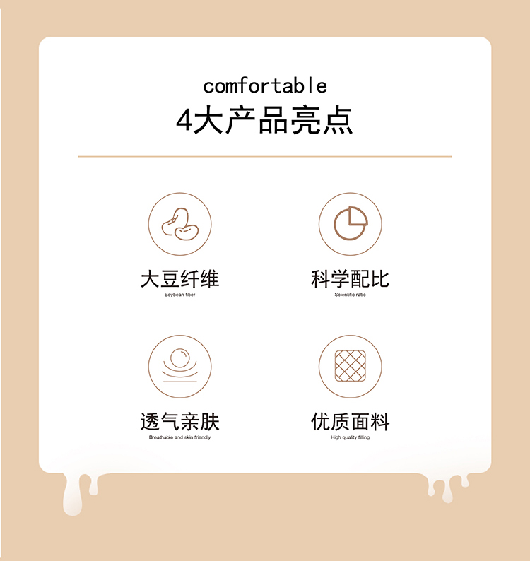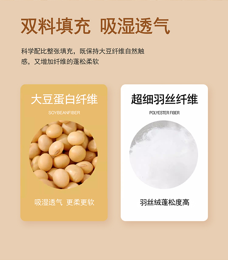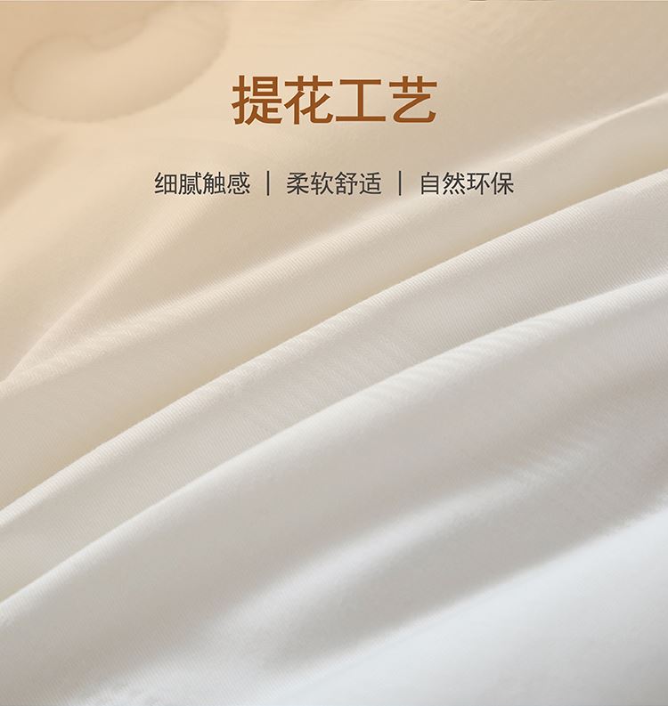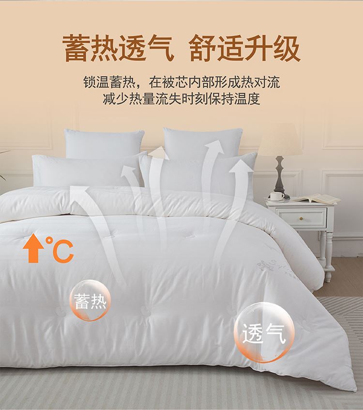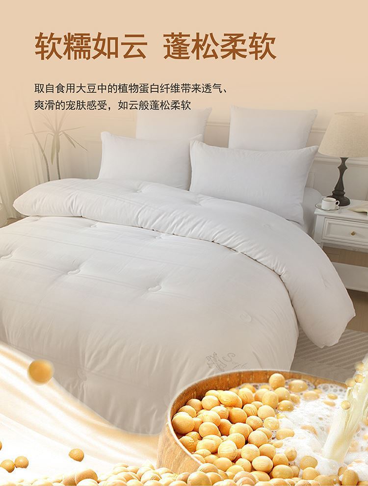 尺寸:200x230cm 填充物:2000g 被重:3100g 【面 料】全棉 【填充物】大豆蛋白纤维、超细羽丝纤维(聚酯纤维) 产品特点: 1.全棉贡缎提花面料,触感柔软,细腻亲肤,环保; 2.整张大豆蛋白纤维、超细羽丝纤维双料填充,柔软蓬松、蓄暖透气,轻盈不压身,舒适更升级; 3.细节用心,定点绗缝,本色布被角扣,烫钻装饰与产品浑然一体彰显高品质