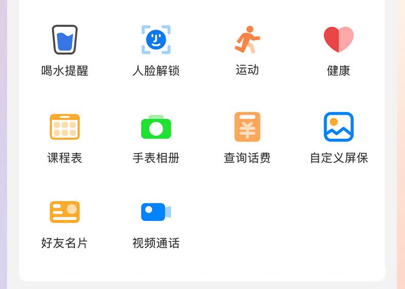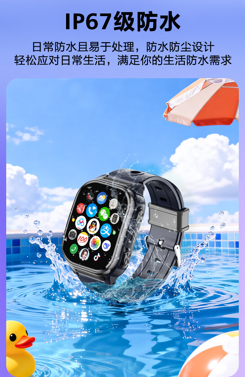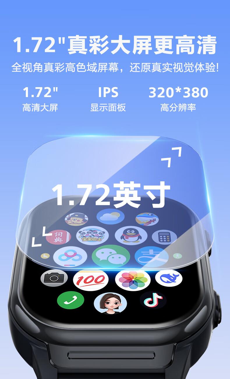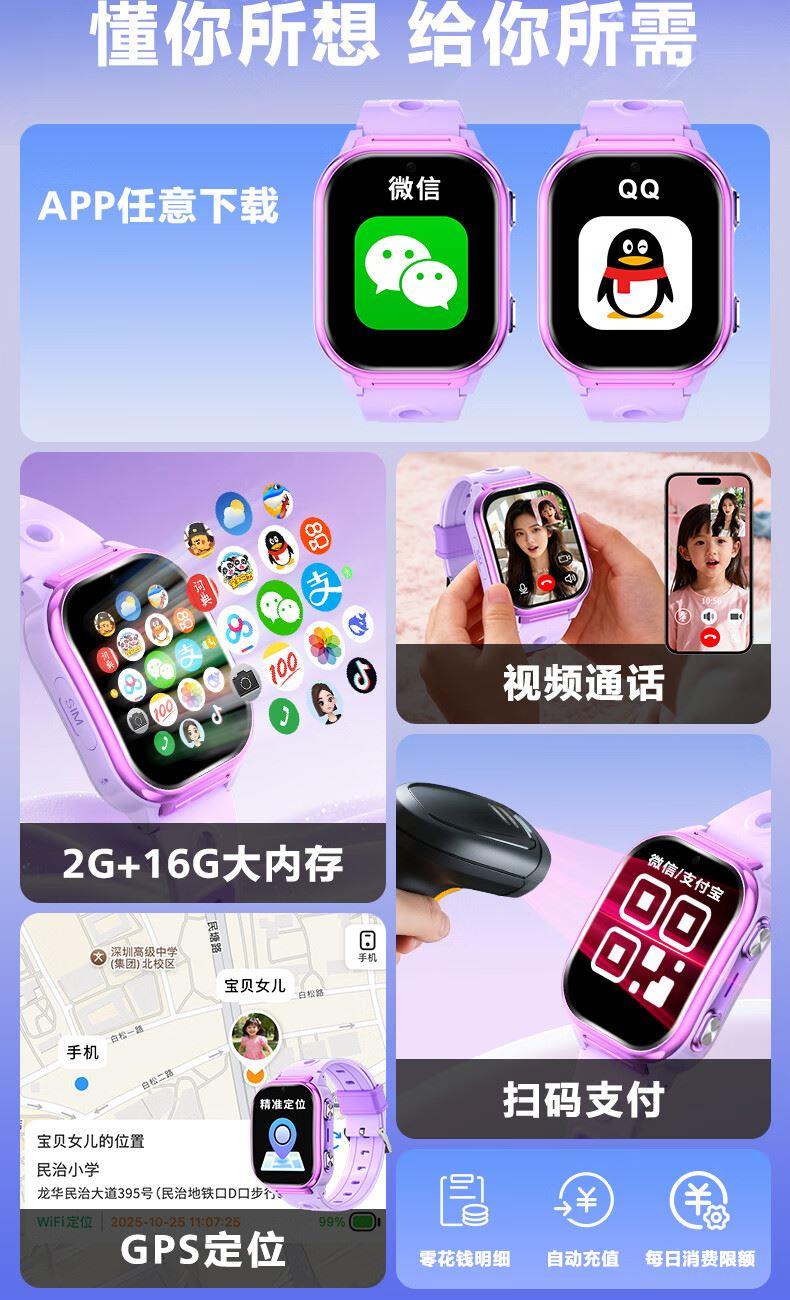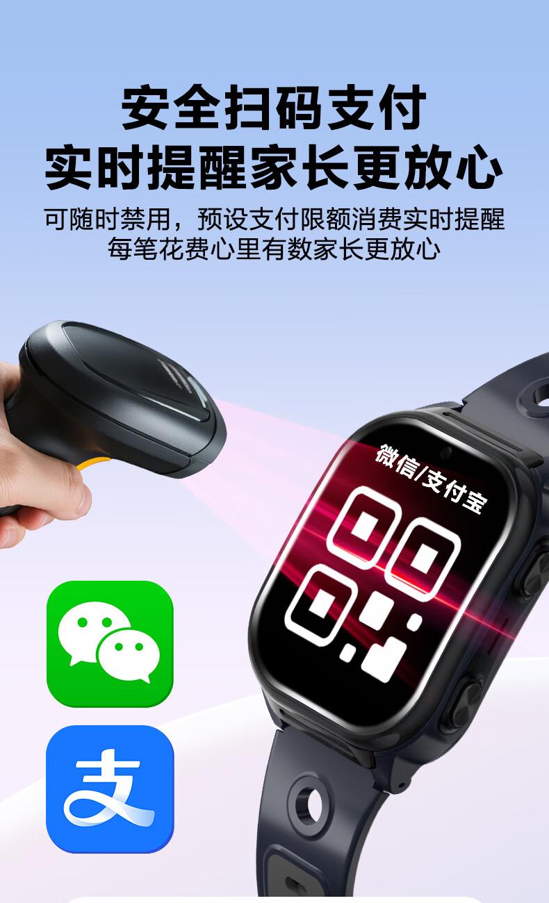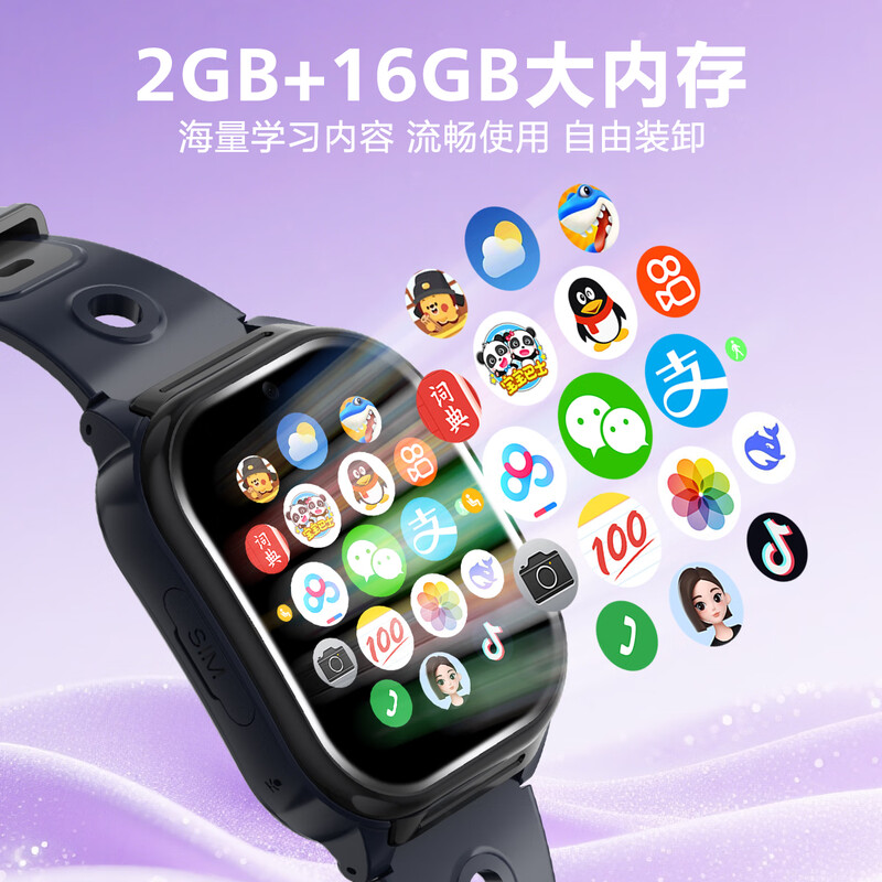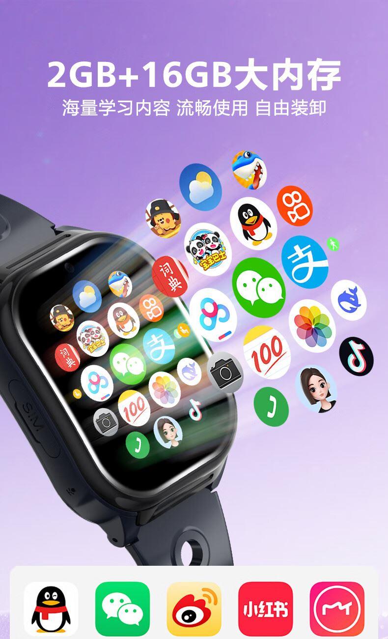 2G+16G大内存,旗舰安卓系统,软件随心下,海量学习内容,流畅使用,自由装卸,微信/支付宝双向支付,微信/QQ/儿童版微信交友聊天,上课禁用,AI探索(小度),智享童年,AI智能定位(支持GPS++WIFI+LBS等定位);喝水提醒,就做提醒,时制切换,课程表,手表相册,自定义屏保,应用商店,好友名片,拒接陌生来电,代收手表短信,终端WIFI,S0S/亲情号码、4G视频通话;