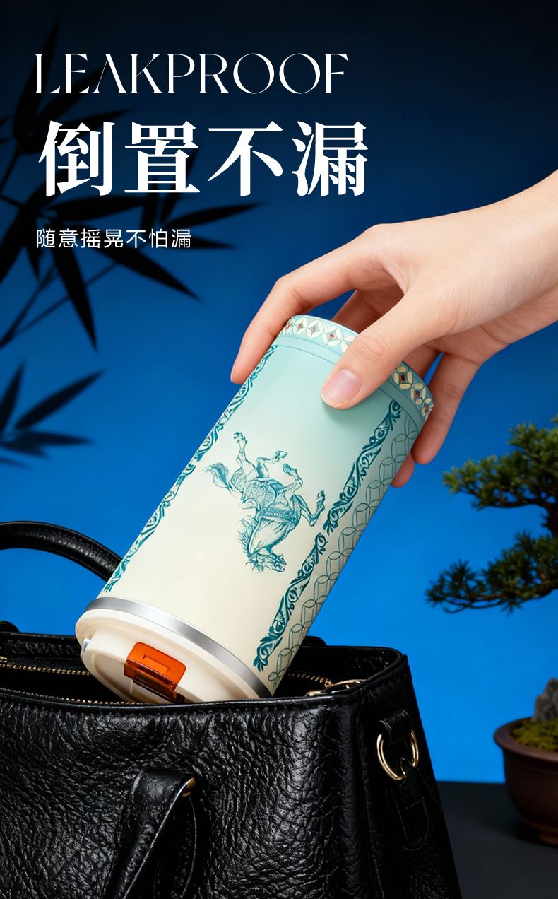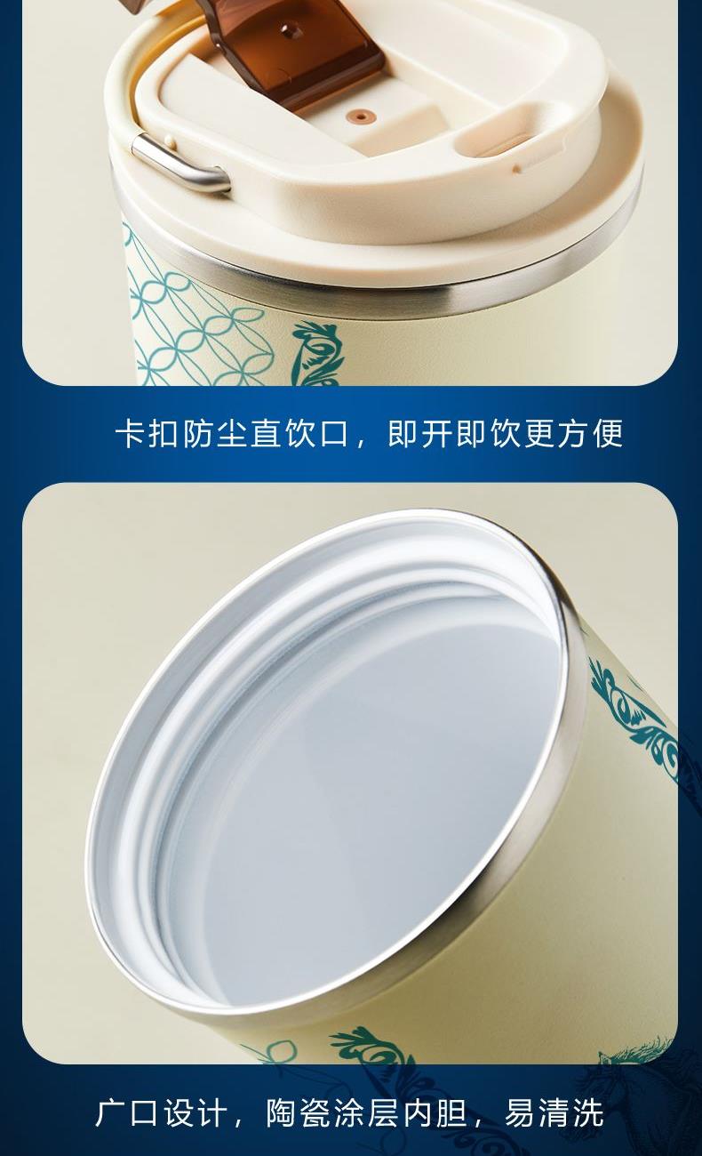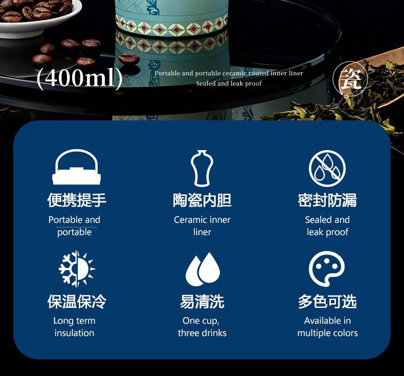 规格:咖啡杯400ml+杯保温杯260ml 精品套装组合 1.黑科技陶瓷内胆:无金属异味 保温 锁鲜 耐酸碱,冷热酸甜都不惧怕 2.百搭魔法杯:咖啡、红茶、果汁、牛奶、都可泡 3.瓷内胆,不易留茶垢,方便清洗更省心 4.使用新型3D喷墨印刷技术,展现凹凸立体质感,将颜色和细微图案一层一层精心的重叠,再现图案的触感 5.杯盖有隐形拉手,出门一提就走 6.硅胶杯垫,既防滑耐磨又静音,有效保护杯底,车载不怕洒水