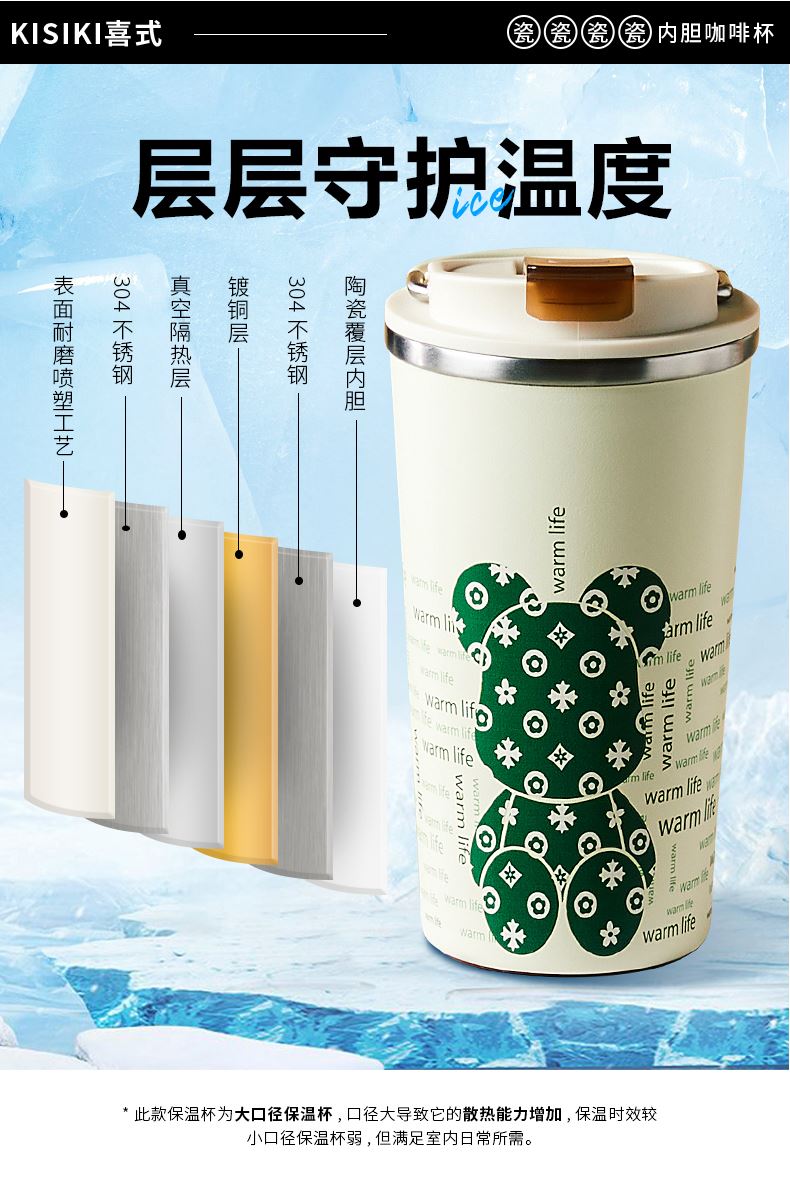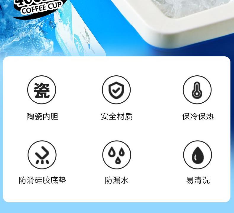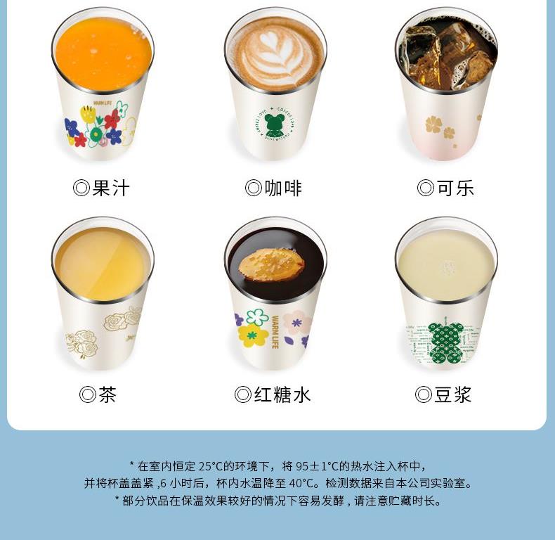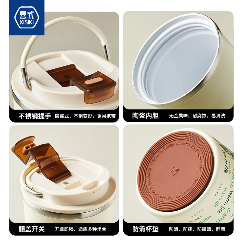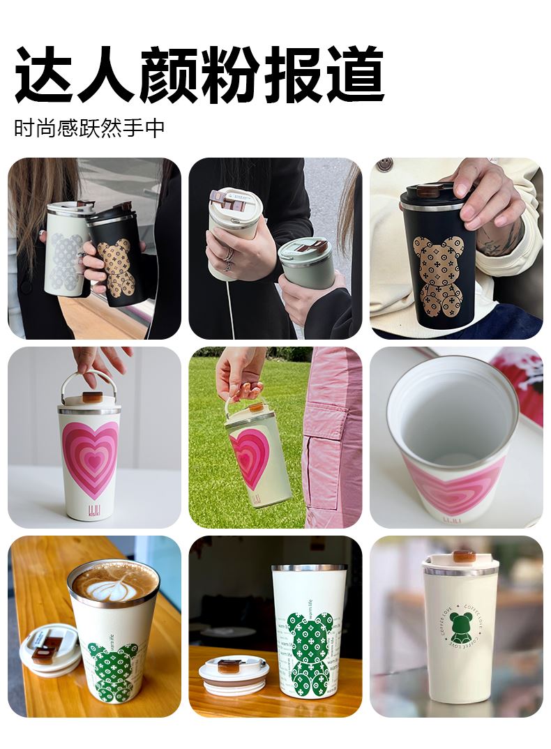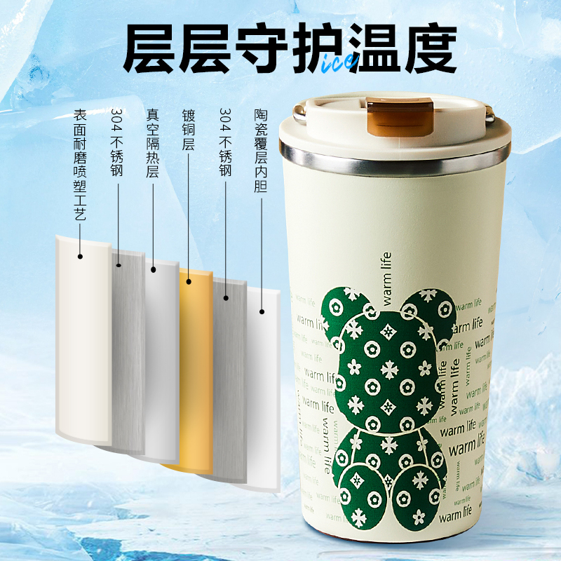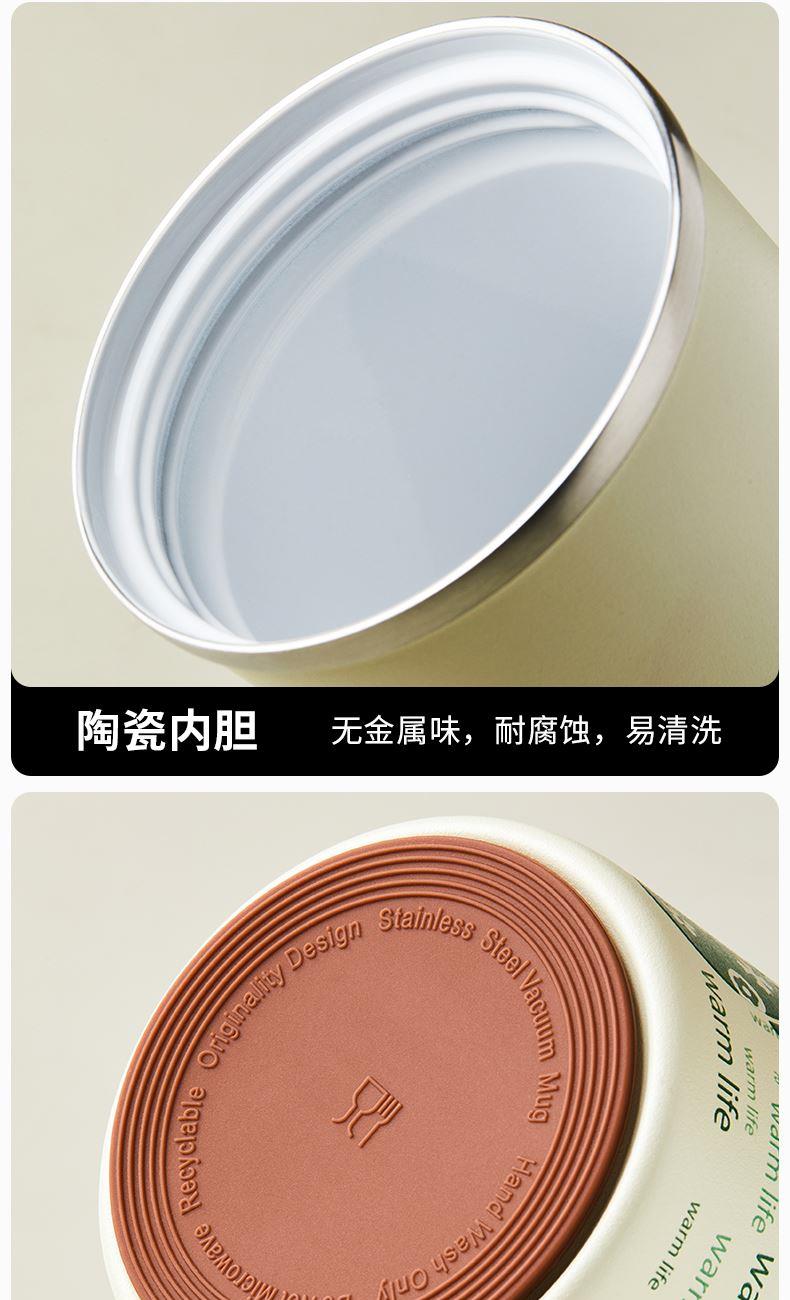 杯身喷塑附着力强、内外304杯体、瓷内胆,易清洗 包装;彩盒 1.黑科技陶瓷内胆:无金属异味 保温 锁鲜 耐酸碱,冷热酸甜都不惧怕 2.百搭魔法杯:咖啡、红茶、果汁、牛奶、都可泡 3.瓷内胆,不易留茶垢,方便清洗更省心 4.使用新型3D喷墨印刷技术,展现凹凸立体质感,将颜色和细微图案一层一层精心的重叠,再现图案的触感 5.杯盖有隐形拉手,出门一提就走 6.硅胶杯垫,既防滑耐磨又静音,有效保护杯底,车载不怕洒水
