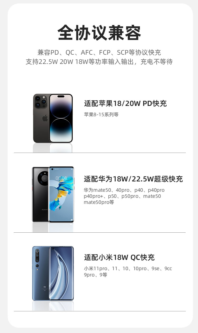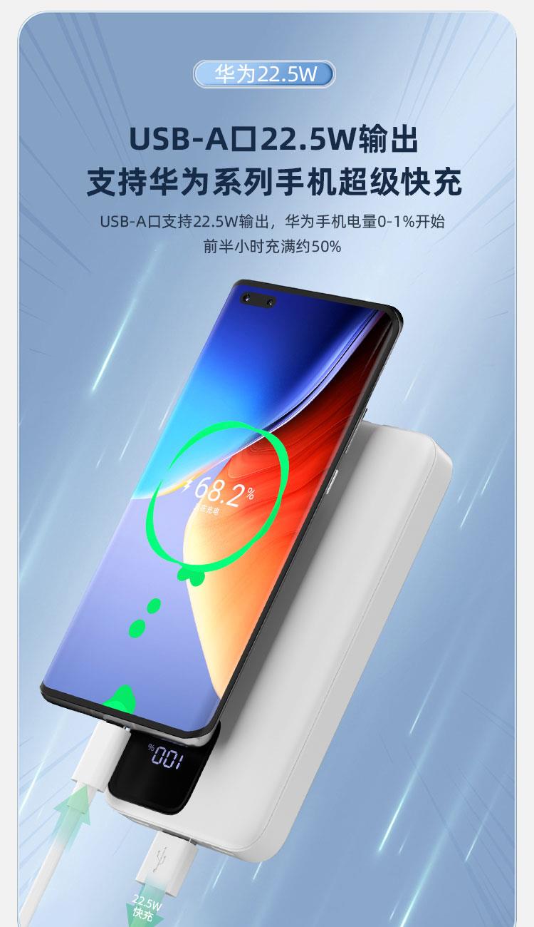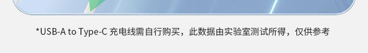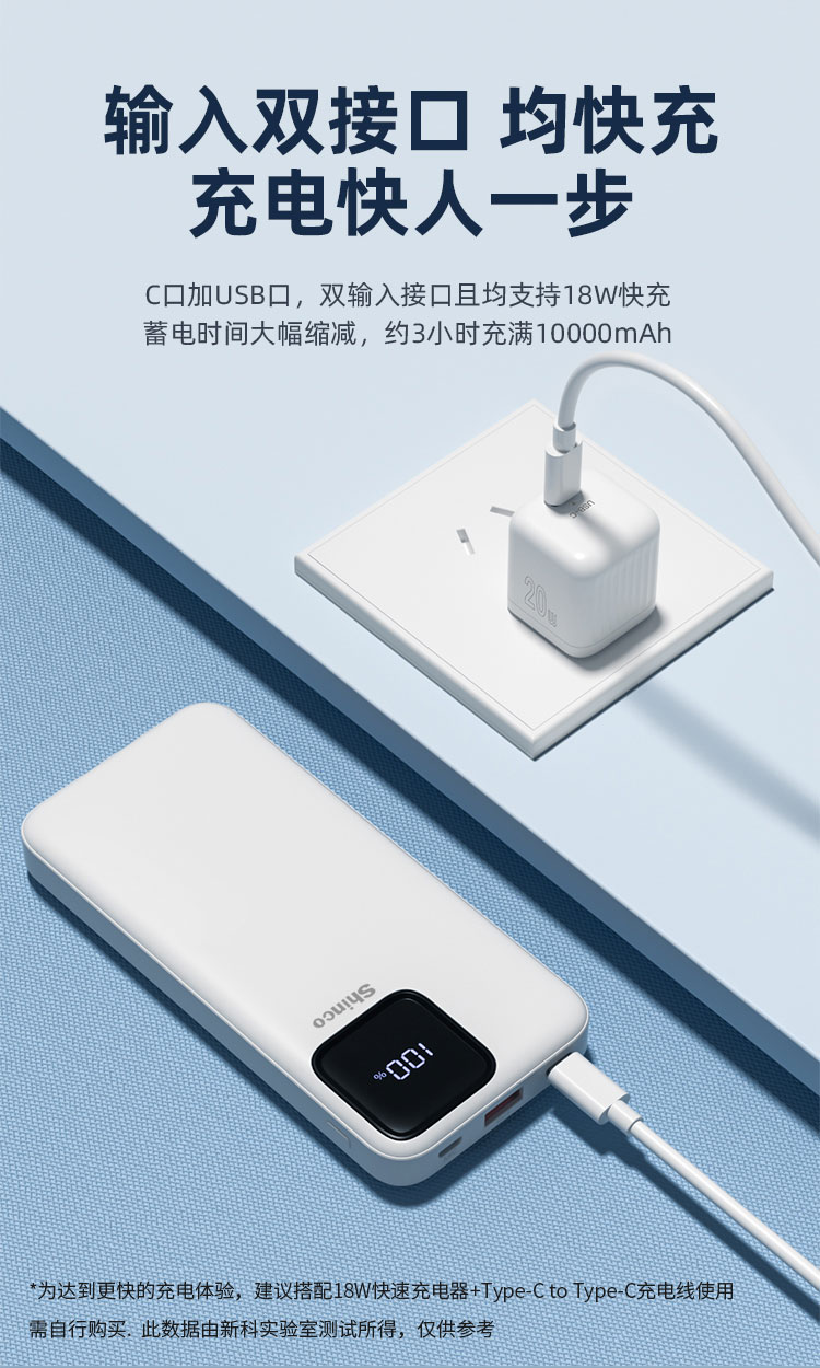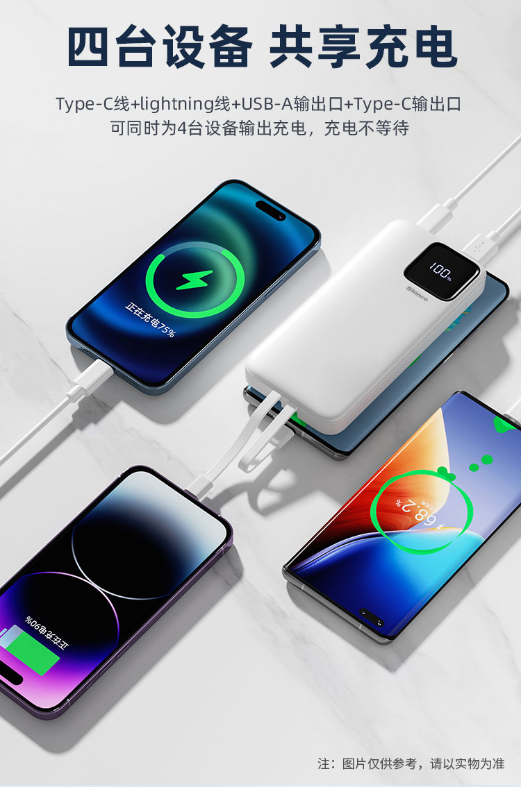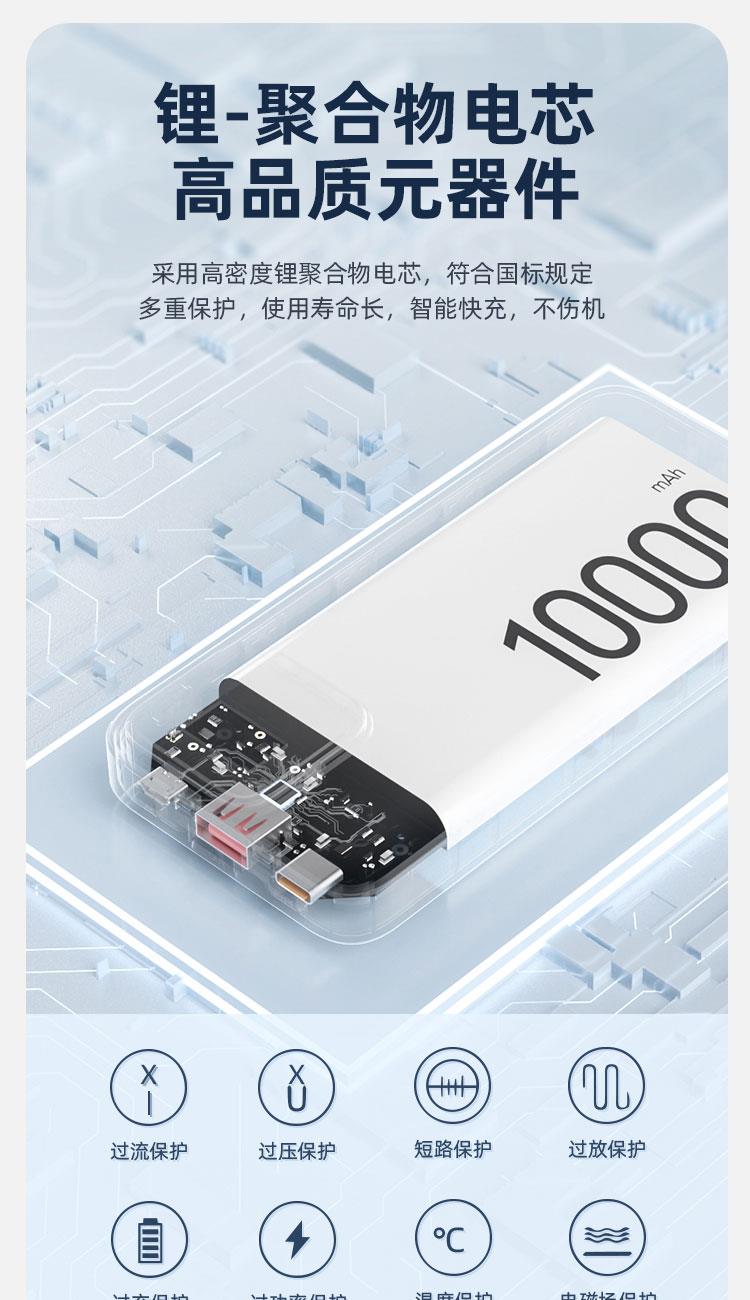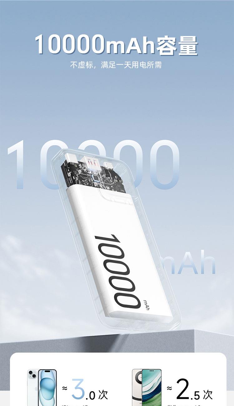 锂电池容量:10000mAh 转换效率:≥58% 锂电池额定能量:3.7V-74Wh 额定输入:18W 额定输出:22.5W 总输出功率:5V-3A 输出(Lightning线) :5V-2A 1:随身自带线 、充电很方便 自带苹果、Type-C双快充线 2:Type-C线+lightning线+USB-A+Type-C输出口 可同时为4台设备输出充电,充电不等待 3:大容量 10000mAh 、持久续航 4:Type-C口支持PD 20W输出,搭配PD快充线,USB-A口支持22.5W输出