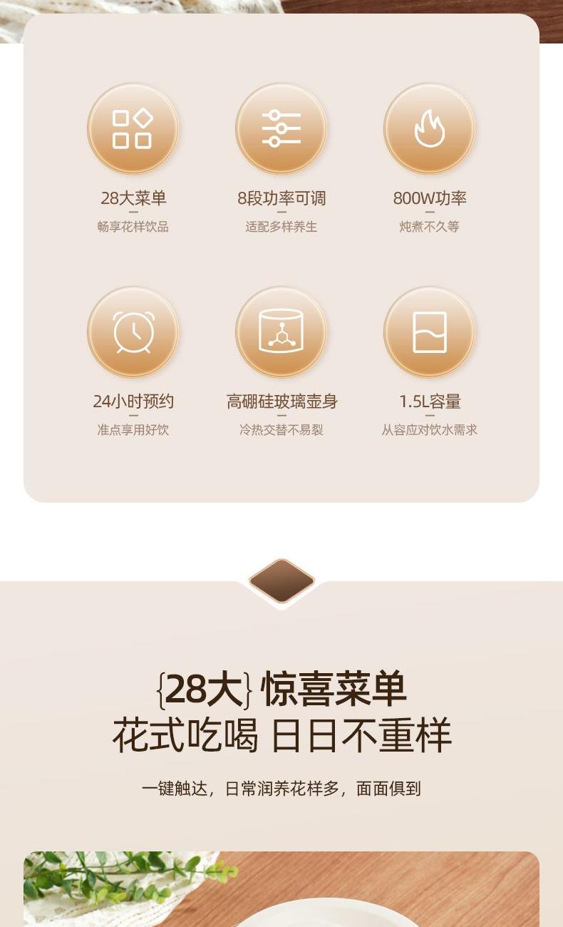 额定功率:800W 产品容量:1.5L 额定电压:220V~ 产品频率:50Hz 产品净重:1.3kg 产品毛重:1.7kg 整箱重量:21.5kg 装 箱 数:12台/箱 高硼硅玻璃壶身高硼硅玻璃冷热交替不易裂 触控菜单选择二十八大触控菜单选择,数码显示,防干烧 功率可调8段功率可调 时间可调24小时预约,180分钟定时可调