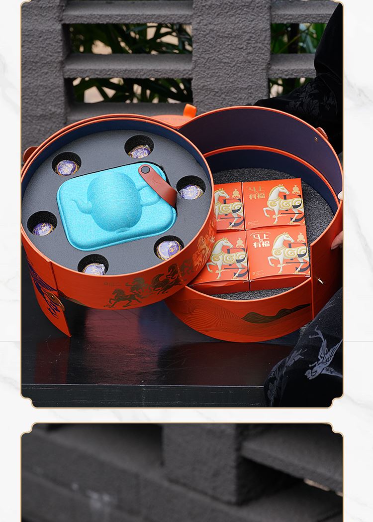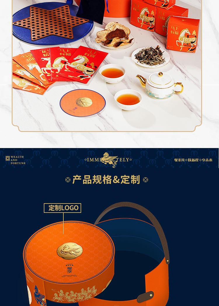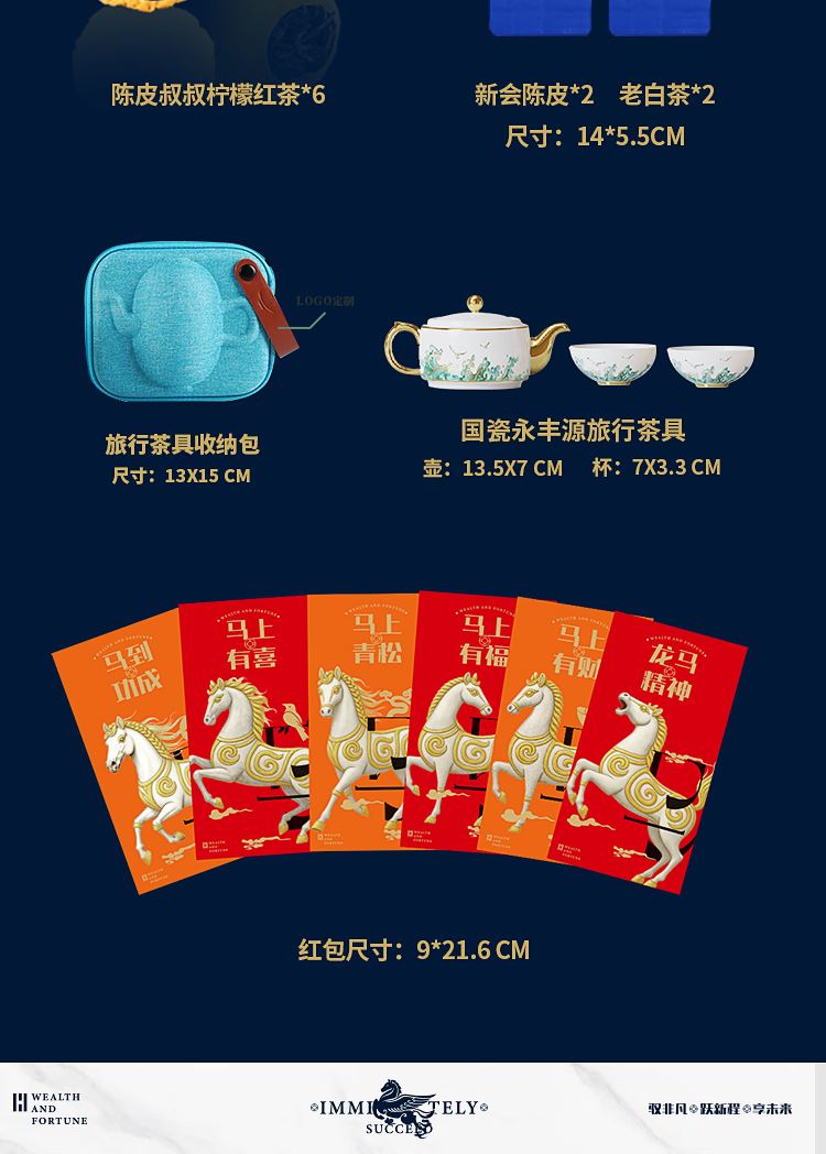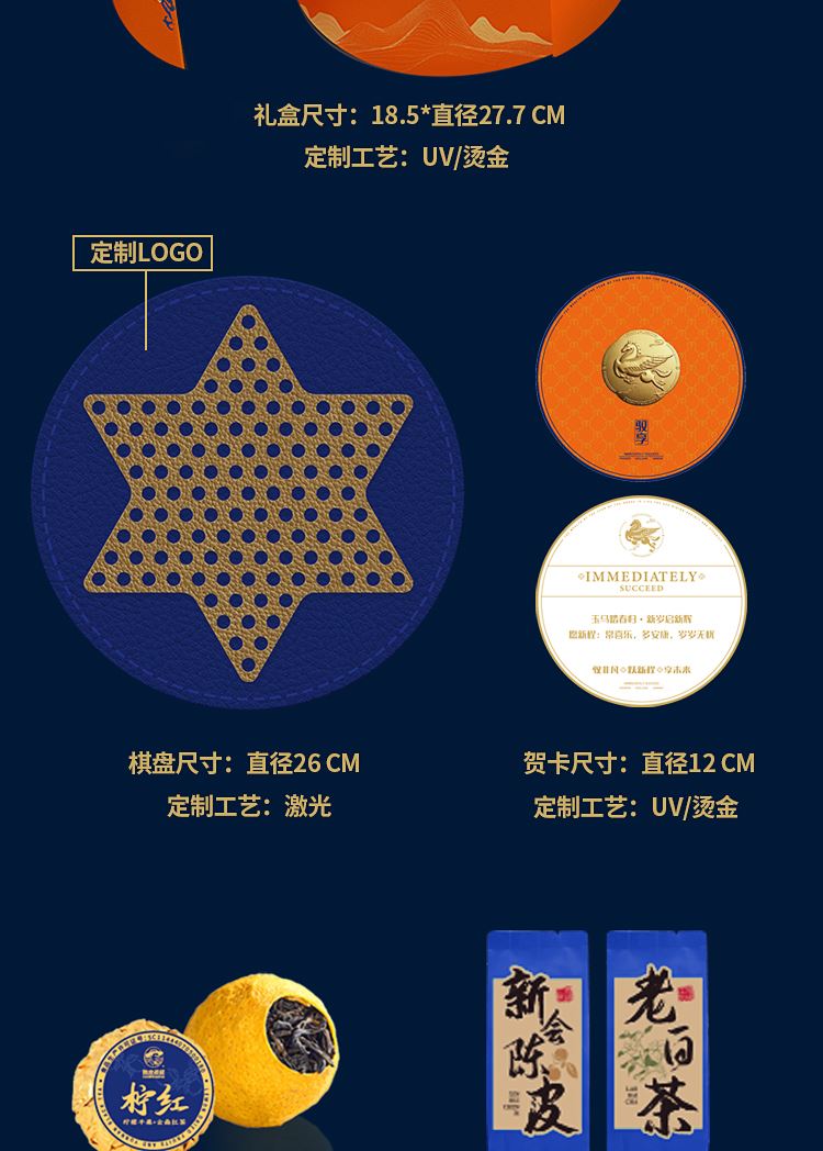 礼品配置清单: 双层主题礼盒、团圆皮革棋盘、马头棋子、精品柠檬古树红茶*6颗 、永丰源陶瓷快客茶具一壶二杯组合、 老白茶*2盒、新会陈皮*2盒