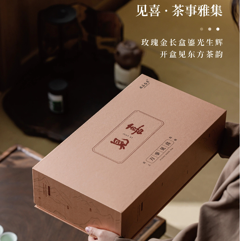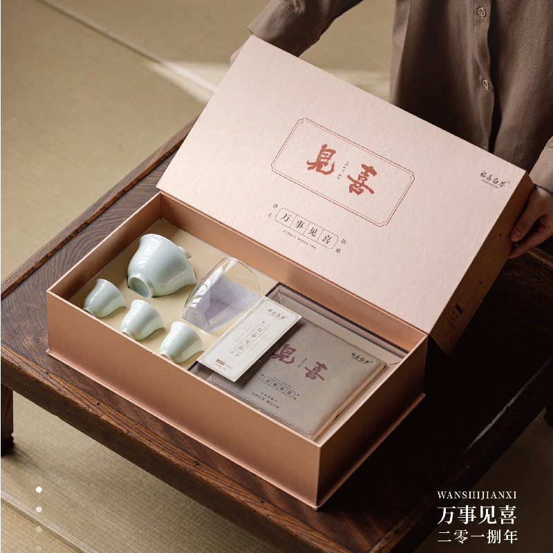 内含2018年福鼎白茶一级寿眉250g,陶瓷盖碗1个,公道杯1个,品茗杯3个。万事见喜。喜上眉梢。有茶有器。礼有心意。礼盒采用玫瑰金熠熠生辉,开盒见东方茶韵。搭配2018年一级寿眉,采用松压工艺,充分的保持了茶叶的完整度。口感醇润甘甜,一份用心的礼物定制。