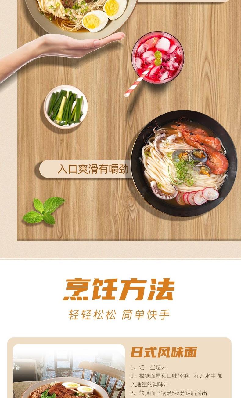 产品规格: 细面 400g*2包 1、42%高加水:口感更爽滑软弹 2、360°真空揉:更筋道耐煮 3、35℃仿日晒:面条品质更稳定 4、细条形,面身圆润顺滑, 咀嚼口感软糯Q弹