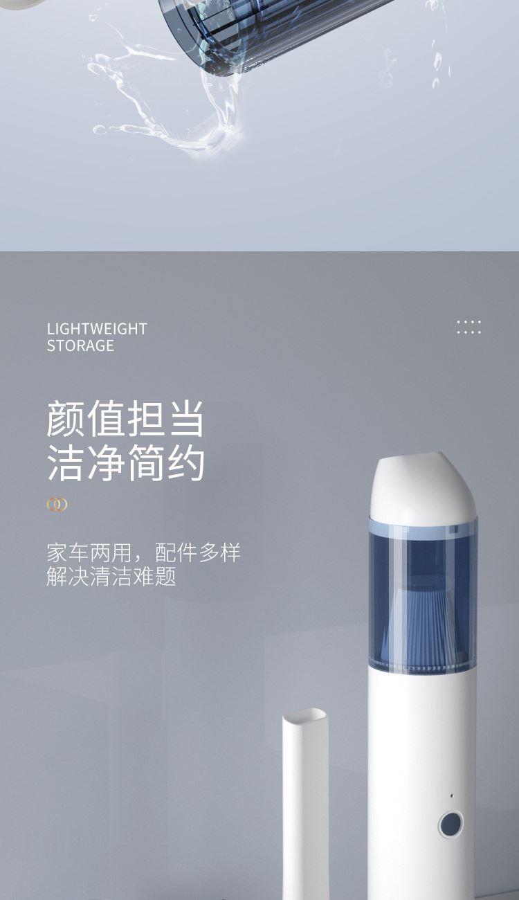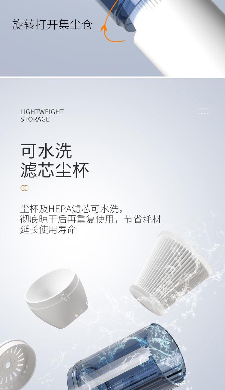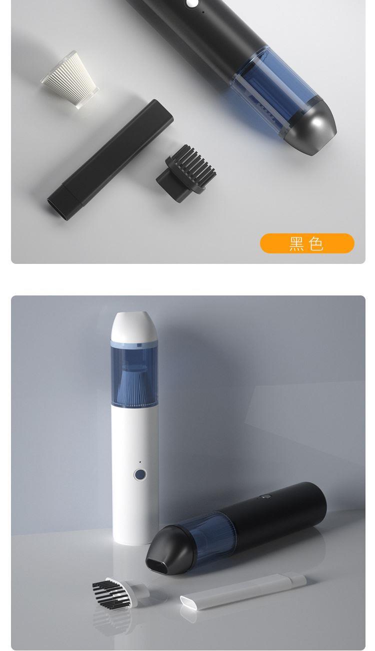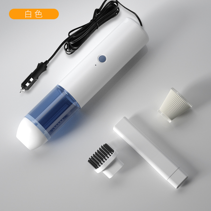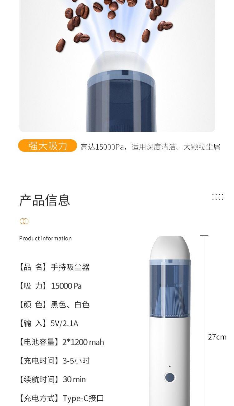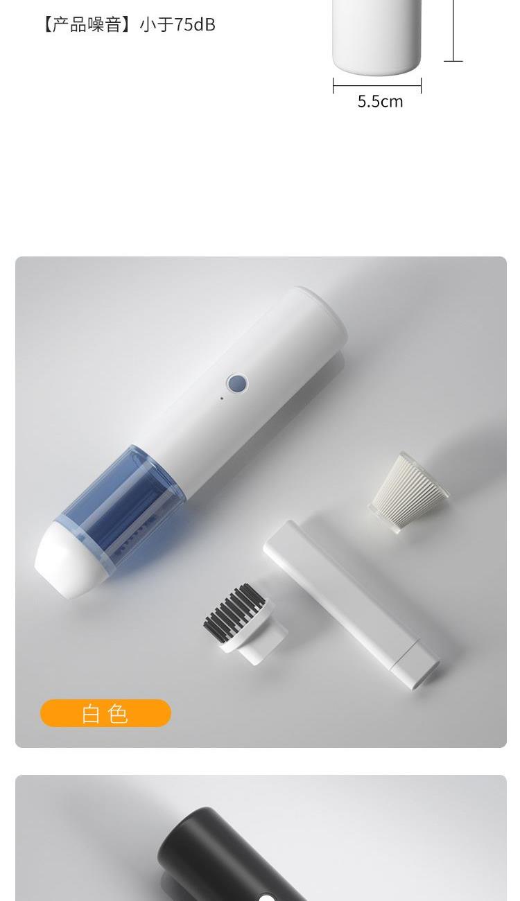 颜色:白色、黑色 供电方式:Type-C充电 电池容量:2600mAh 主机包装:30*13*8cm/490g 外箱尺寸:61*41*54cm/40台/21kg 产品标配:彩盒、主机、说明书、数据线、滤芯、吸尘管 大吸力无线便携,车家两用 大容量集尘仓,可视化设计,倾倒不扬灰 无线便携款/点烟器款可选