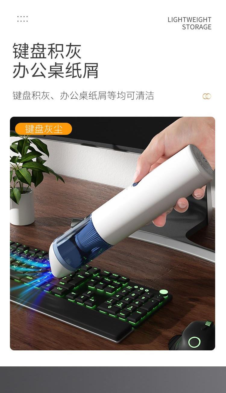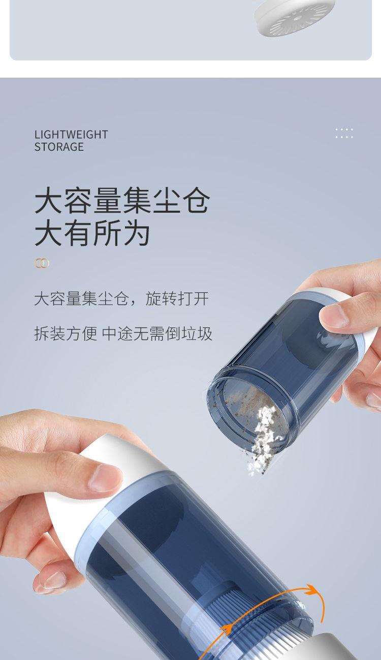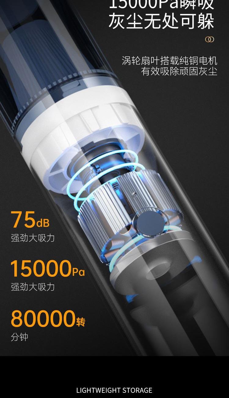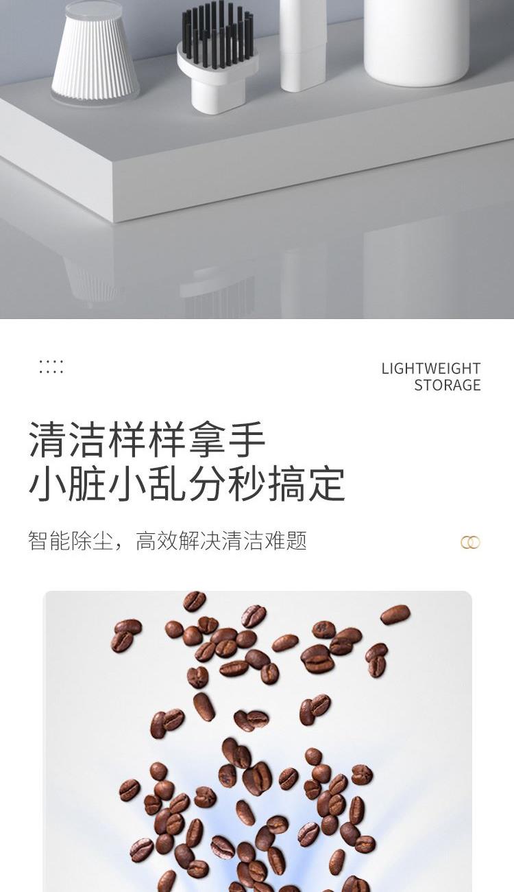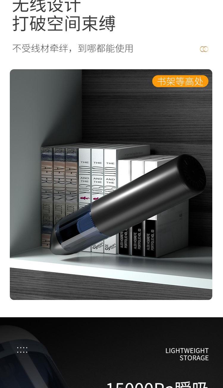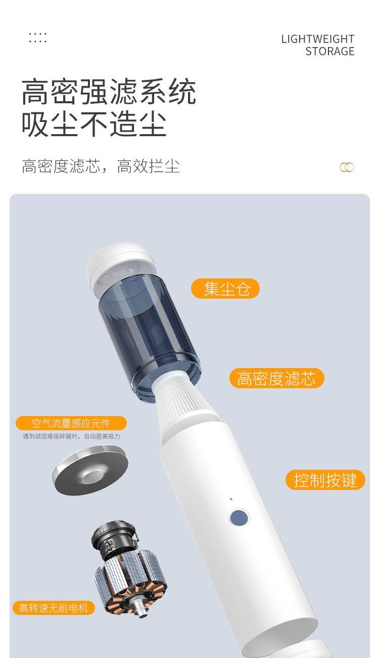 颜色:白色、黑色 供电方式:Type-C充电 电池容量:2600mAh 主机包装:30*13*8cm/490g 外箱尺寸:61*41*54cm/40台/21kg 产品标配:彩盒、主机、说明书、数据线、滤芯、吸尘管 大吸力无线便携,车家两用 大容量集尘仓,可视化设计,倾倒不扬灰 无线便携款/点烟器款可选