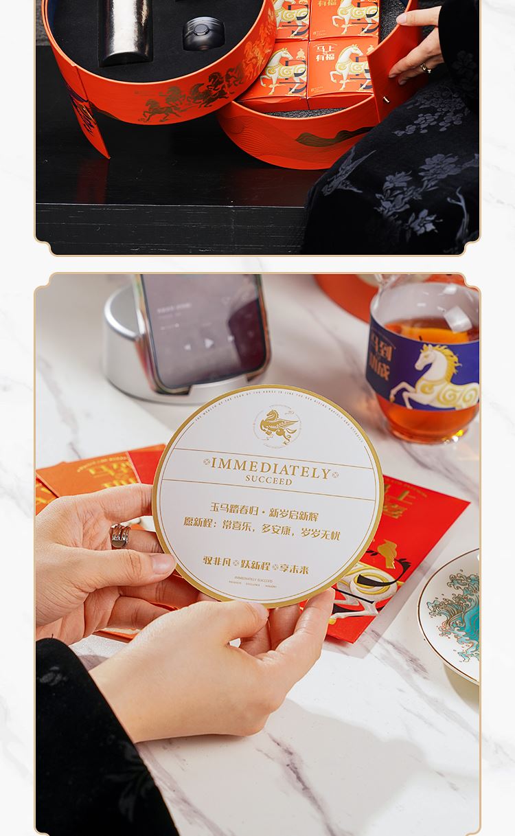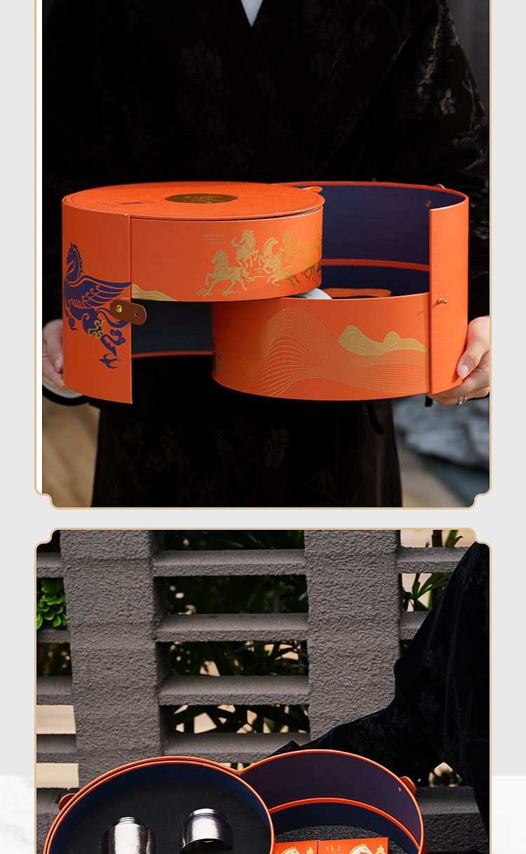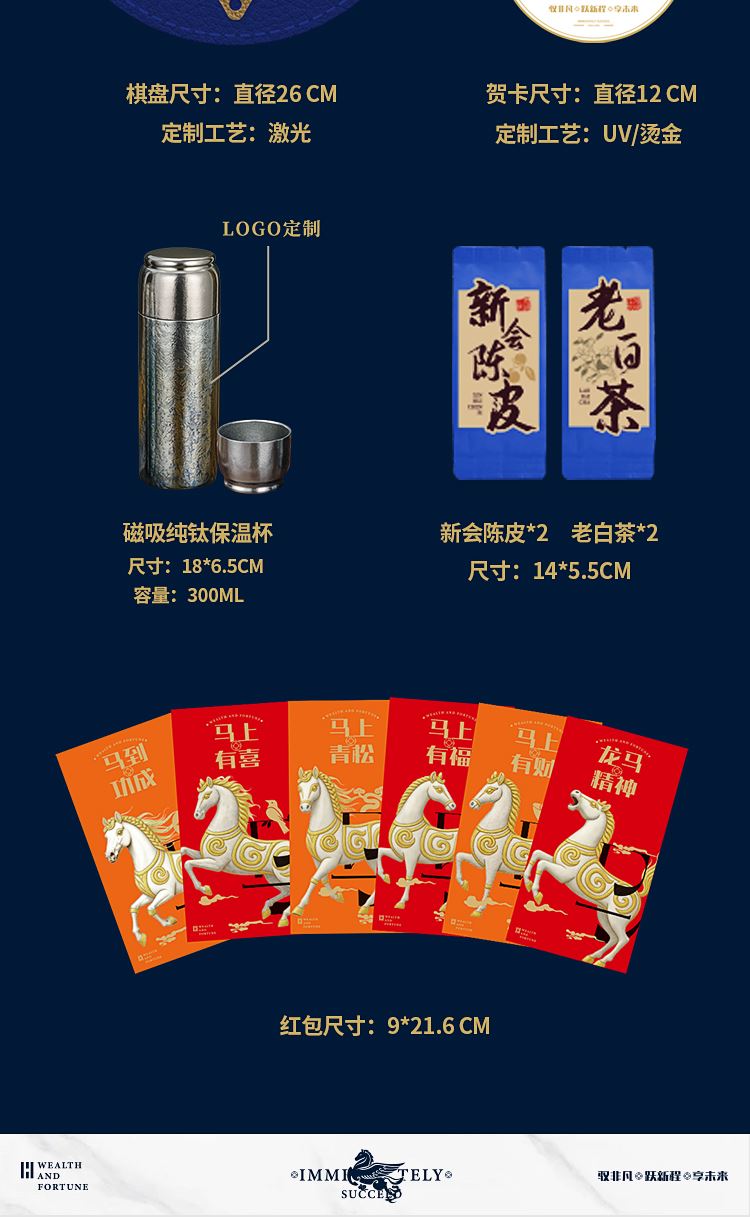 礼品配置清单: 双层主题礼盒、团圆皮革棋盘、马头棋子、磁吸纯钛保温杯*1、老白茶*2盒、新会陈皮*2盒