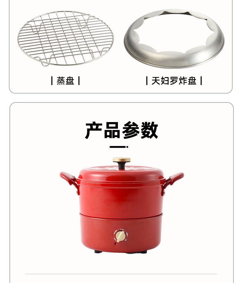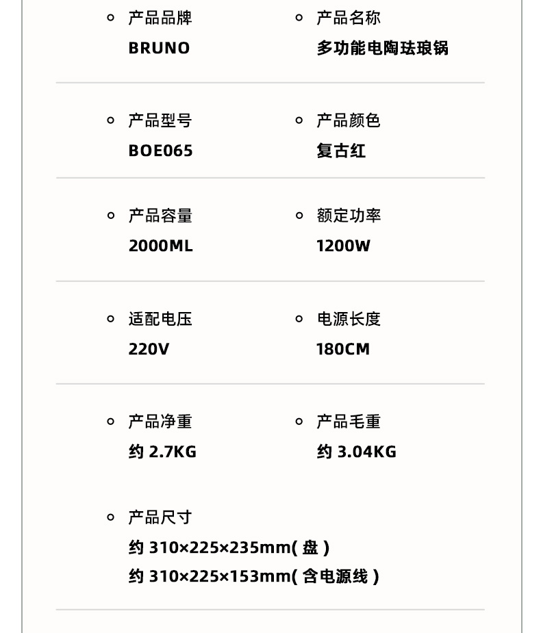 产品型号:BOE065 产品颜色:复古红 产品容量:2000ML 额定功率:1200W 产品净重:约2.7KG 产品毛重:约3.04KG 产品尺寸:约产品尺寸:约310*225*235mm(盘),约310*225*153mm(含电源线) 包装尺寸:约290*270*275mm