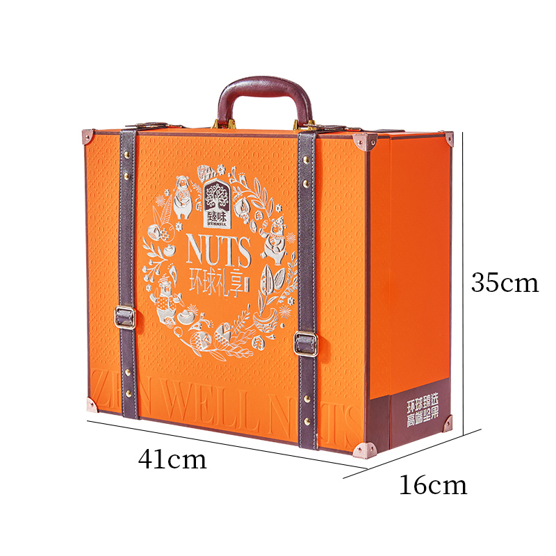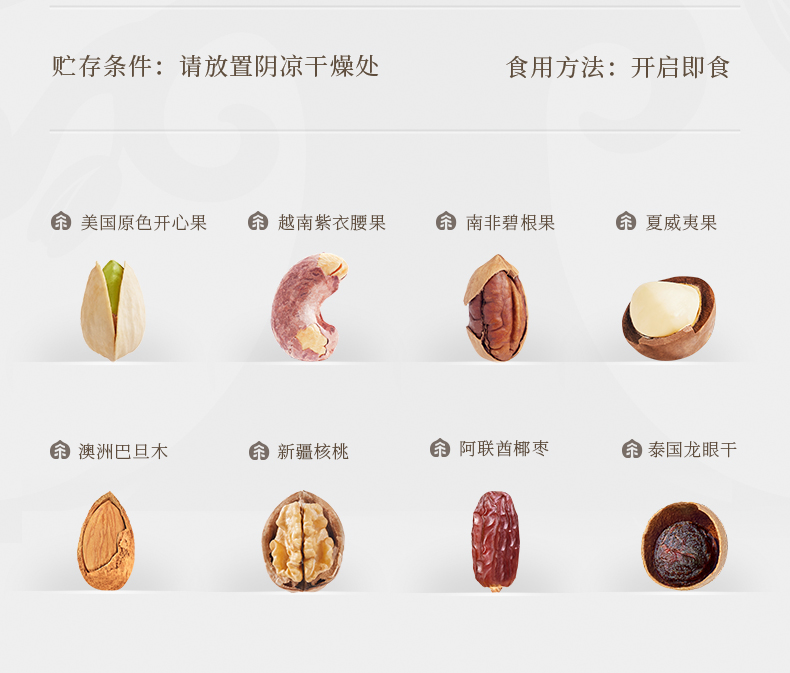 100g美国原色开心果*1 100g越南紫衣腰果*1 100g南非碧根果*1 100g澳洲巴旦木*1 100g夏威夷果*1 200g新疆核桃*1 100g智利蔓越莓干*1 220g印尼椰脆*1 200g泰国芒果干*1 300g菲律宾黄蕉干*1 300g泰国龙眼干*1 200g智利汤姆森提子干*1 450g阿联酋椰枣*1 环球礼享,臻选全球每一颗果粒。礼盒采用时尚手提箱设计,烫金工艺配以反差的色彩元 素,彰显时尚、典雅的风格 净含量:2470g,内配6种坚果,7种果干;内配丰富齐全,是坚果礼盒里具性价的产品。