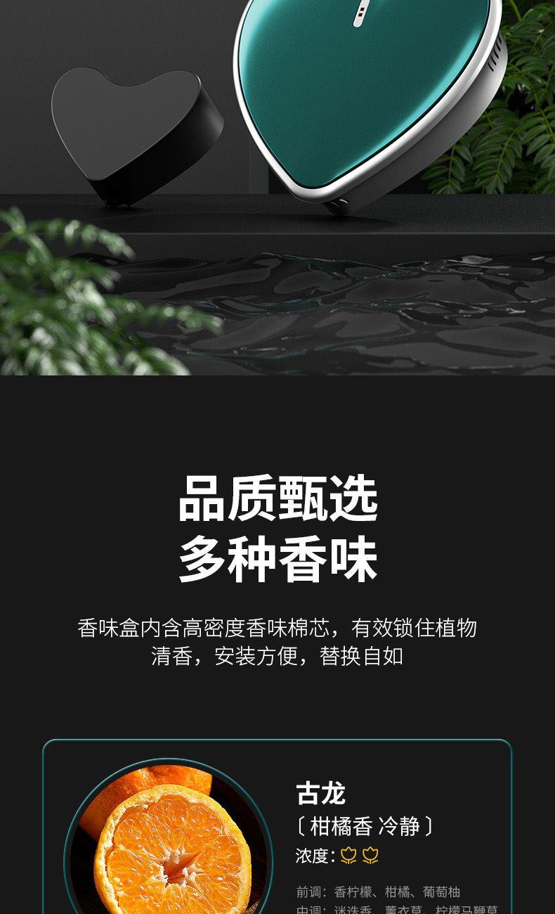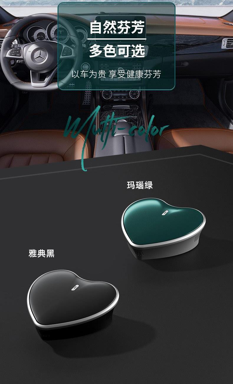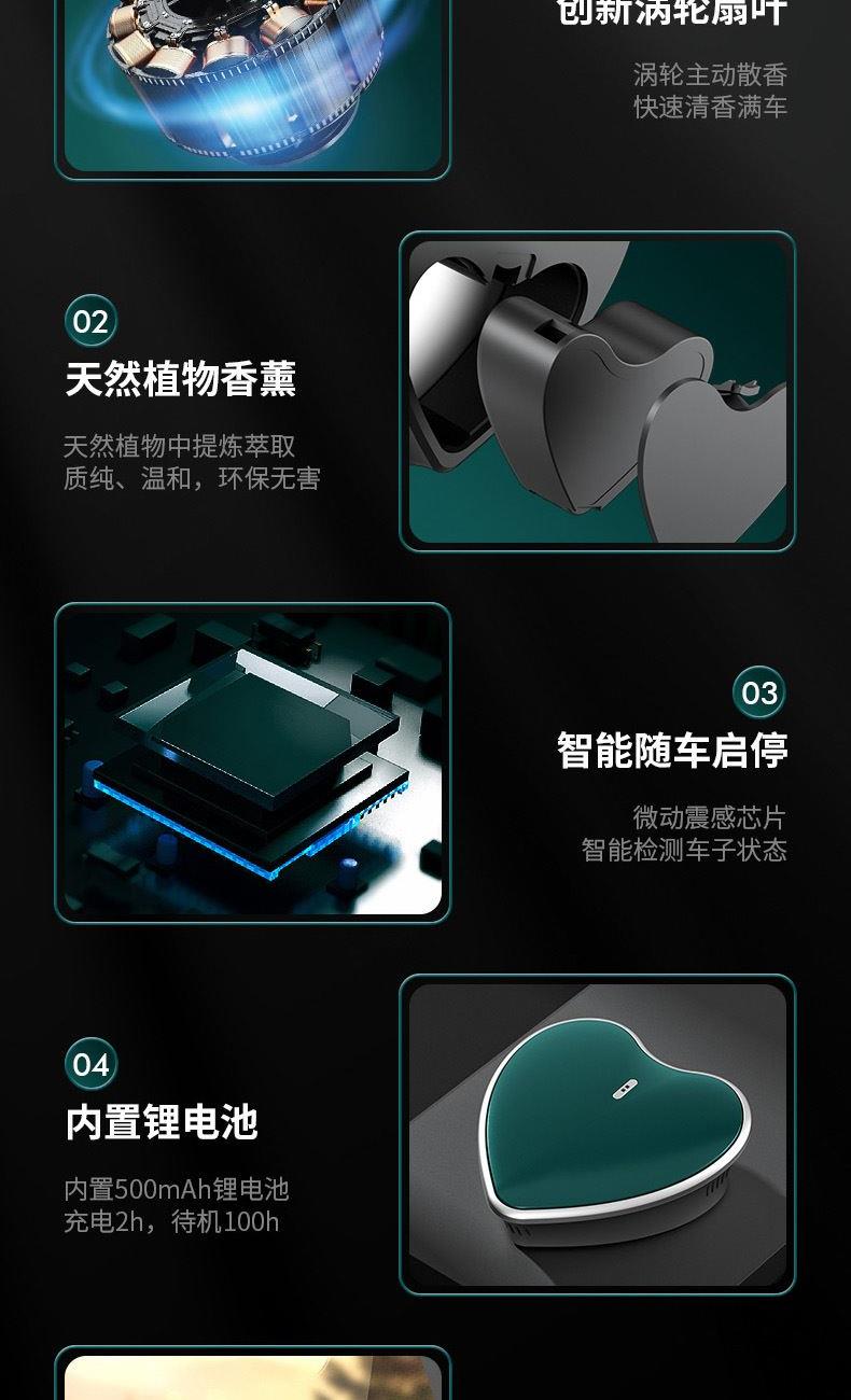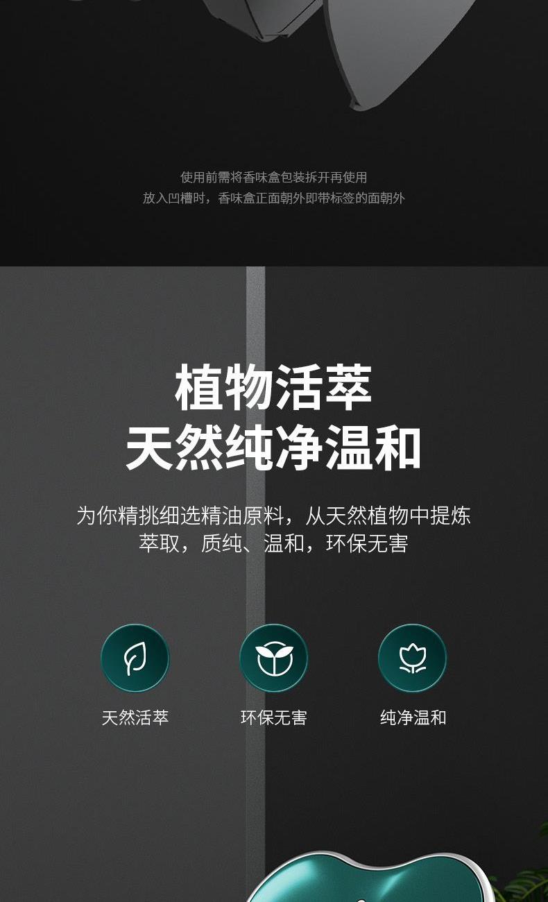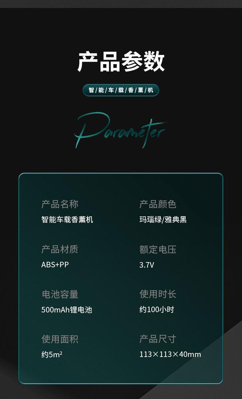 颜色:黑色、绿色 供电方式:Type-C充电 电池容量:500mAh 主机包装:11.5*4.4*12cm/148g 外箱尺寸:57.5*23*50cm/100台/15kg 香膏包装:7*5.8*2cm/31g 香膏外箱:28*28*16cm/100块/3.5kg 产品标配:彩盒、主机、香膏、说明书、数据线 内置震动传感芯片,智能随车启停 内置电池,涡轮扇叶快速主动散香 高强度耐高温机身,可拆卸替换香盒 配纯天然植物活萃植物香膏,安全可靠,母婴可用