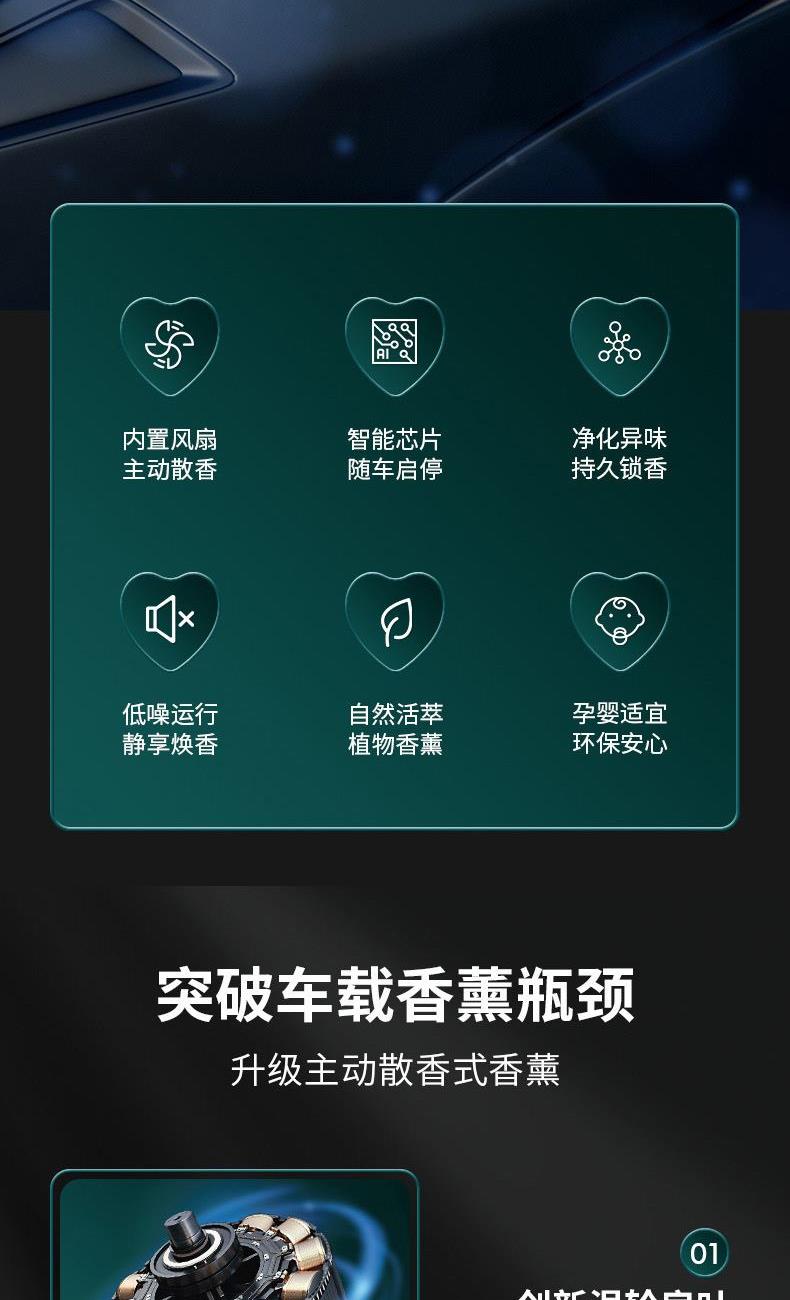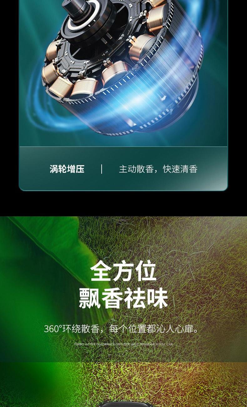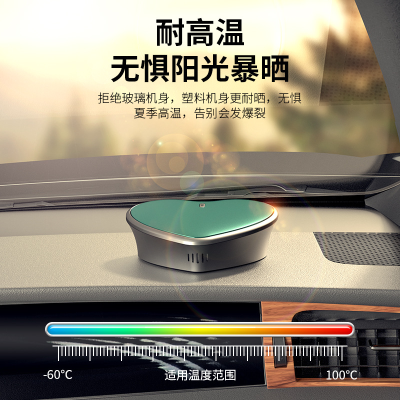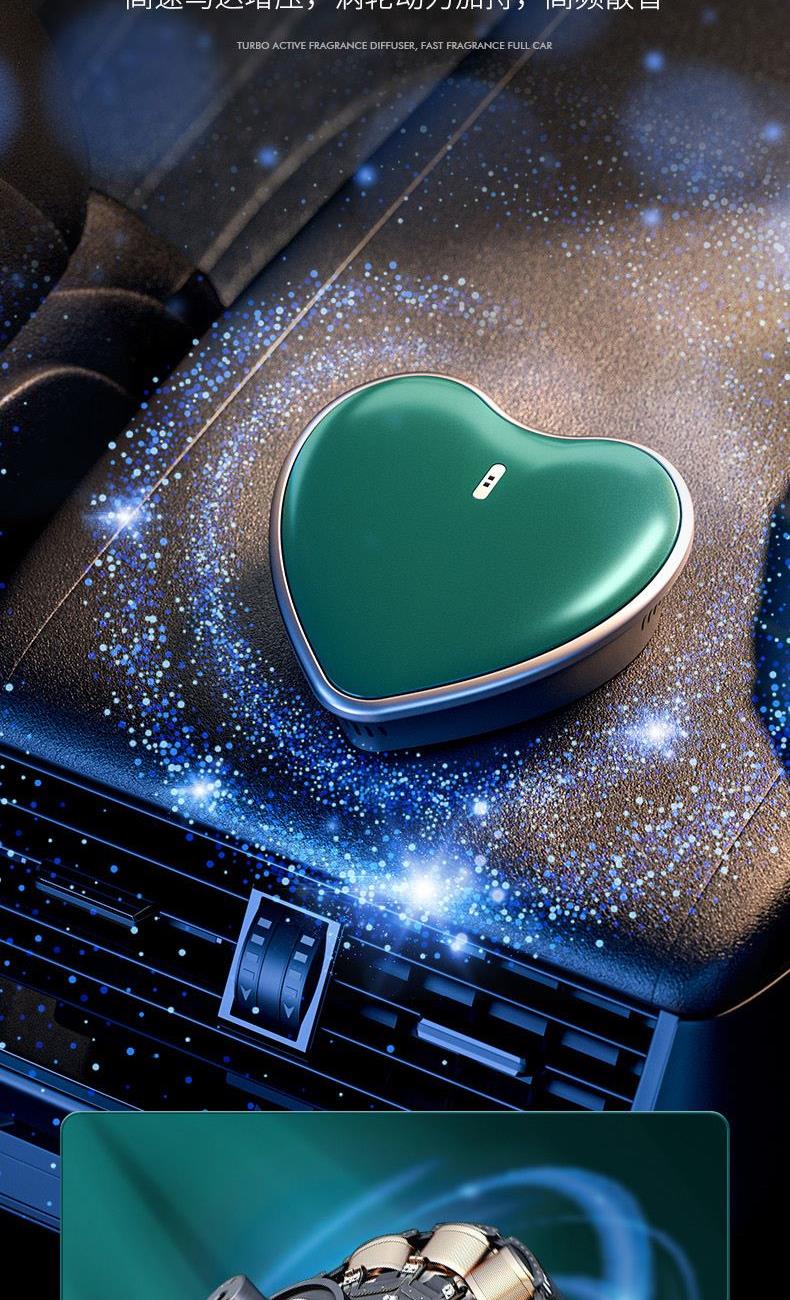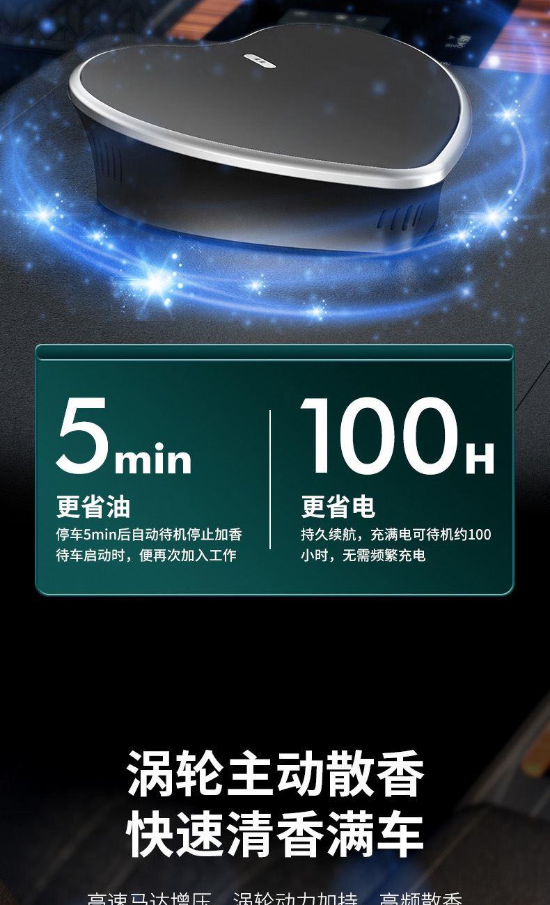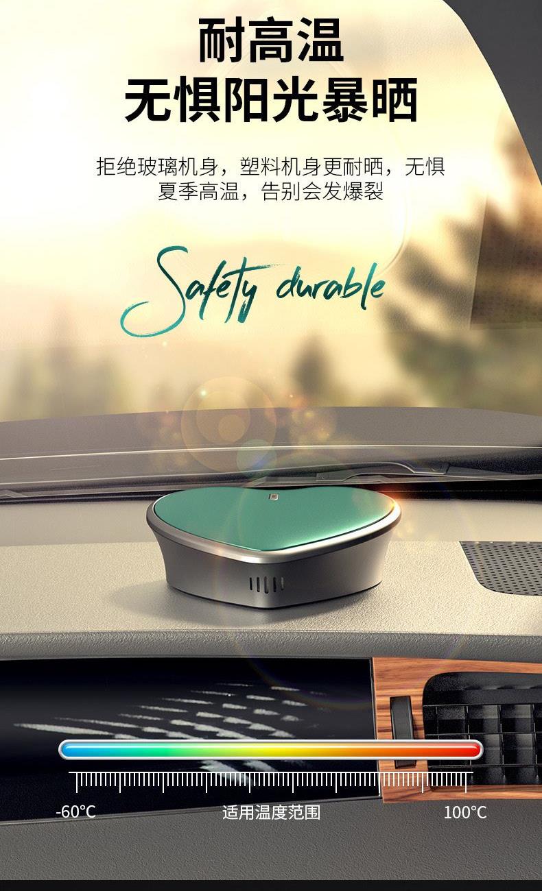 颜色:黑色、绿色 供电方式:Type-C充电 电池容量:500mAh 主机包装:11.5*4.4*12cm/148g 外箱尺寸:57.5*23*50cm/100台/15kg 香膏包装:7*5.8*2cm/31g 香膏外箱:28*28*16cm/100块/3.5kg 产品标配:彩盒、主机、香膏、说明书、数据线 内置震动传感芯片,智能随车启停 内置电池,涡轮扇叶快速主动散香 高强度耐高温机身,可拆卸替换香盒 配纯天然植物活萃植物香膏,安全可靠,母婴可用