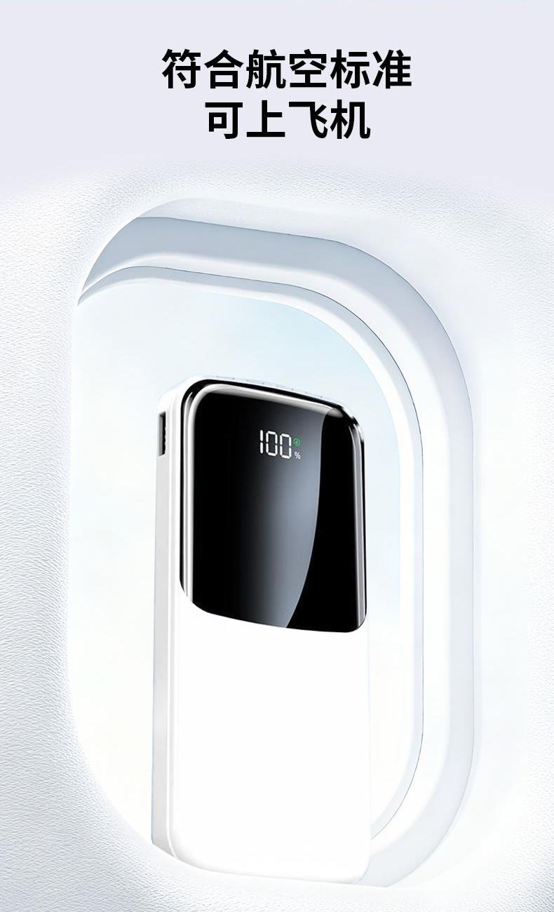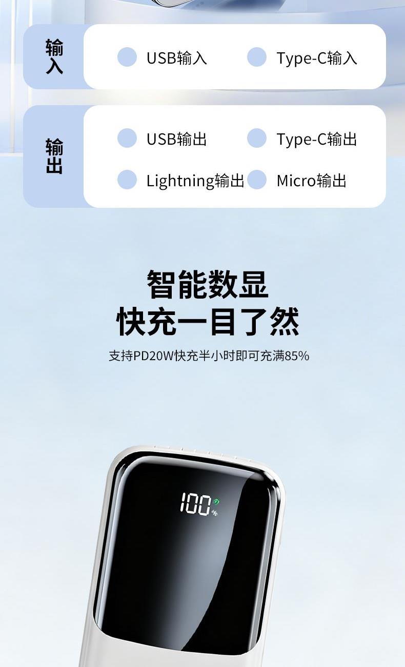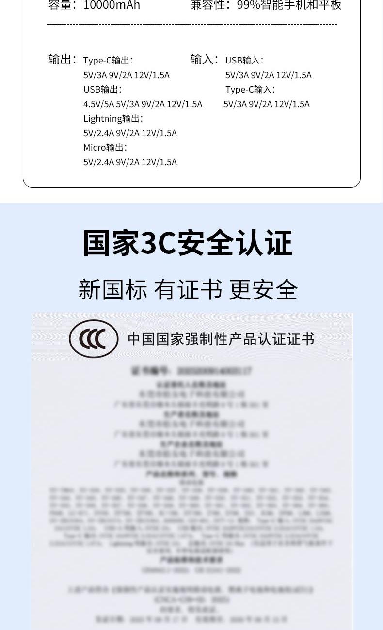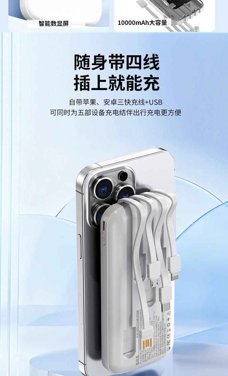 3C认证 电 芯:聚合物电芯 电芯容量:10000mAh USB输 入:5V2A 产品尺寸:148*67.5*21.5mm 产品重量:236g 颜 色:白色 ● 3C认证,10000mAh大容量,3PD超级快充。 ● 极简与舒适并存。 ● 自带四线,TYPE-C口双向快充,无需再另配线。 ● 支持过压,过流,过放,过充,安全性极高,不用担心损坏手机电池。