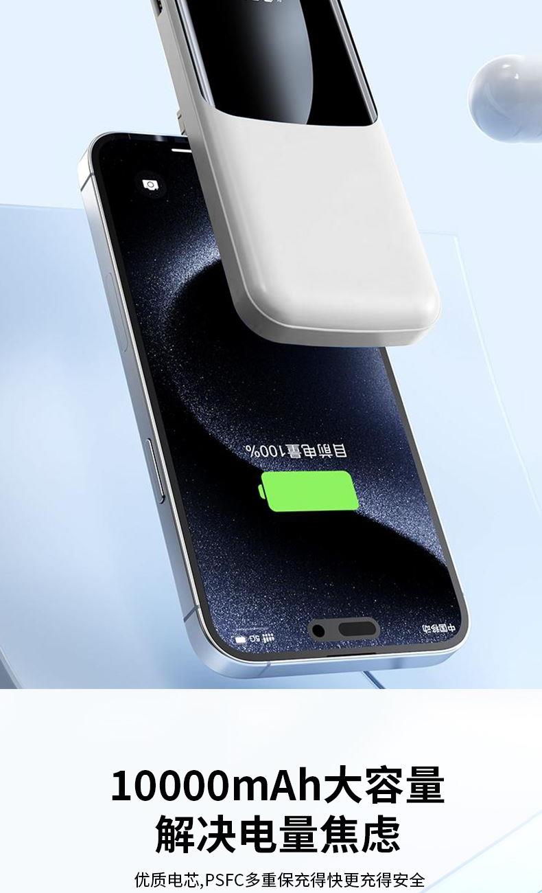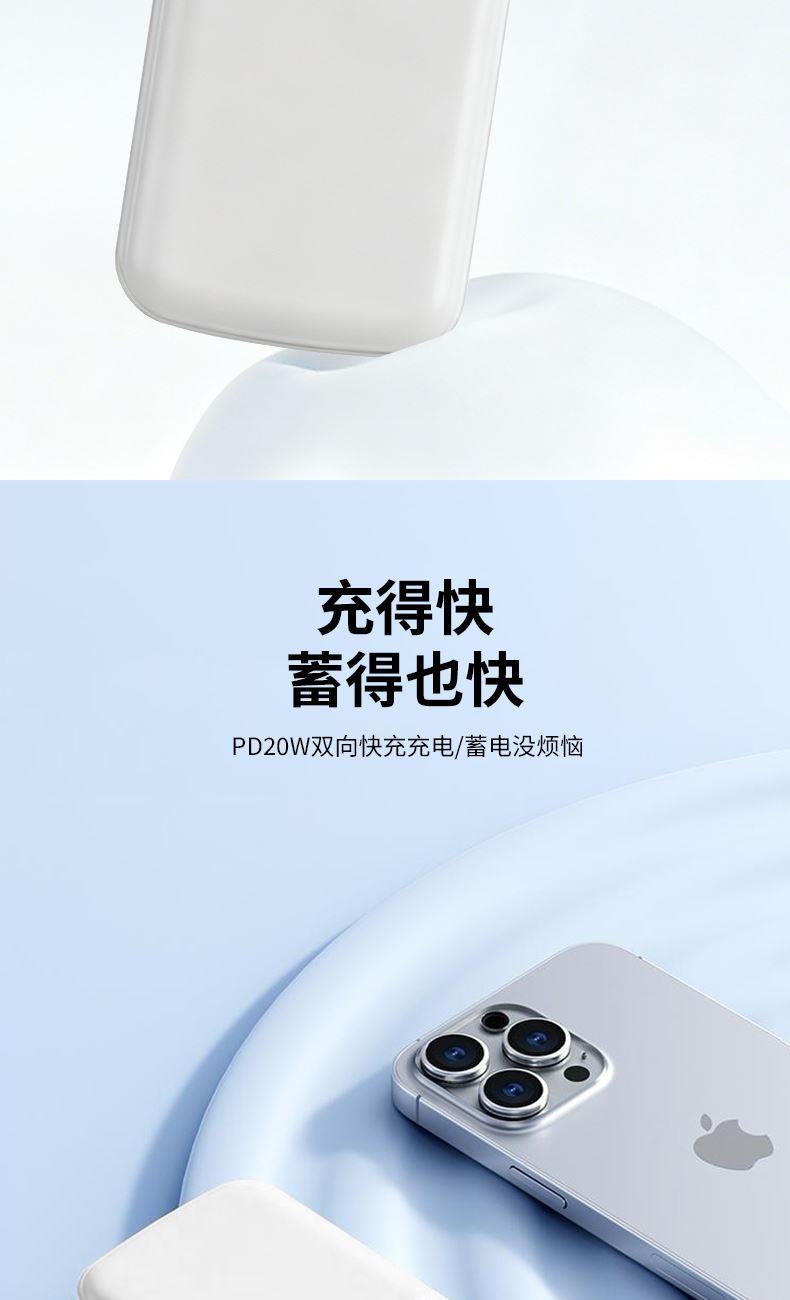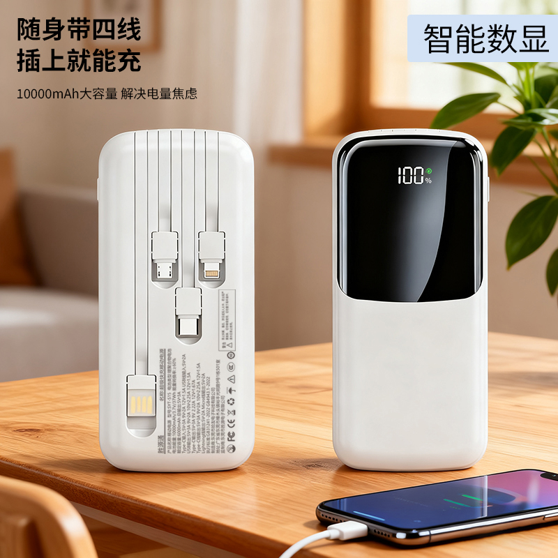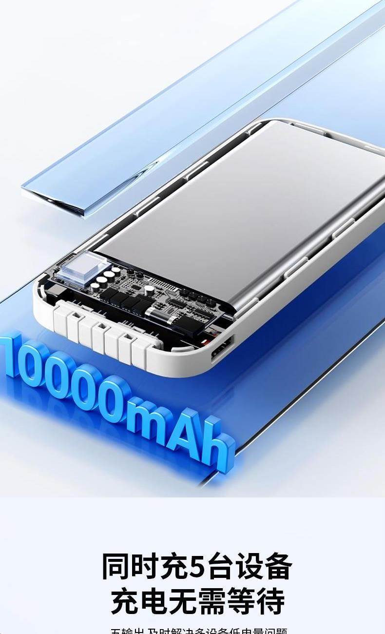 3C认证 电 芯:聚合物电芯 电芯容量:10000mAh USB输 入:5V2A 产品尺寸:148*67.5*21.5mm 产品重量:236g 颜 色:白色 ● 3C认证,10000mAh大容量,3PD超级快充。 ● 极简与舒适并存。 ● 自带四线,TYPE-C口双向快充,无需再另配线。 ● 支持过压,过流,过放,过充,安全性极高,不用担心损坏手机电池。