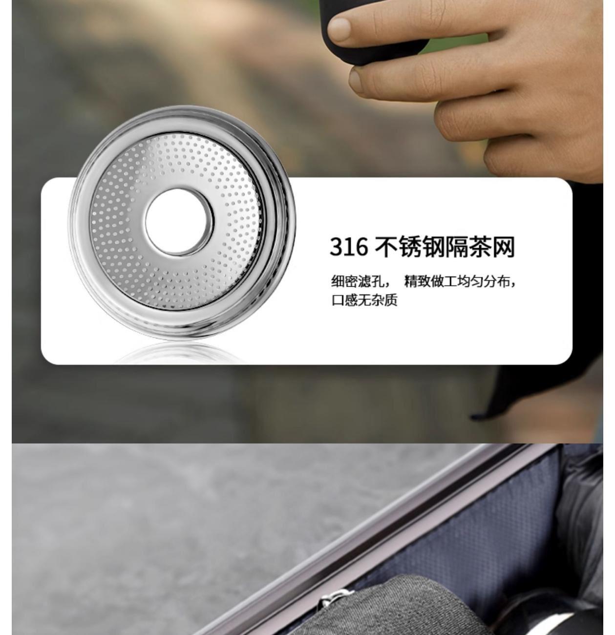 容量:390ML 材质:316不锈钢 1、一体收纳,一壶两杯|双层隔热 2、环保无味,长效保温,收纳便携,防震耐压,出行无负担 3、内置茶隔,任何角度自如倒茶吐茶不吐叶,出水流畅 4、316 不锈钢隔茶网,细密滤孔,精致做工均匀分布,口感无杂质 5、内胆一体设计,便于清洗