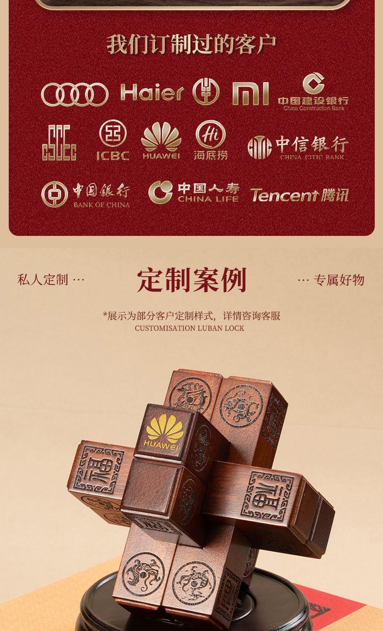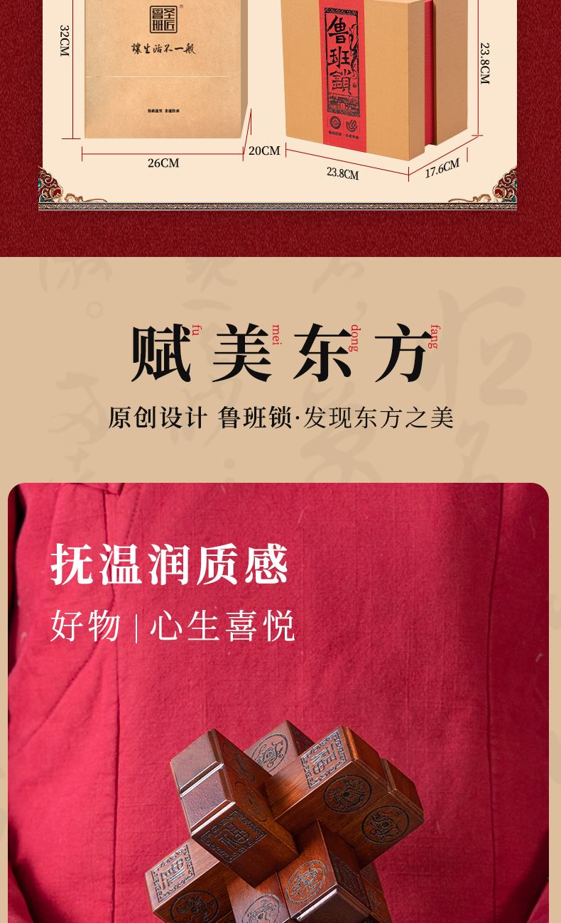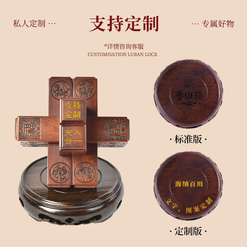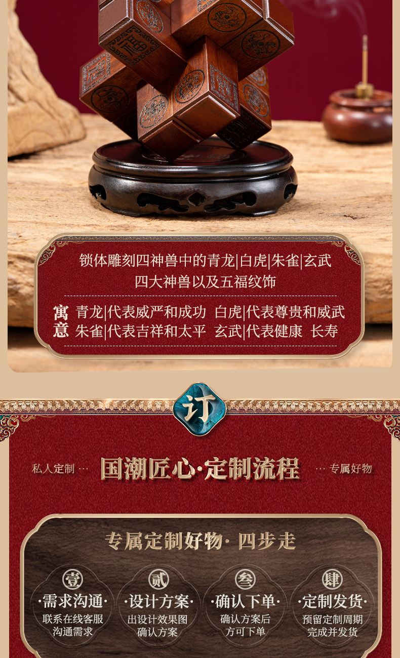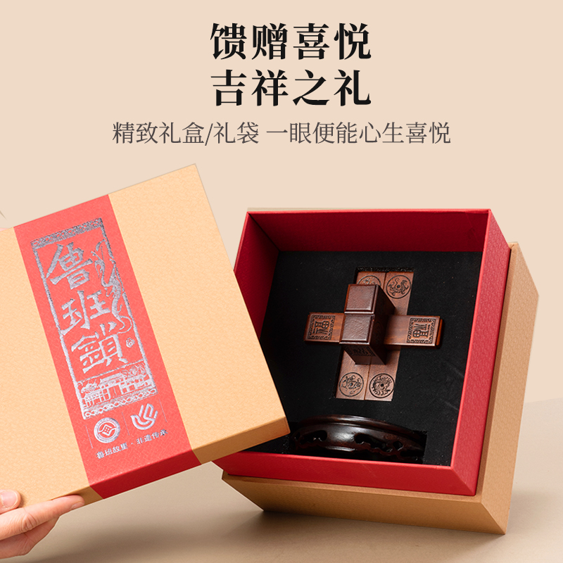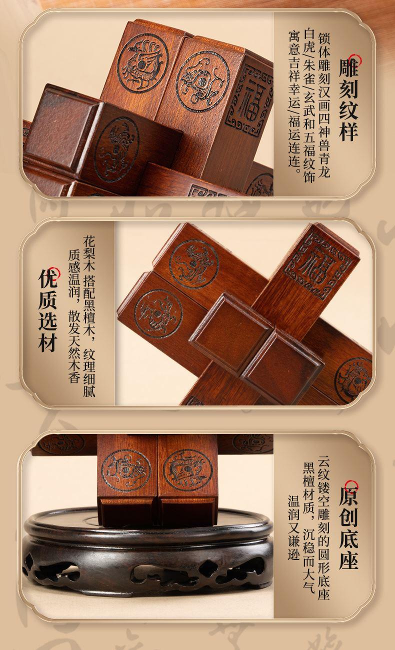 材质:花梨木、黑檀木 产品规格:128×128×156mm 包装规格:238×238×176mm 来至鲁班故里,非遗文创产品 汉画像石映千古,鲁班巧锁蕴才智。这款汉画纹雕刻鲁班锁沿袭传统六棒结构,精选花梨木锁体,配以黑檀木底座,质地高雅,色泽古雅。采用激光雕刻技艺,巧妙融合汉画像石中四神兽——青龙、白虎、朱雀、玄武及五福图腾,象征幸运、成功与连绵福泽,寓意深远。汉画像石之古朴,与鲁班锁之精巧,相得益彰。置于案头,既能彰显主人高雅品味,又能镇宅纳福,实为收藏与赠礼之佳选,意义非凡。