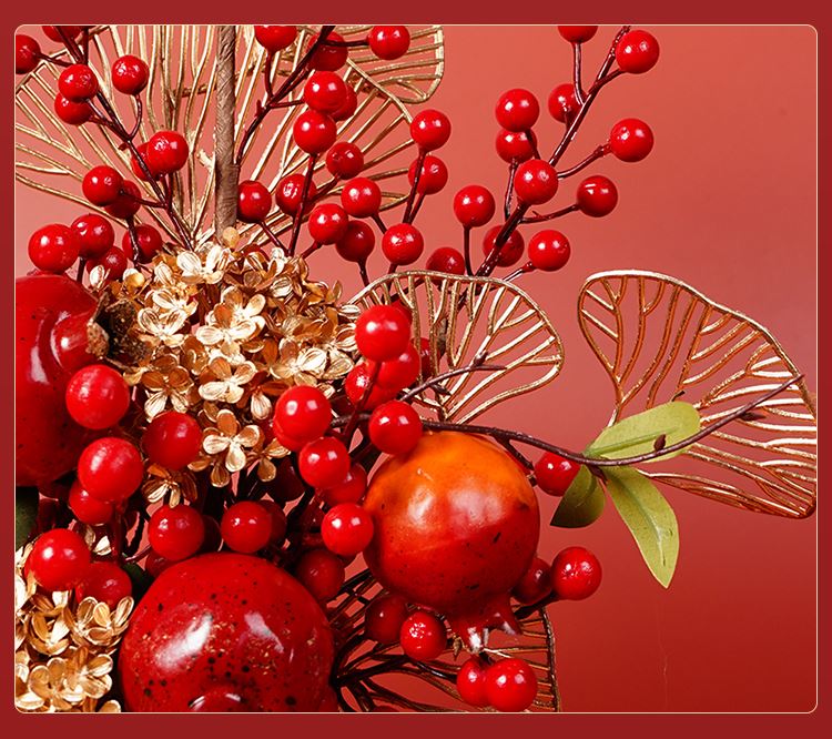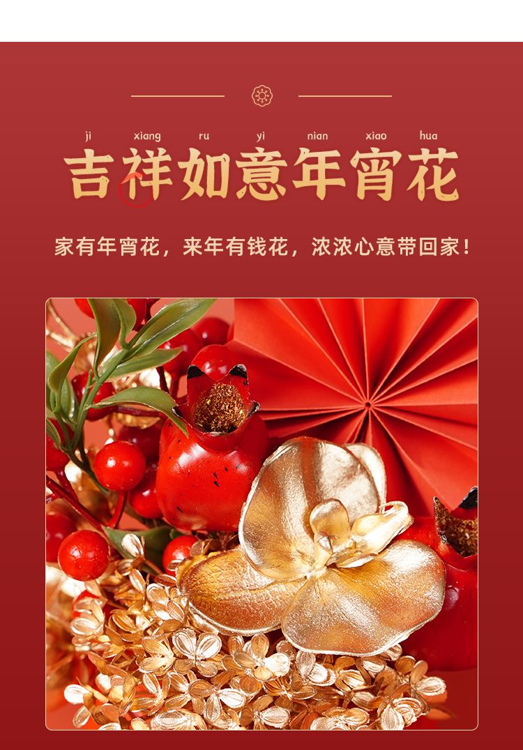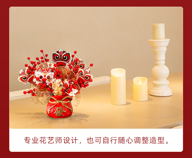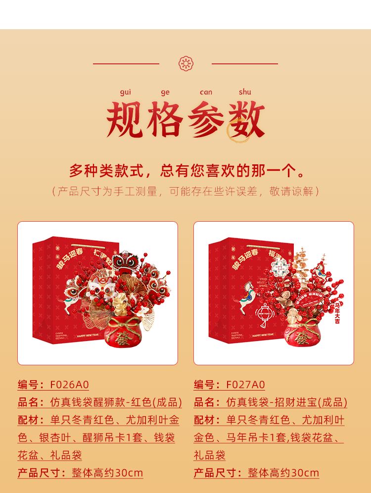 编码:F026A0 规格明细:年宵花高度;高度30cm 材料:单只冬青红色、尤加利叶金色、银杏叶、醒狮吊卡1套、钱袋花盆、礼品袋