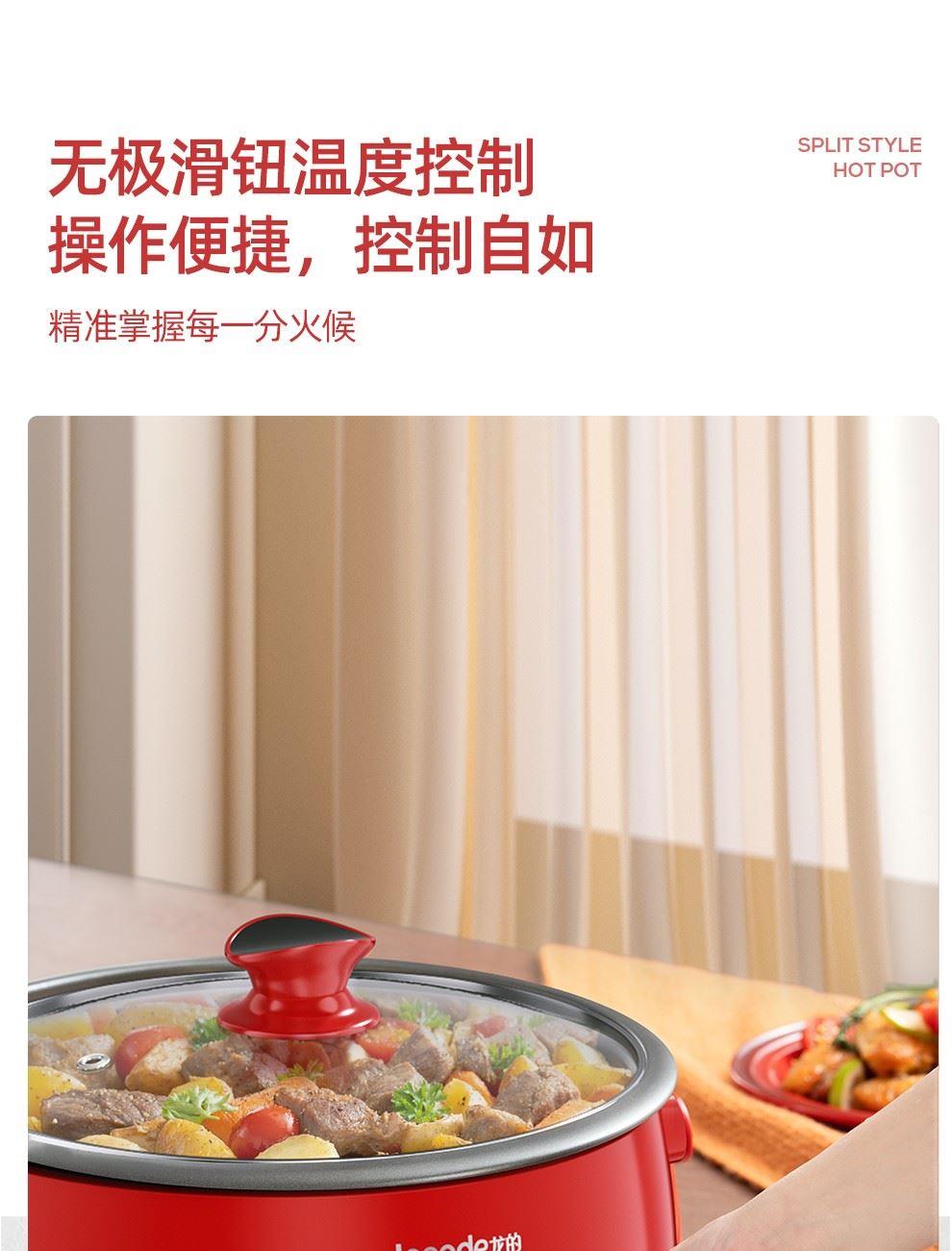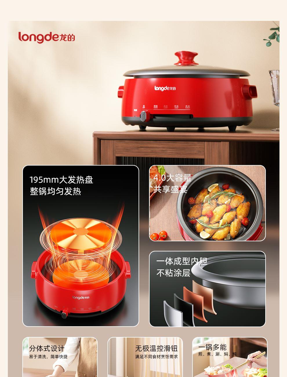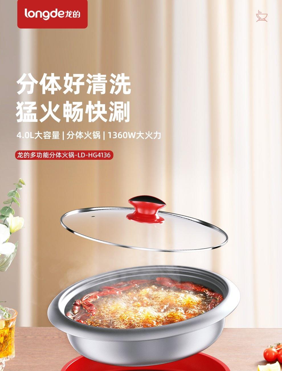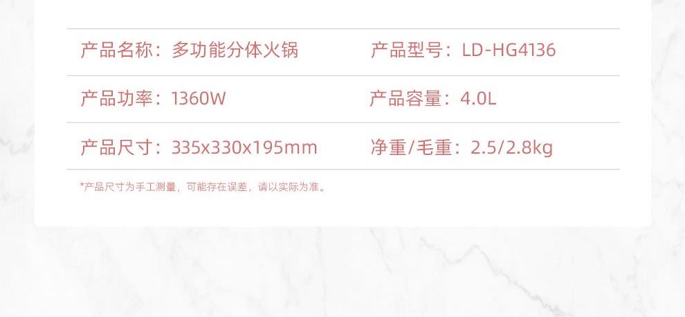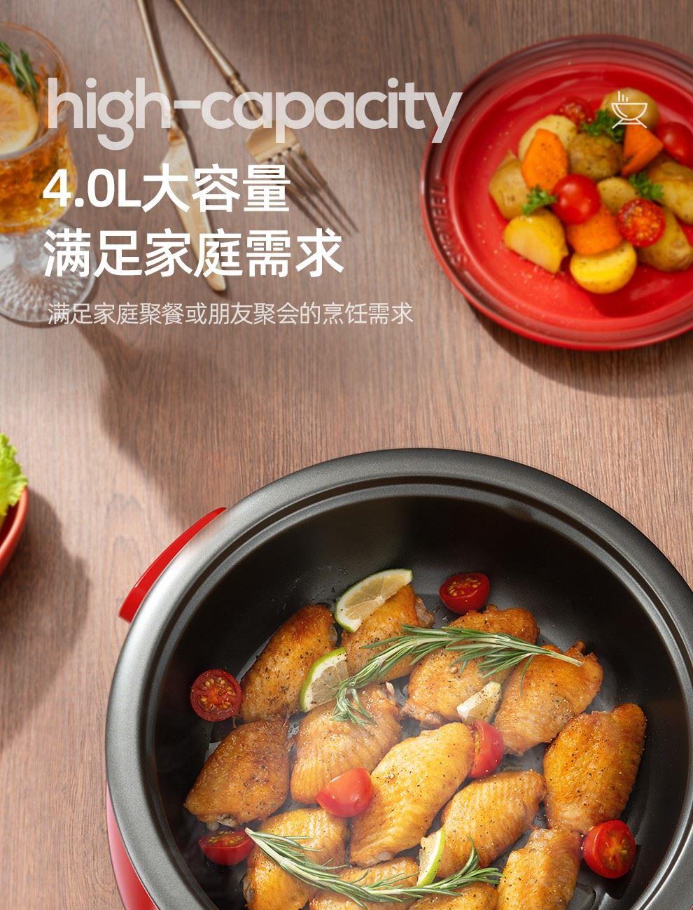 额定功率:1360W 产品容量:4.0L 额定电压:220V~ 产品频率:50Hz 产品净重:2.5kg 产品毛重:2.8kg 整箱重量:18.0kg 分体不粘不粘分体深锅,导热快,易清洗 铝合金发热盘螺纹导热快,发热均匀 可视烹饪不锈钢包边耐高温玻璃上盖 大功率无极调无极温控,调和不同需求